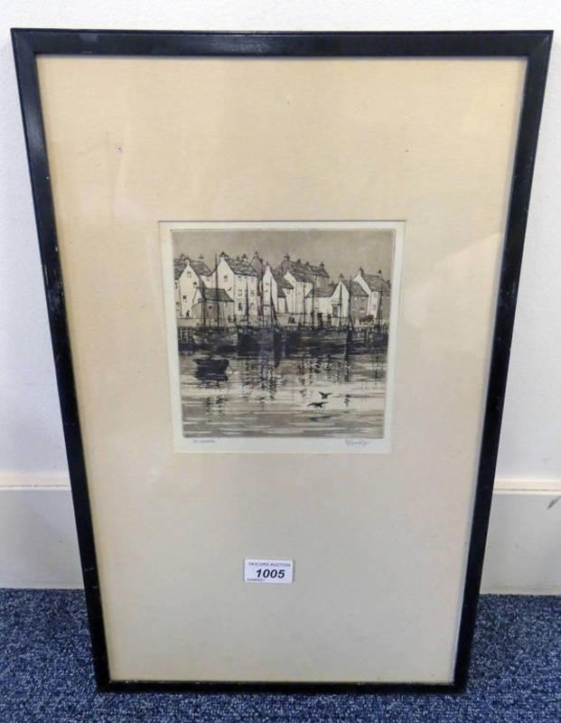 R SHARPLY, ST MONANS, SIGNED, FRAMED ETCHING, 15 X 15 CM