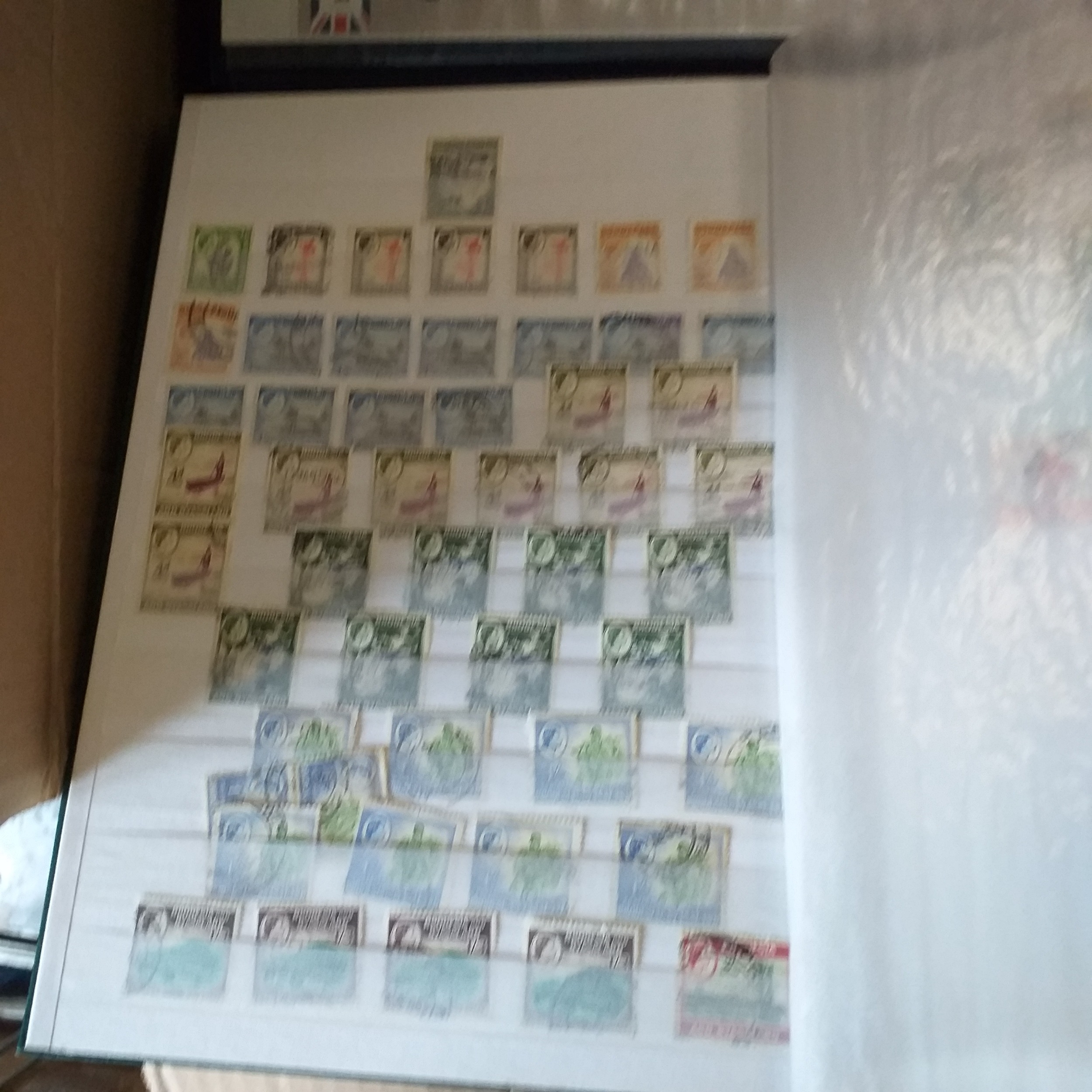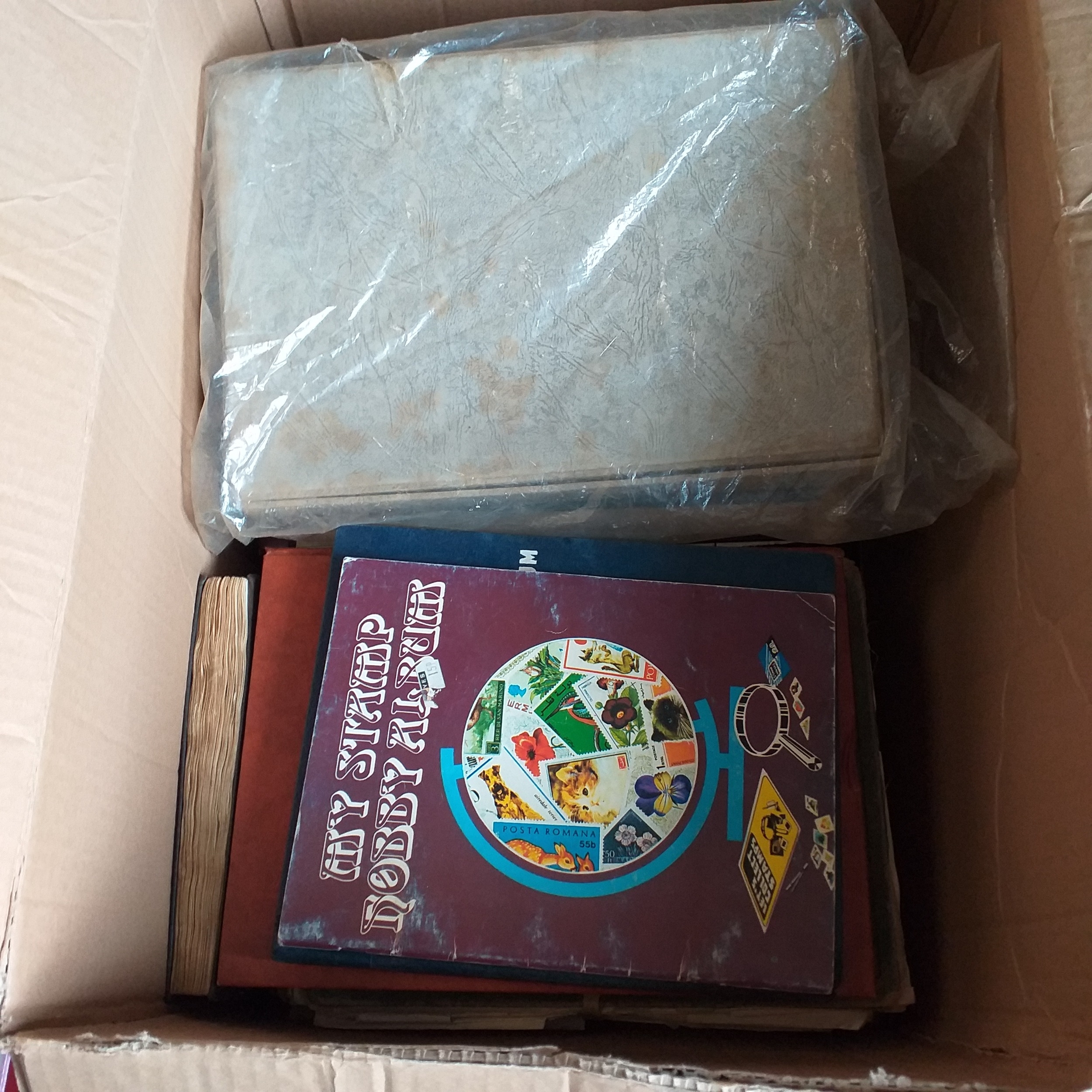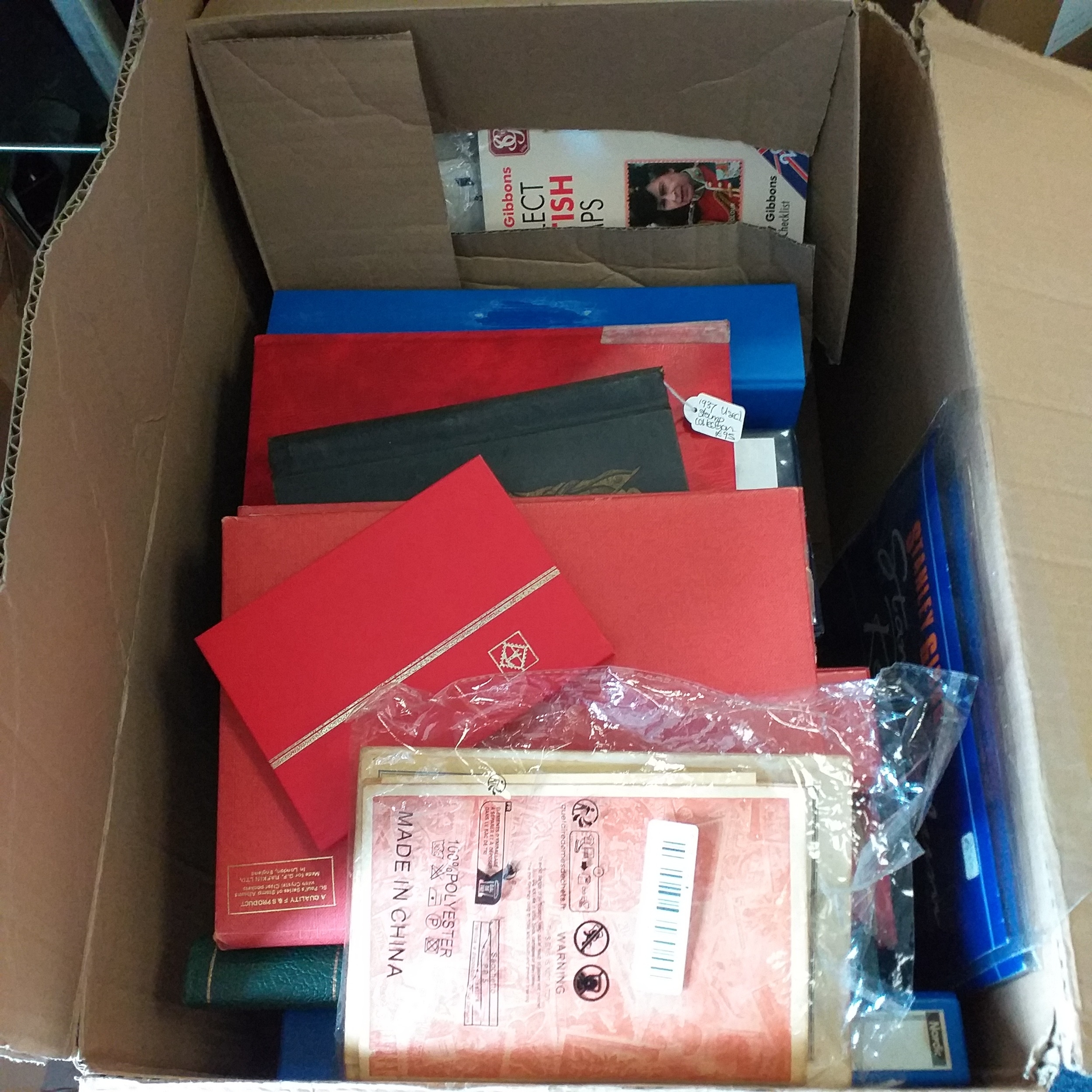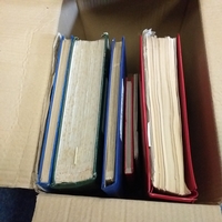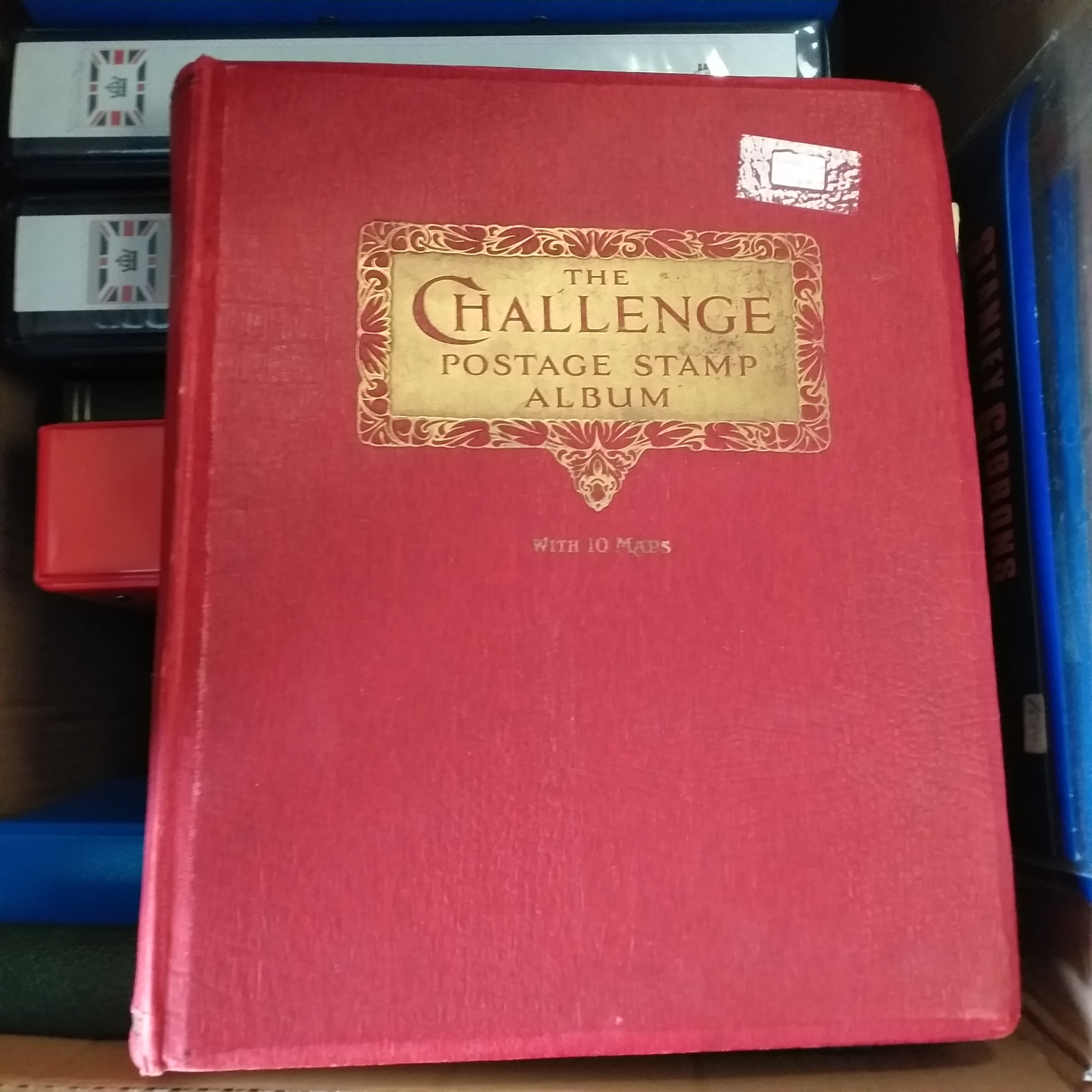 Large box (heavy) of World albums, Includes2 x Britannia Channel Is collections, Album of Commonwealth on Hagners, Lighthouse Europa album, A 1920's large red Rapkin 'The Challenge Postage Stamp Album' (printed pages) (Sparse), 16 page green Lighthouse with Rhodesia/Zimbabwe selection (duplication), 2 ring binder with world on album pages, 2 ring large Lever arch file with sed QE2 GB, 2 packs of SG Senator blank album pages, 4 x empty small albums/stock books, small pack of small childhood collections, Small bx of loose stamps in packet, on leaves and small stockcards.