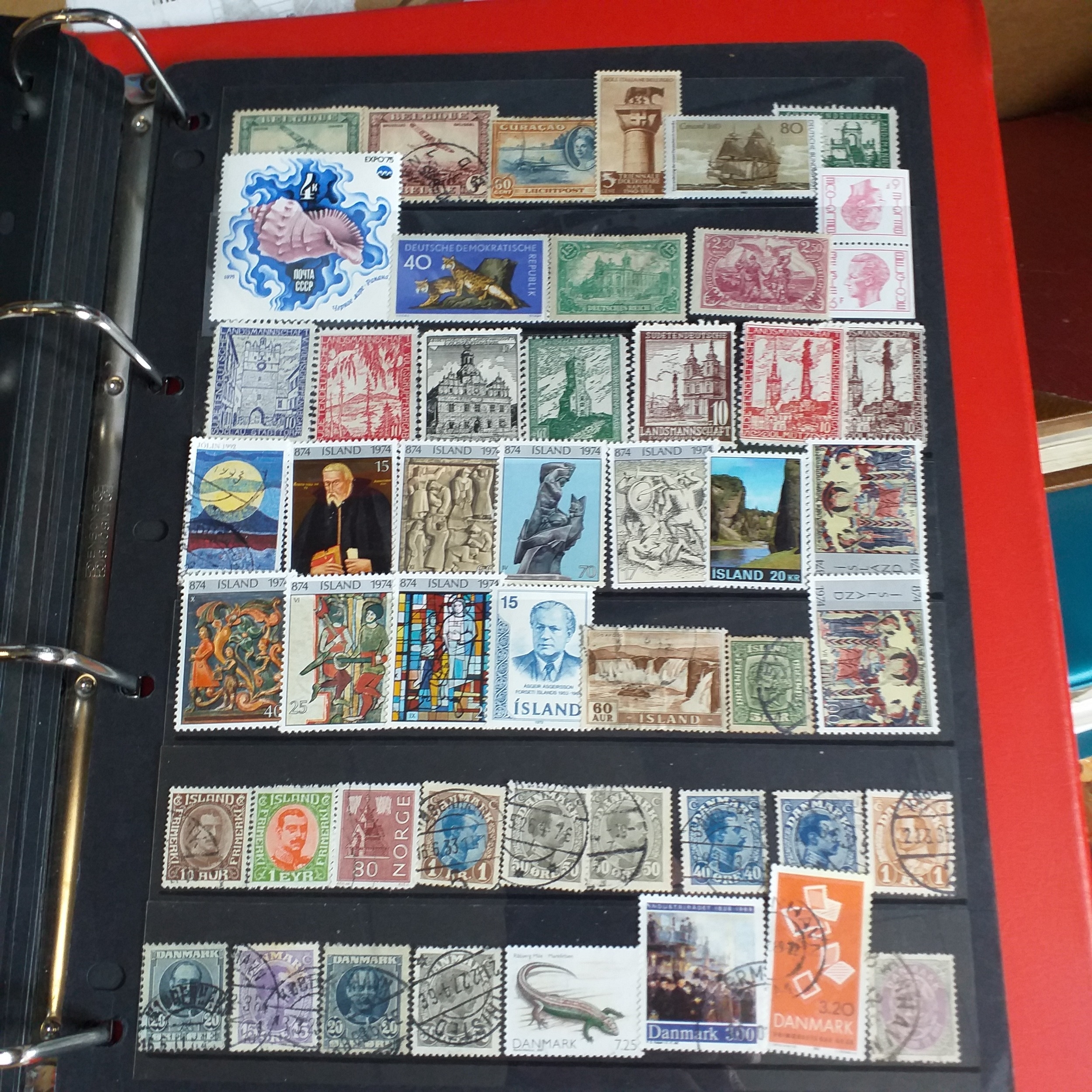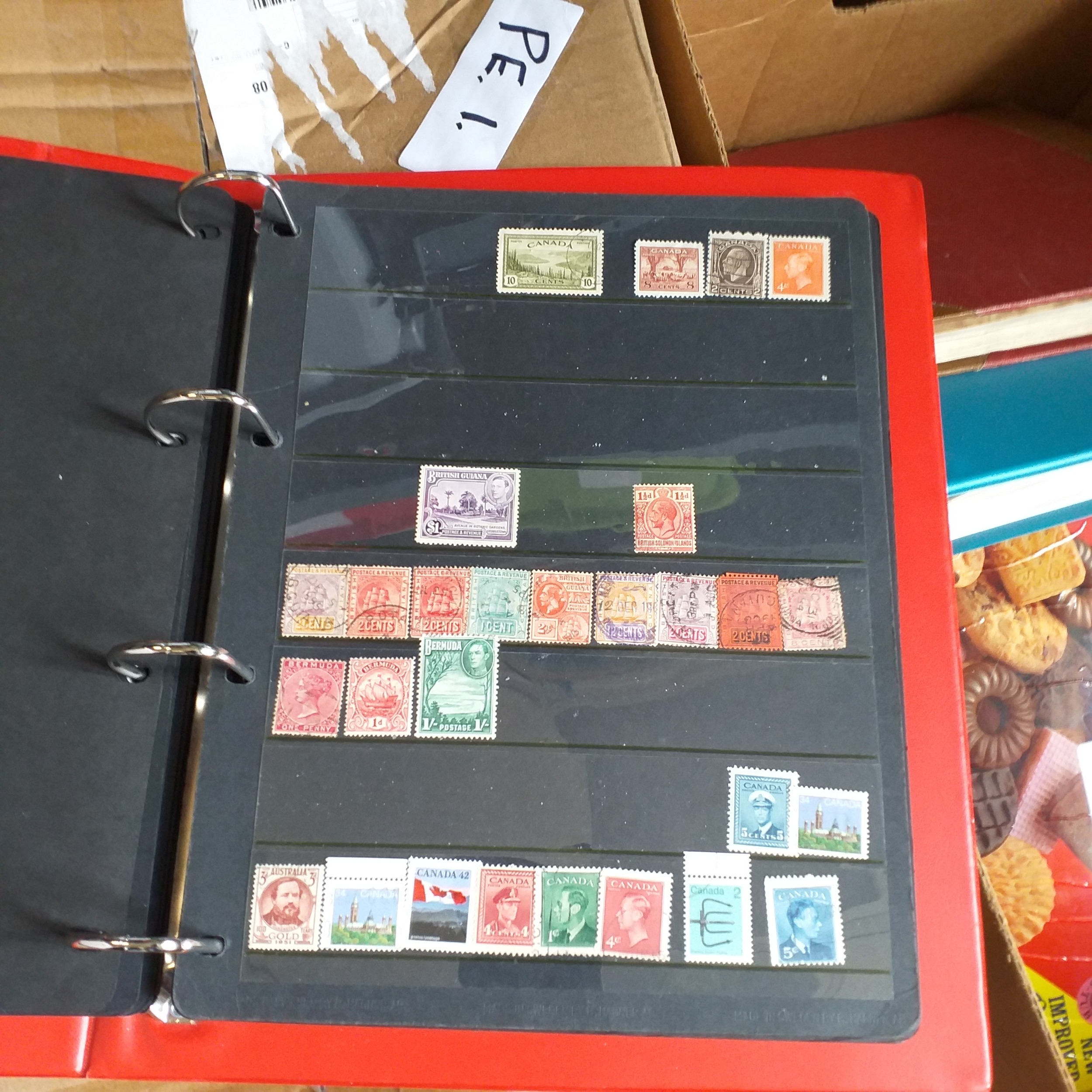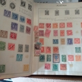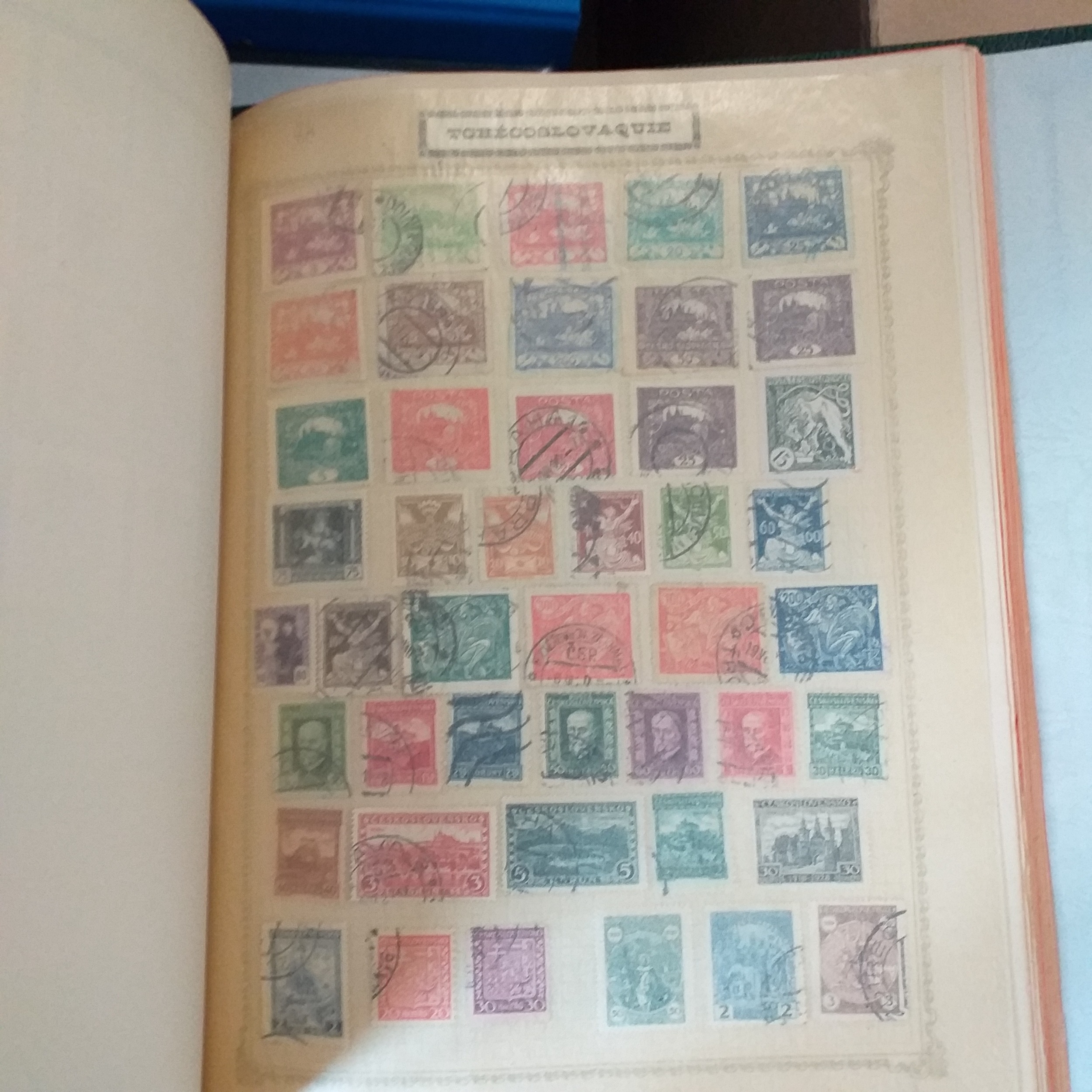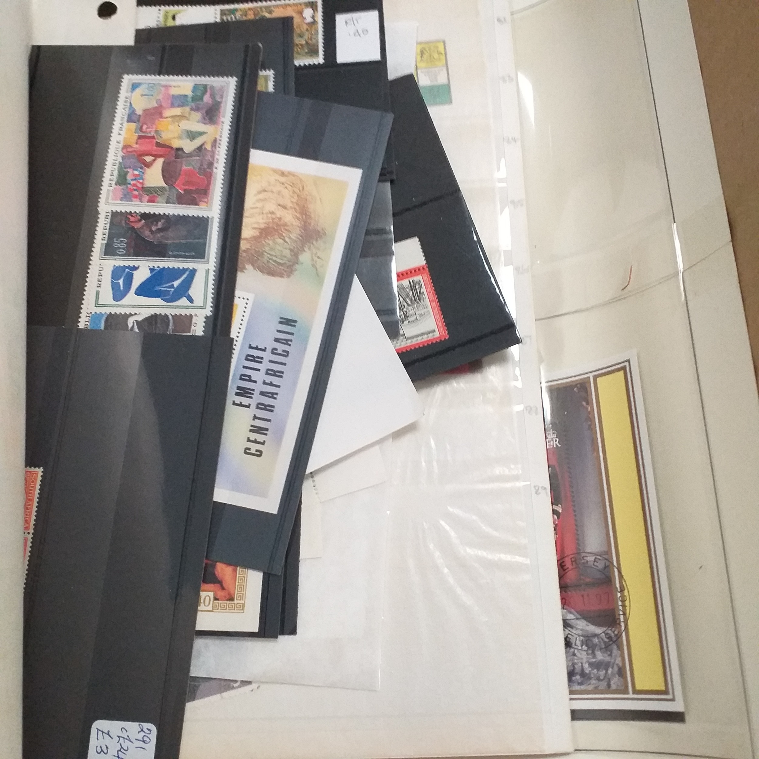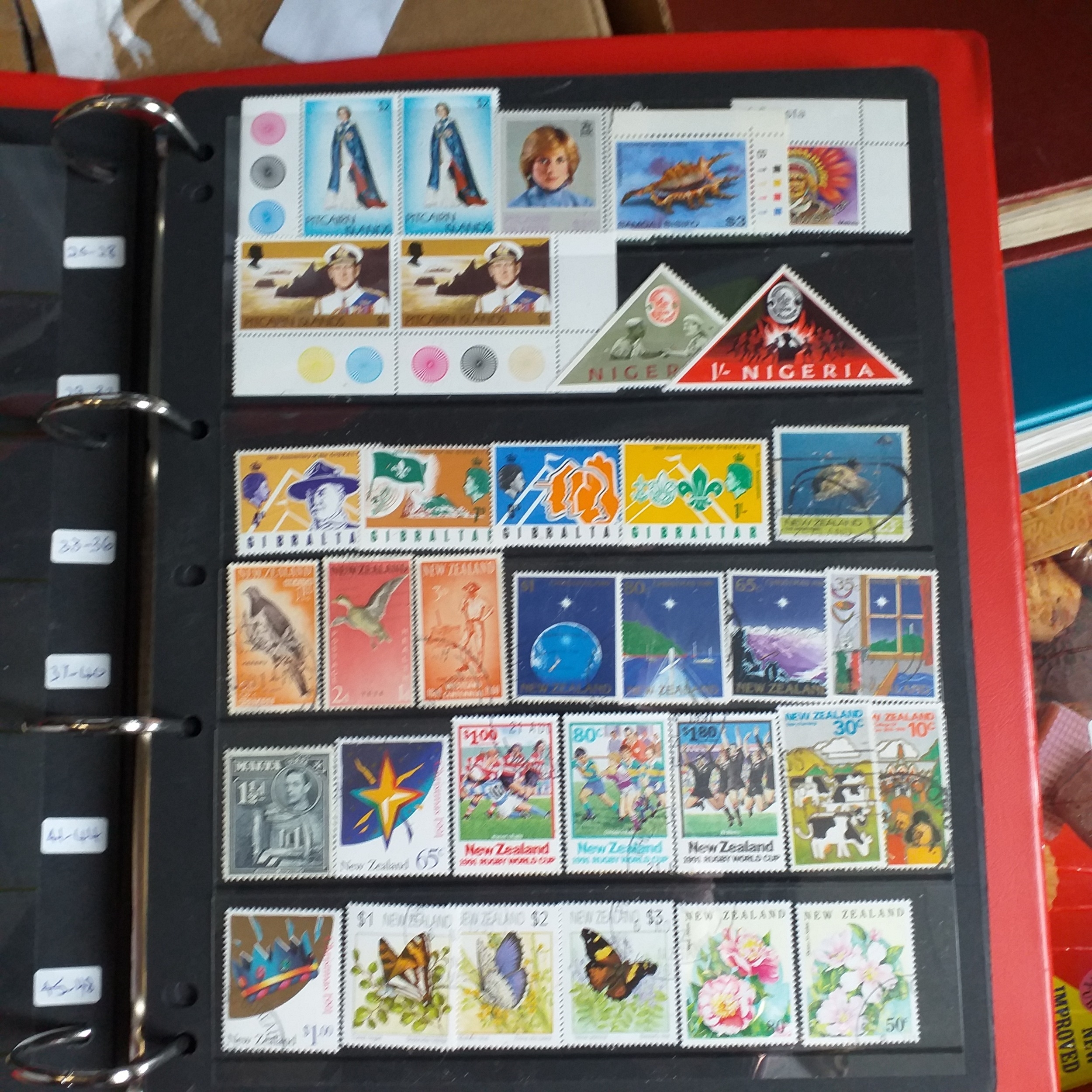 Large box (heavy) of World albums, Includes2 x Britannia Channel Is collections, Album of Commonwealth on Hagners, Lighthouse Europa album, A 1920's large red Rapkin 'The Challenge Postage Stamp Album' (printed pages) (Sparse), 16 page green Lighthouse with Rhodesia/Zimbabwe selection (duplication), 2 ring binder with world on album pages, 2 ring large Lever arch file with sed QE2 GB, 2 packs of SG Senator blank album pages, 4 x empty small albums/stock books, small pack of small childhood collections, Small bx of loose stamps in packet, on leaves and small stockcards.