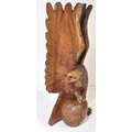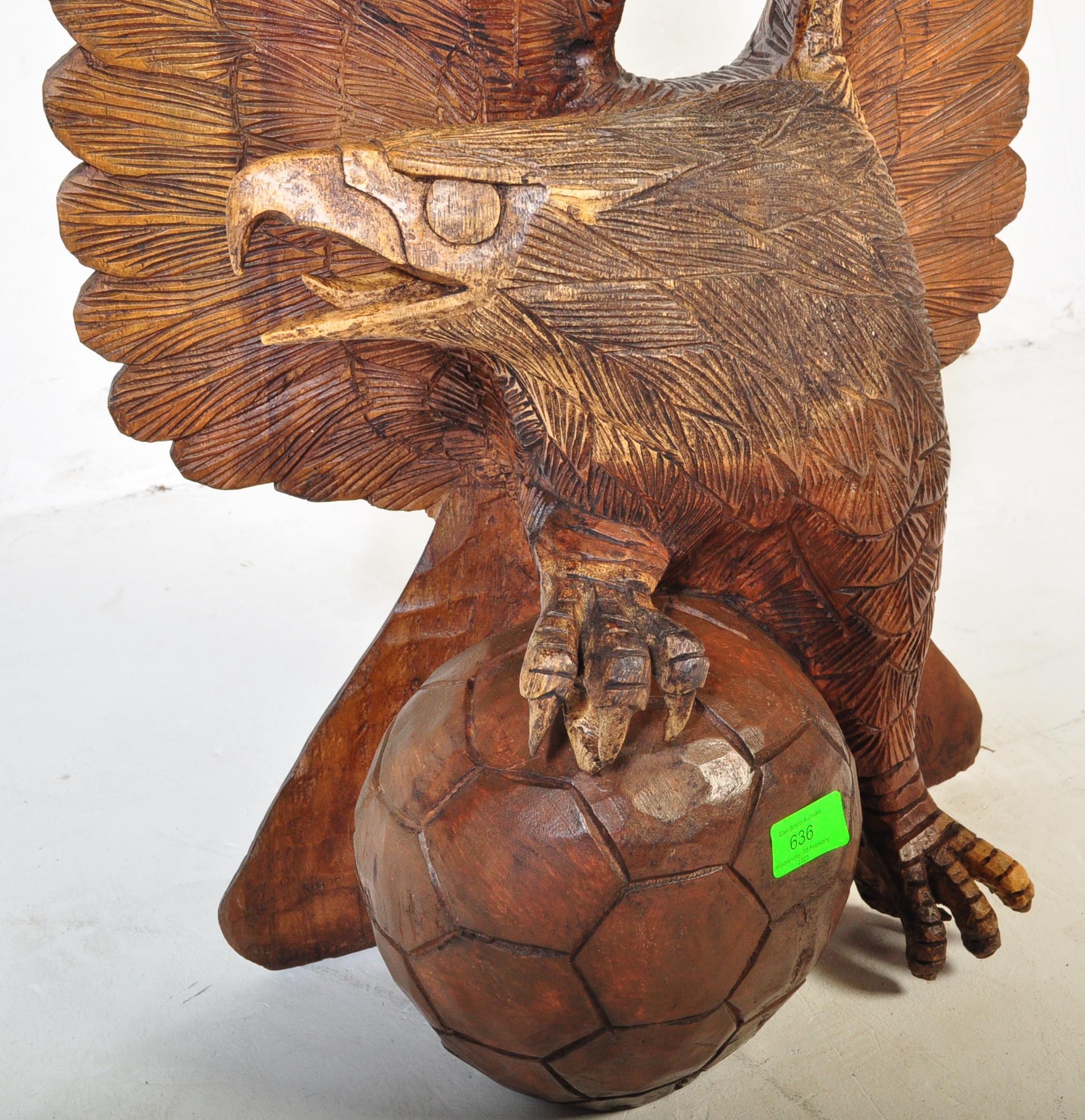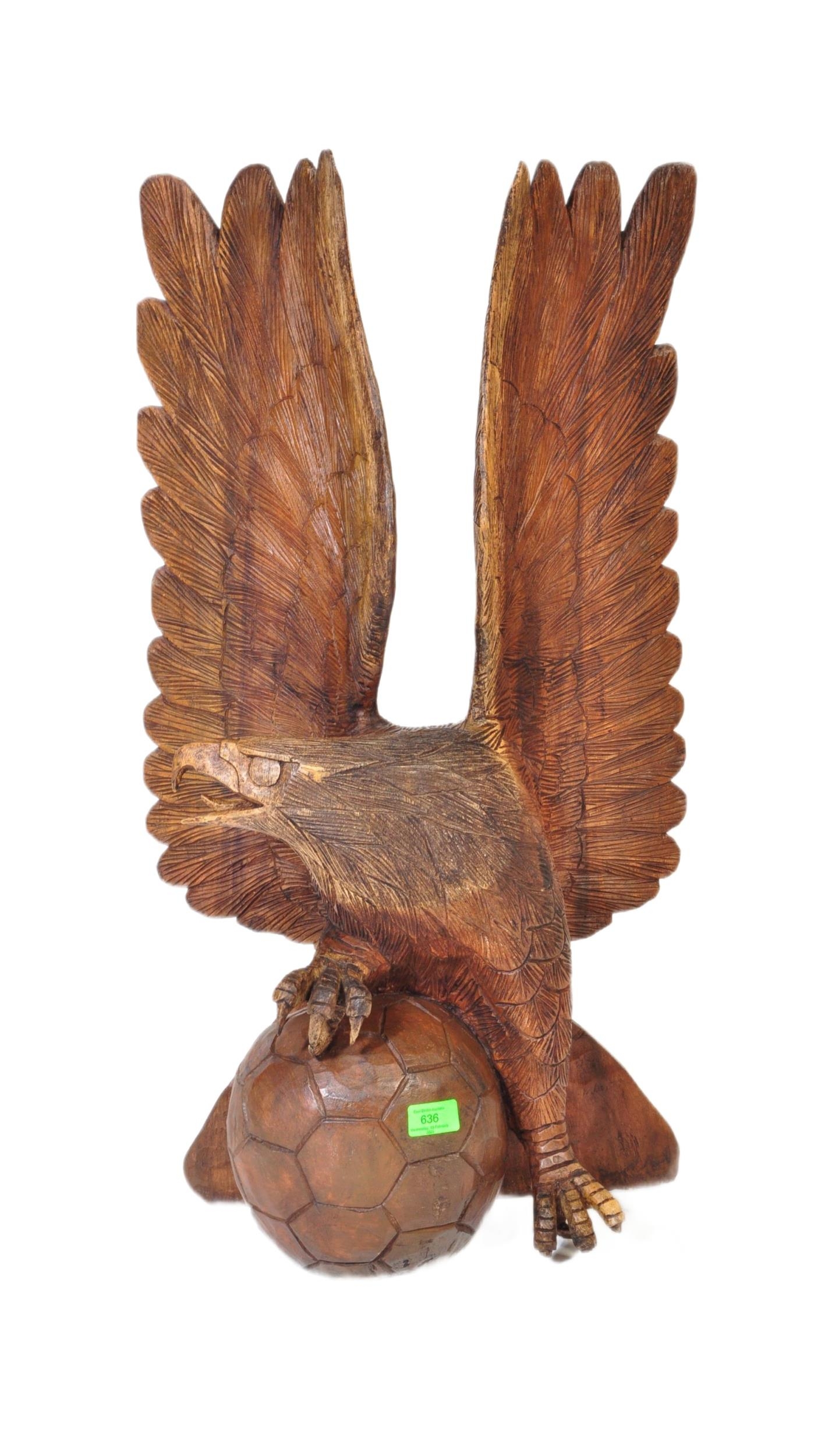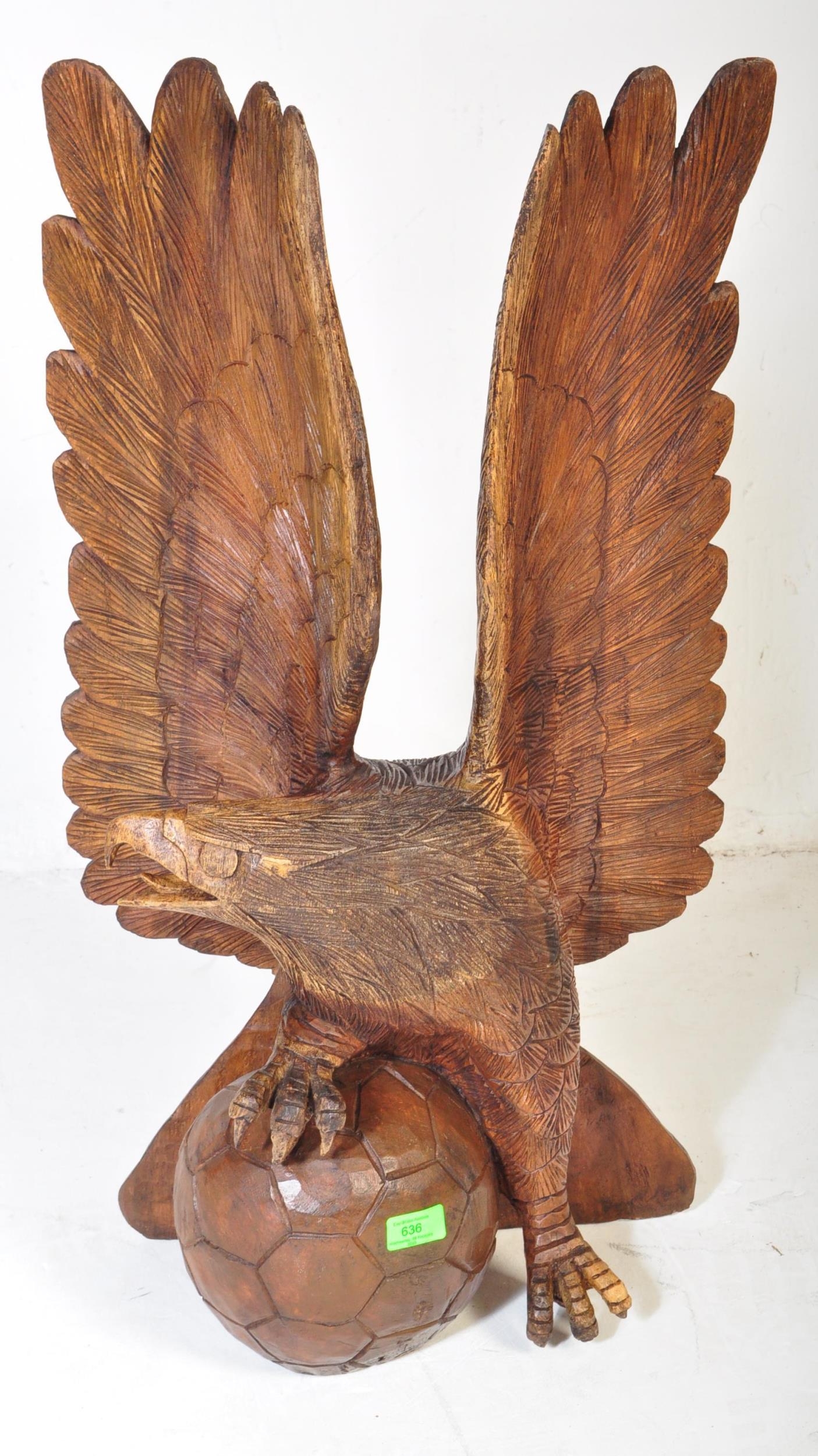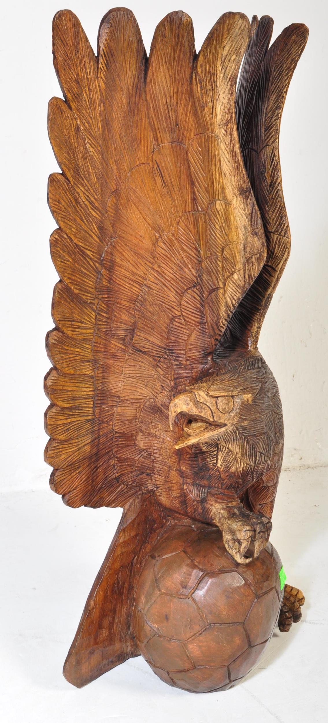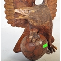 A vintage 20th century carved wooden sculpture of an eagle with upstretched wings resting on football. It measures approx. 78cm tall.