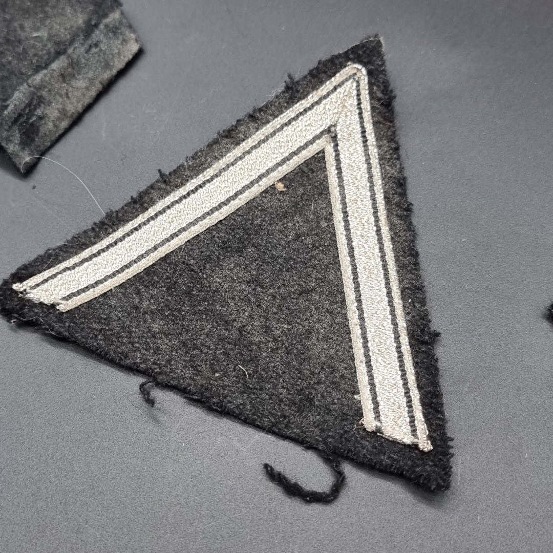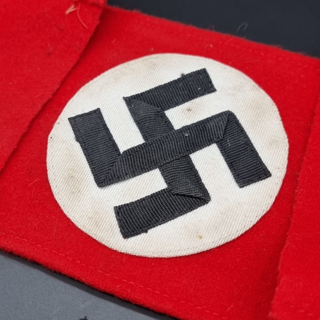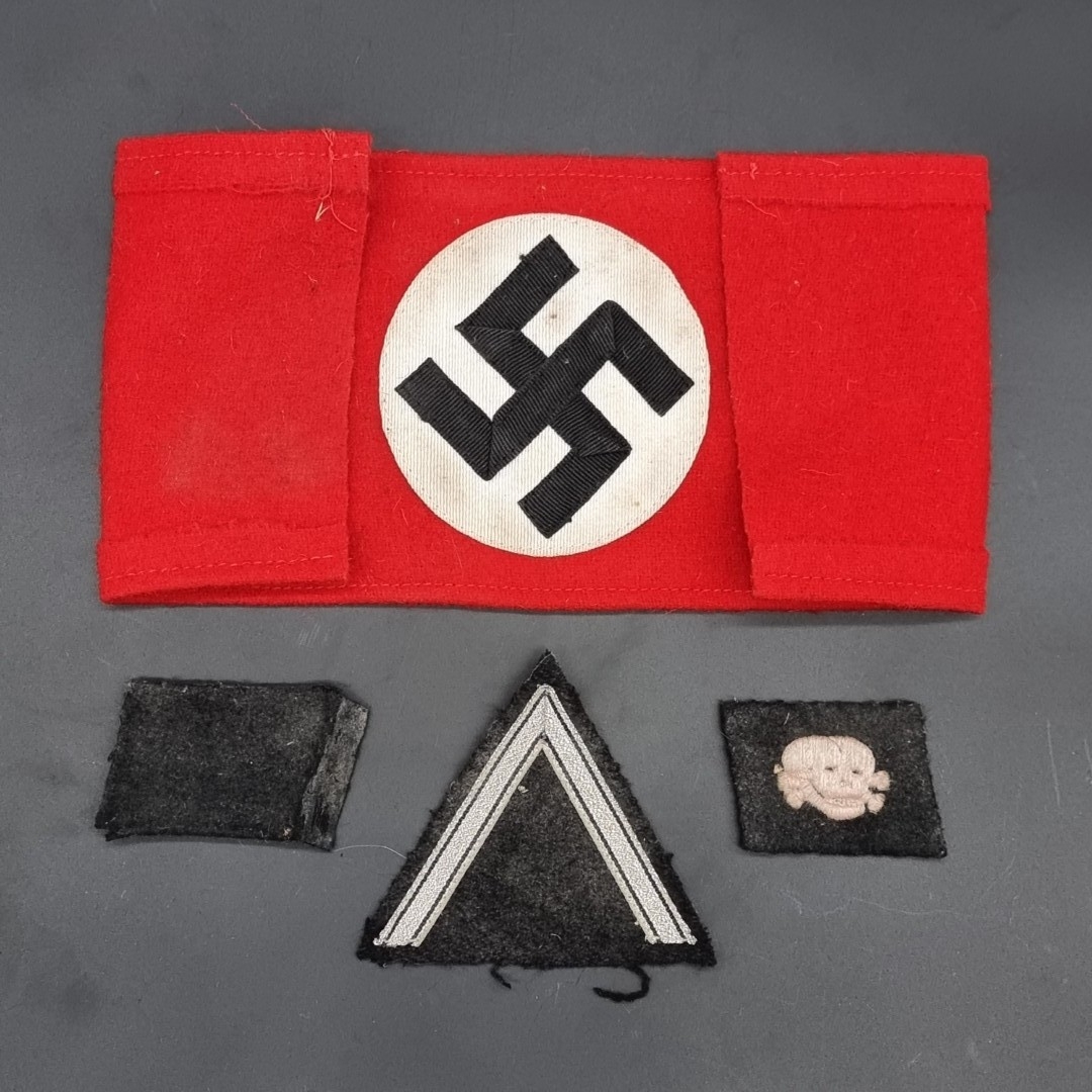 A German Third Reich Party NSDAP armband, 36cm; together with a pair of SS woven collar patches; and an SS woven rank badge. (4)