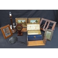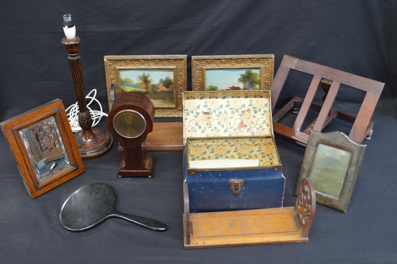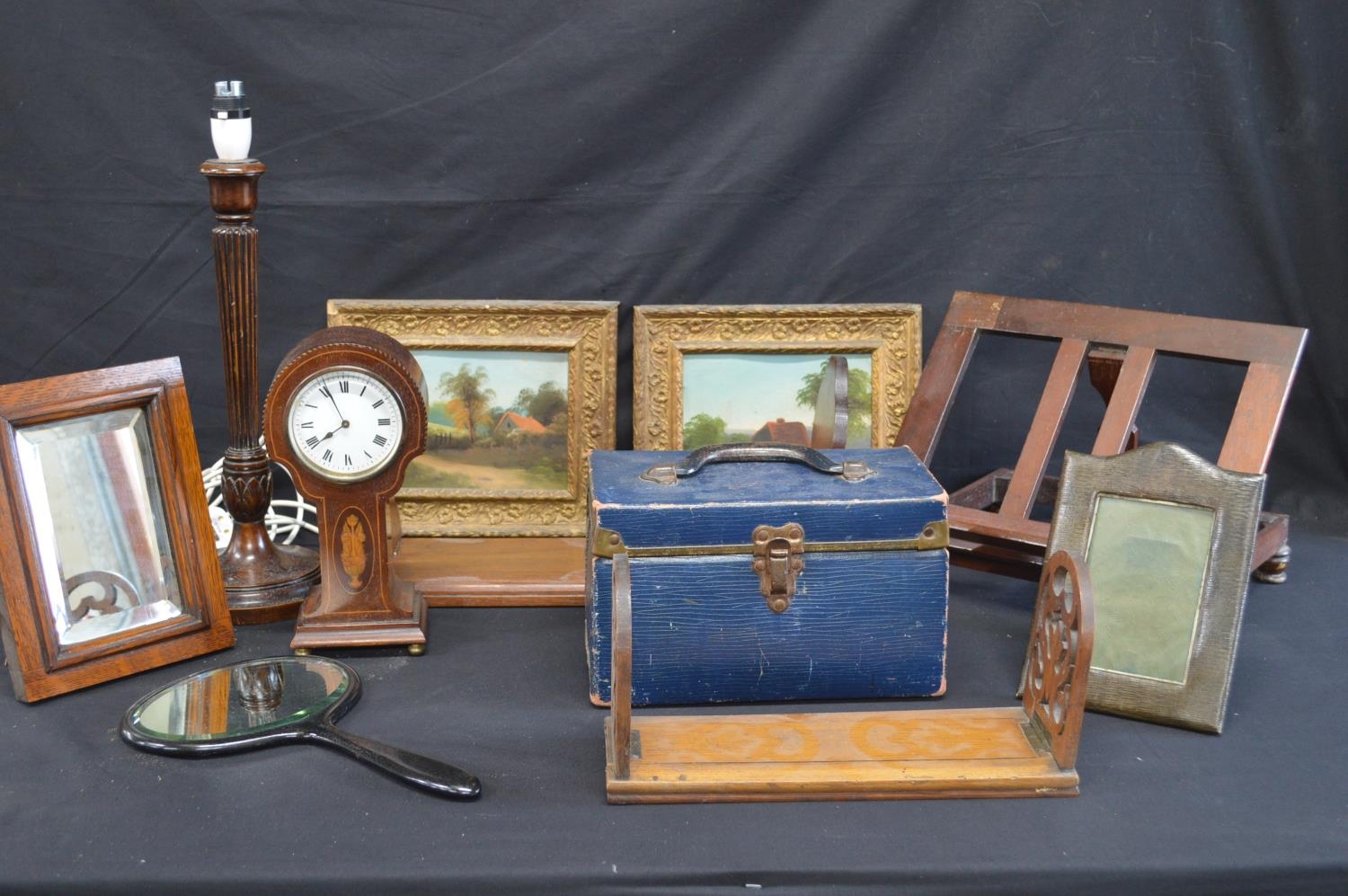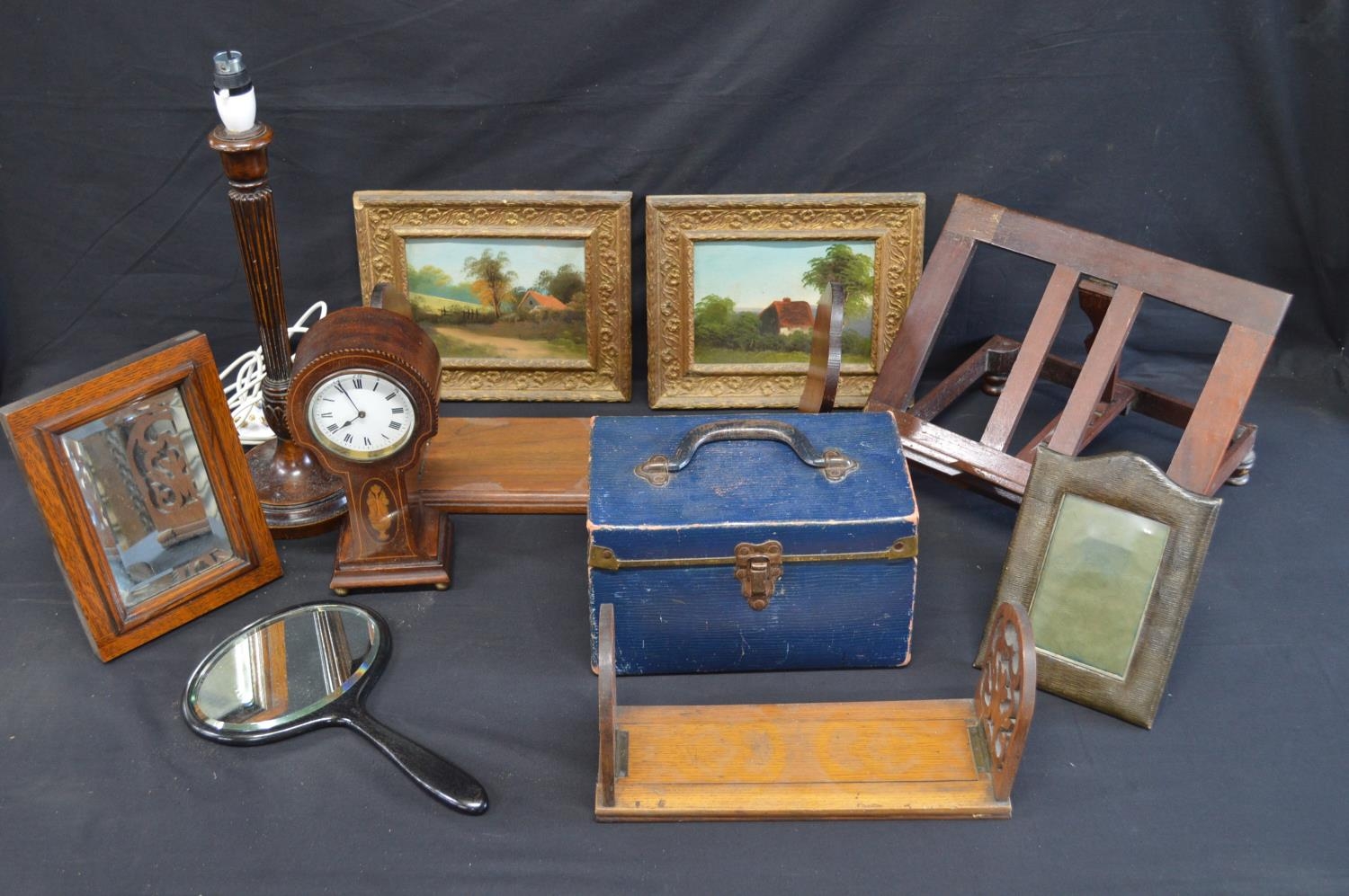 Collection of sundry items to include: two book slides, inlaid mantle clock, book rest, pair of oil on boards and hand mirror etc