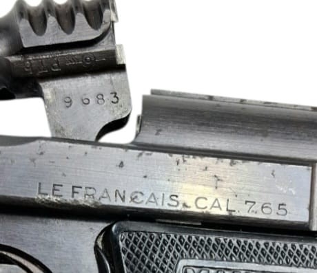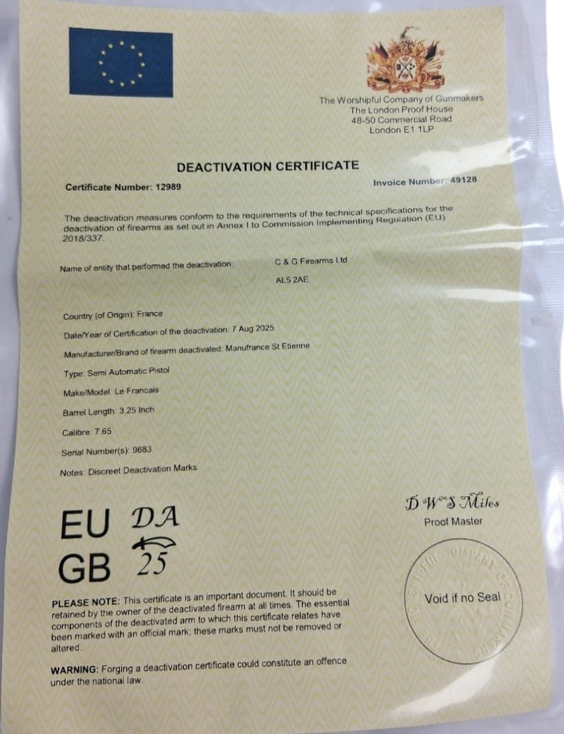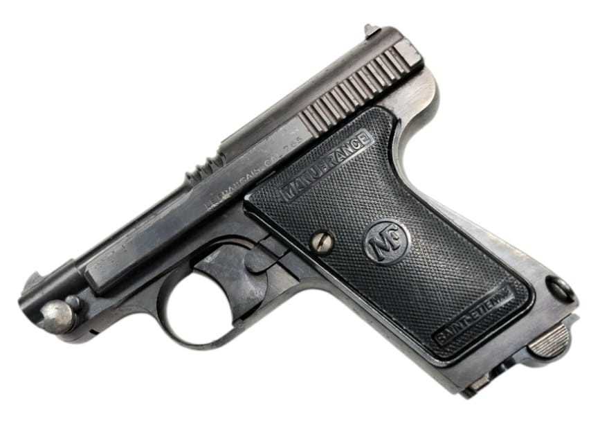 A Deactivated Manufrance St. Etienne Pistol. 7.65mm calibre with removable magazine. WW2 era French resistance type pistol. Comes with an EU deactivation certificate. UK/EU sales only - Not Holland
