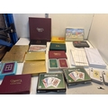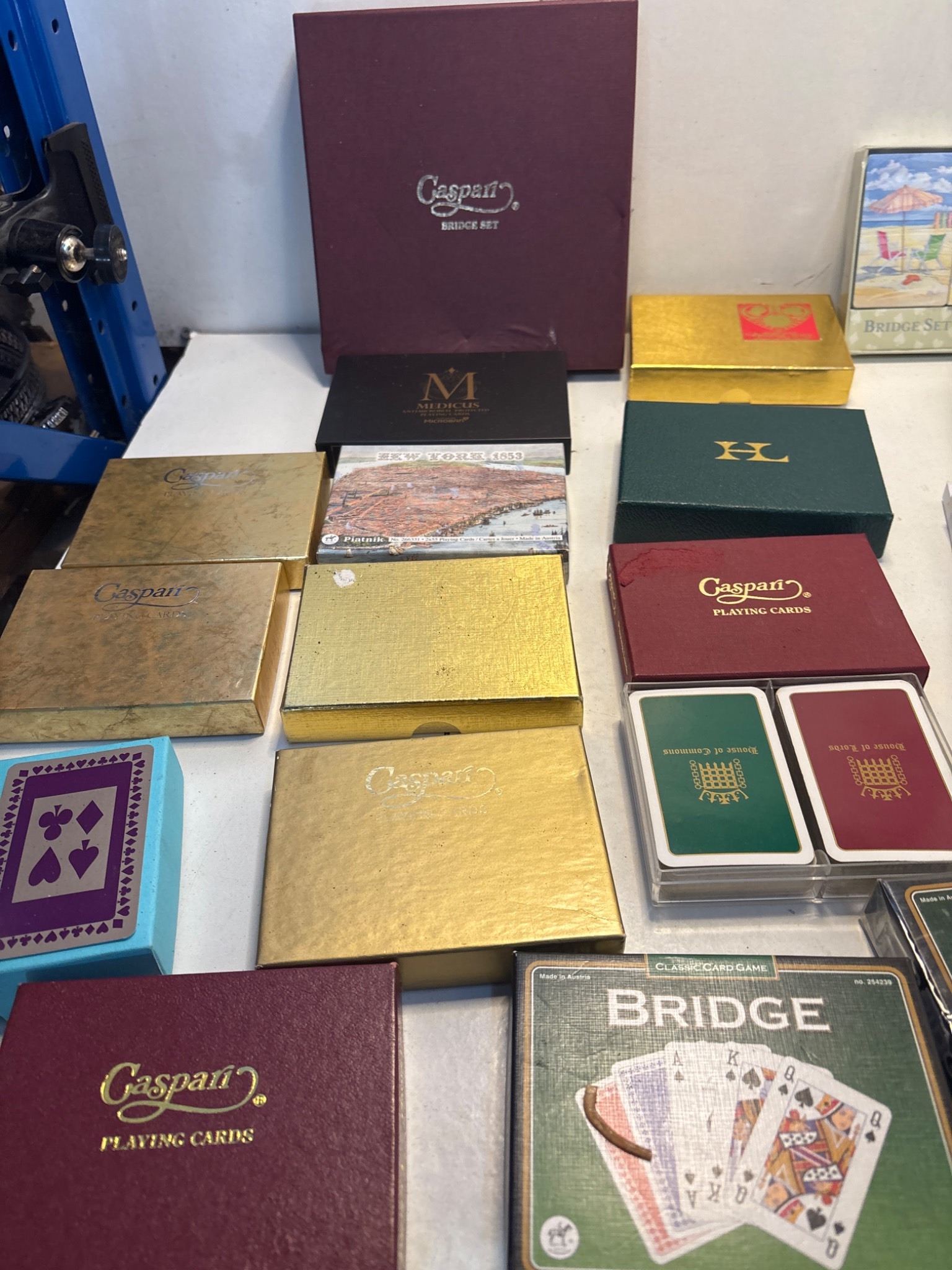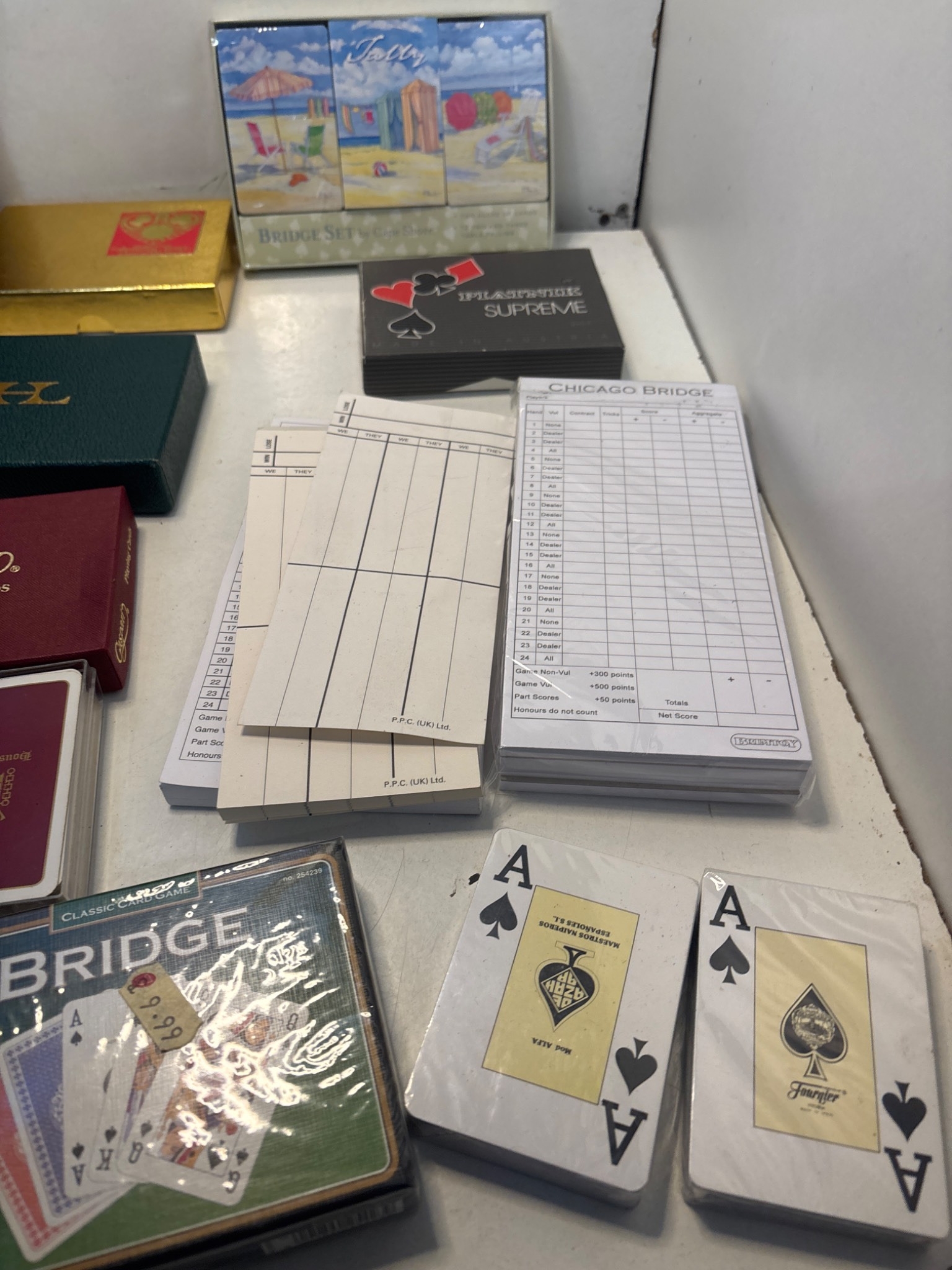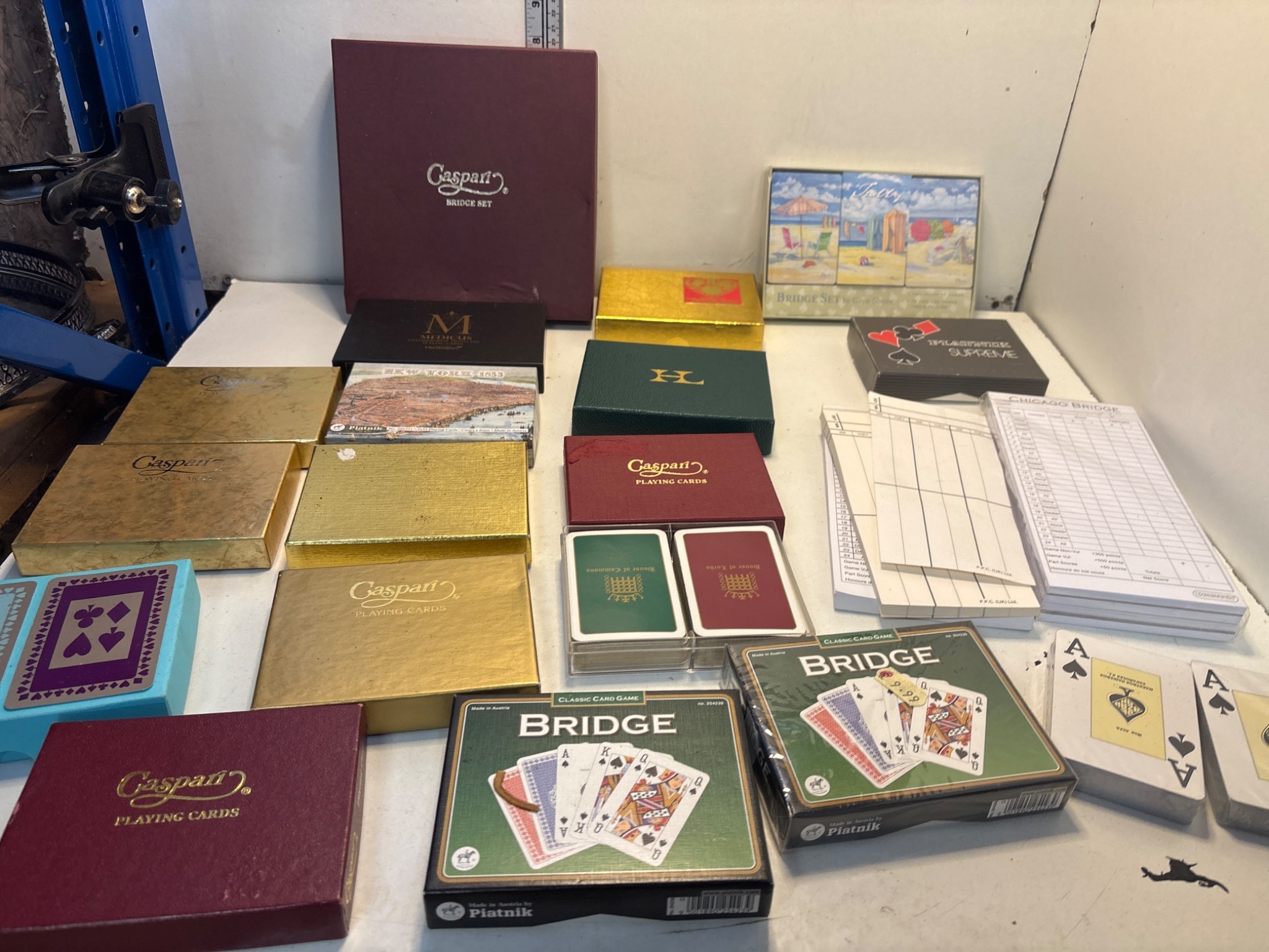 Caspari playing cards and Bridge accessories including score pads, packaged card decks, and themed sets in decorative boxes. Includes sealed Bridge card decks and unused accessories.