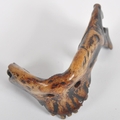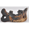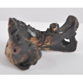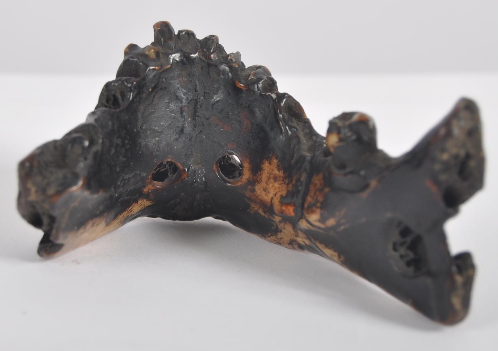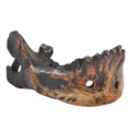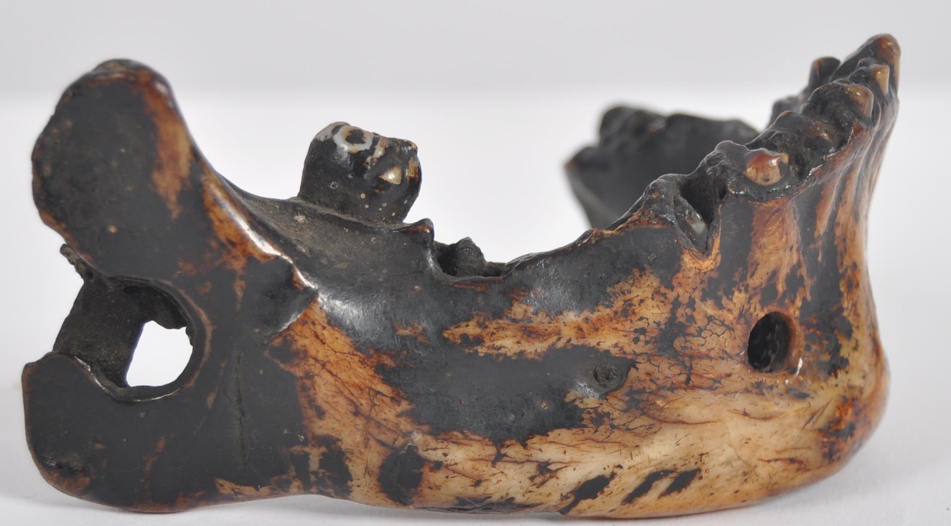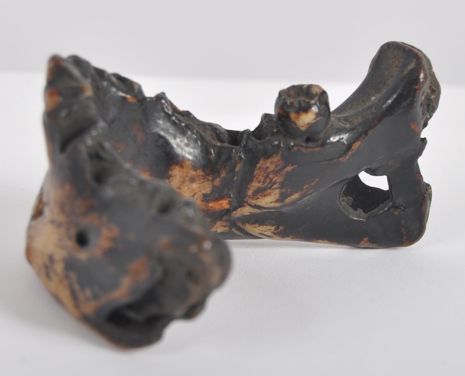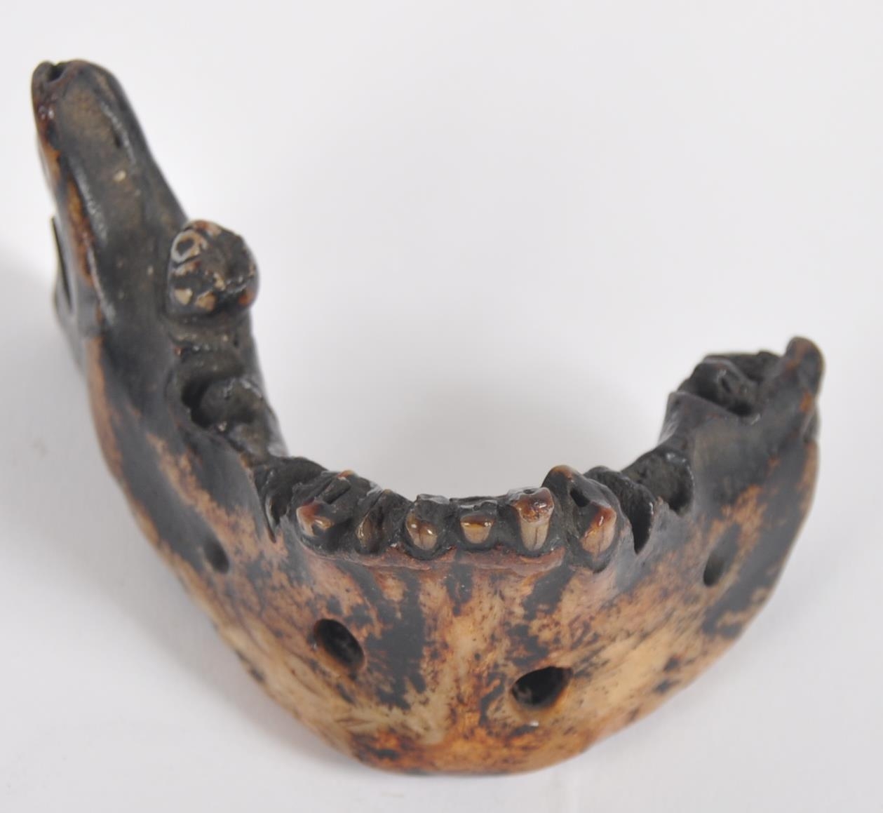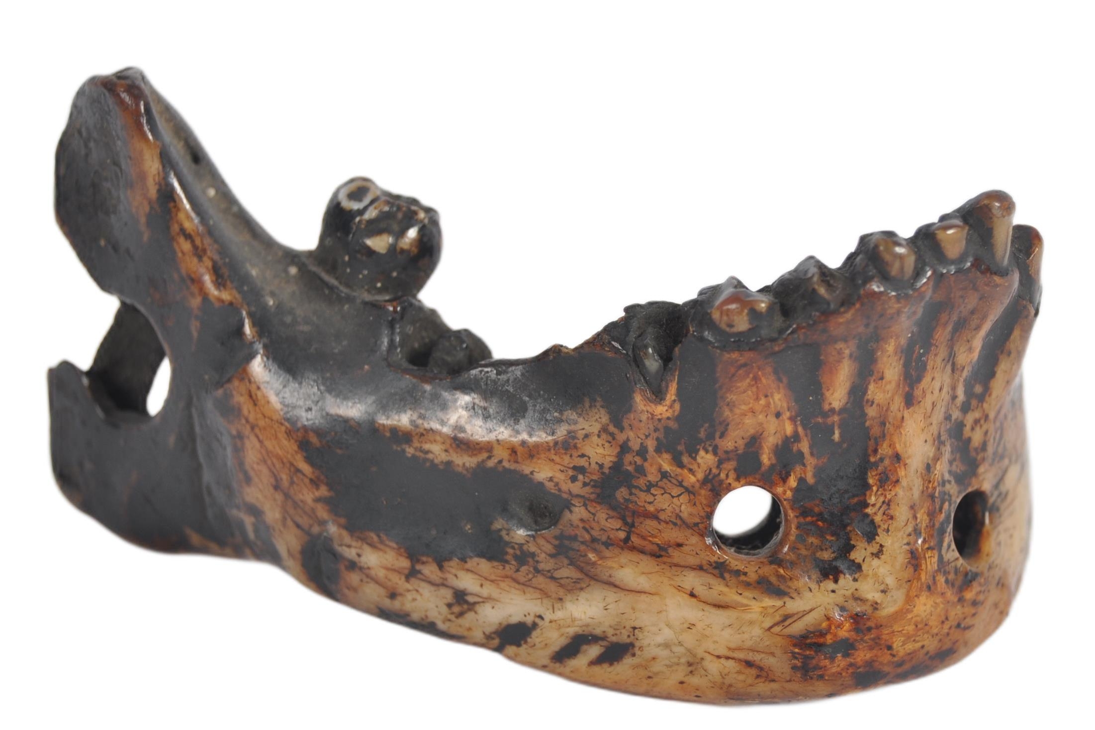 A 19th century Nepalese witch doctors amulet. In the form of a human lower jaw, of charred and lacquered appearance, the remnants of incisors, canines and one molar present, and two toggle holes for carrying. Approximately 9cm wide.