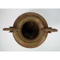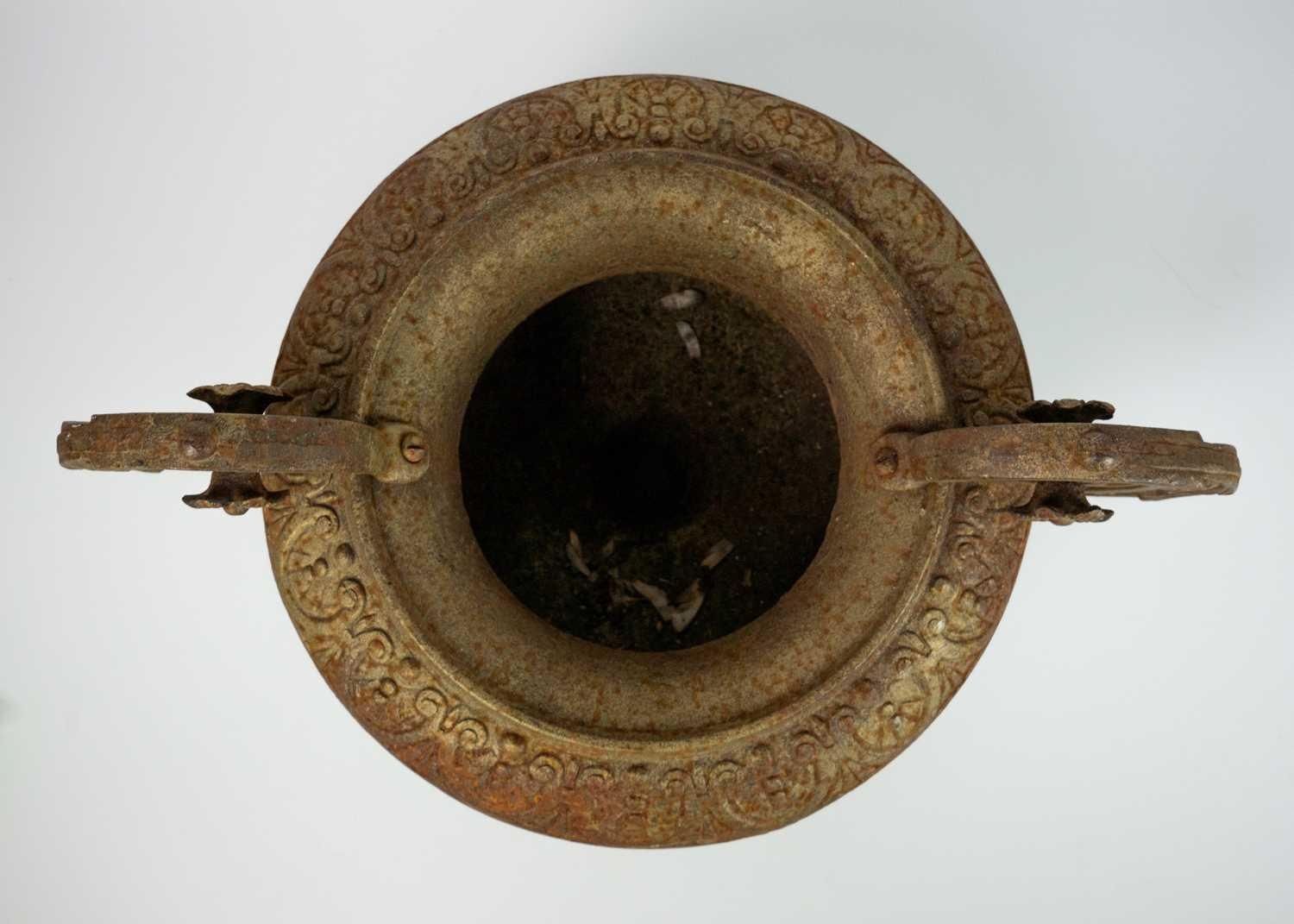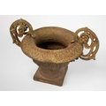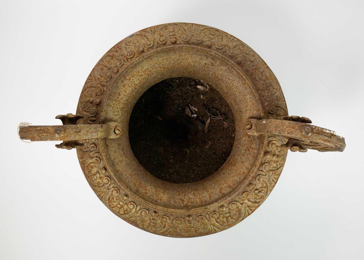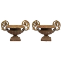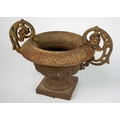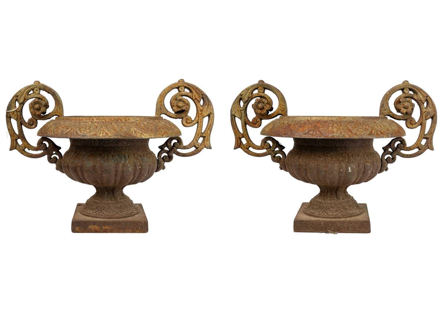 A pair of French cast iron twin handled campana urns. On square bases, height 31cm width 43cm. The handles have a little movement but are firmly attached, the corrosion has not affected the structural soundness of the iron.