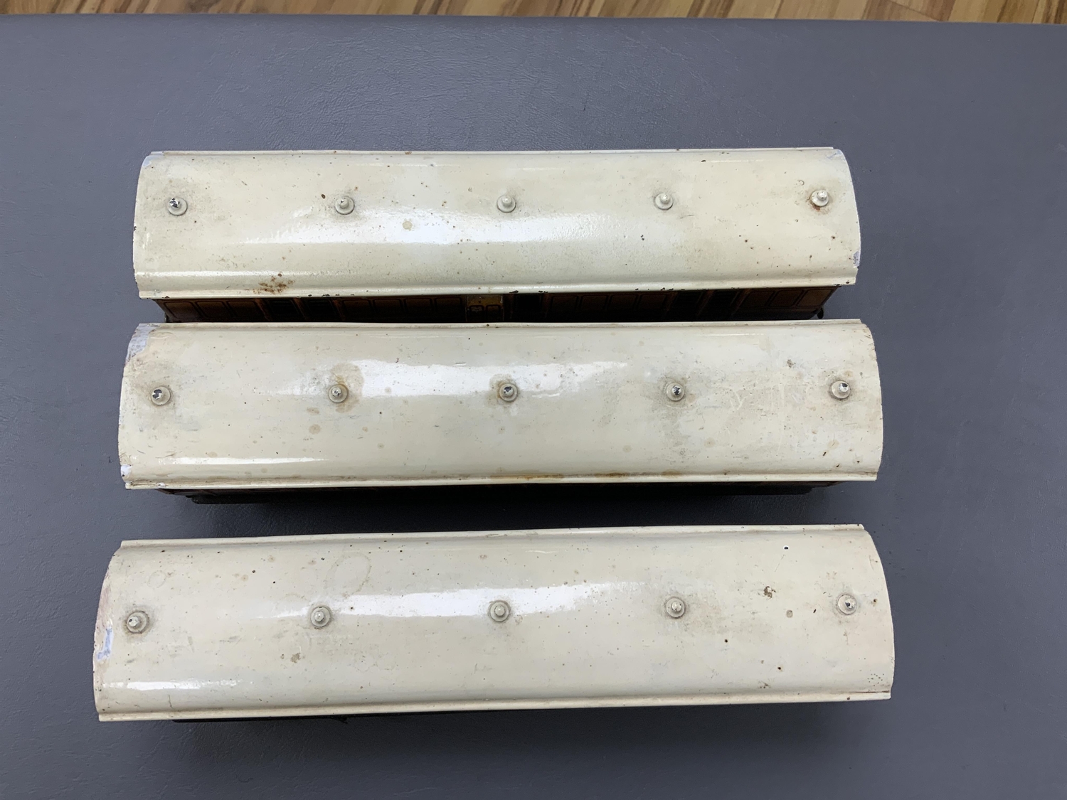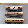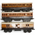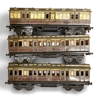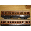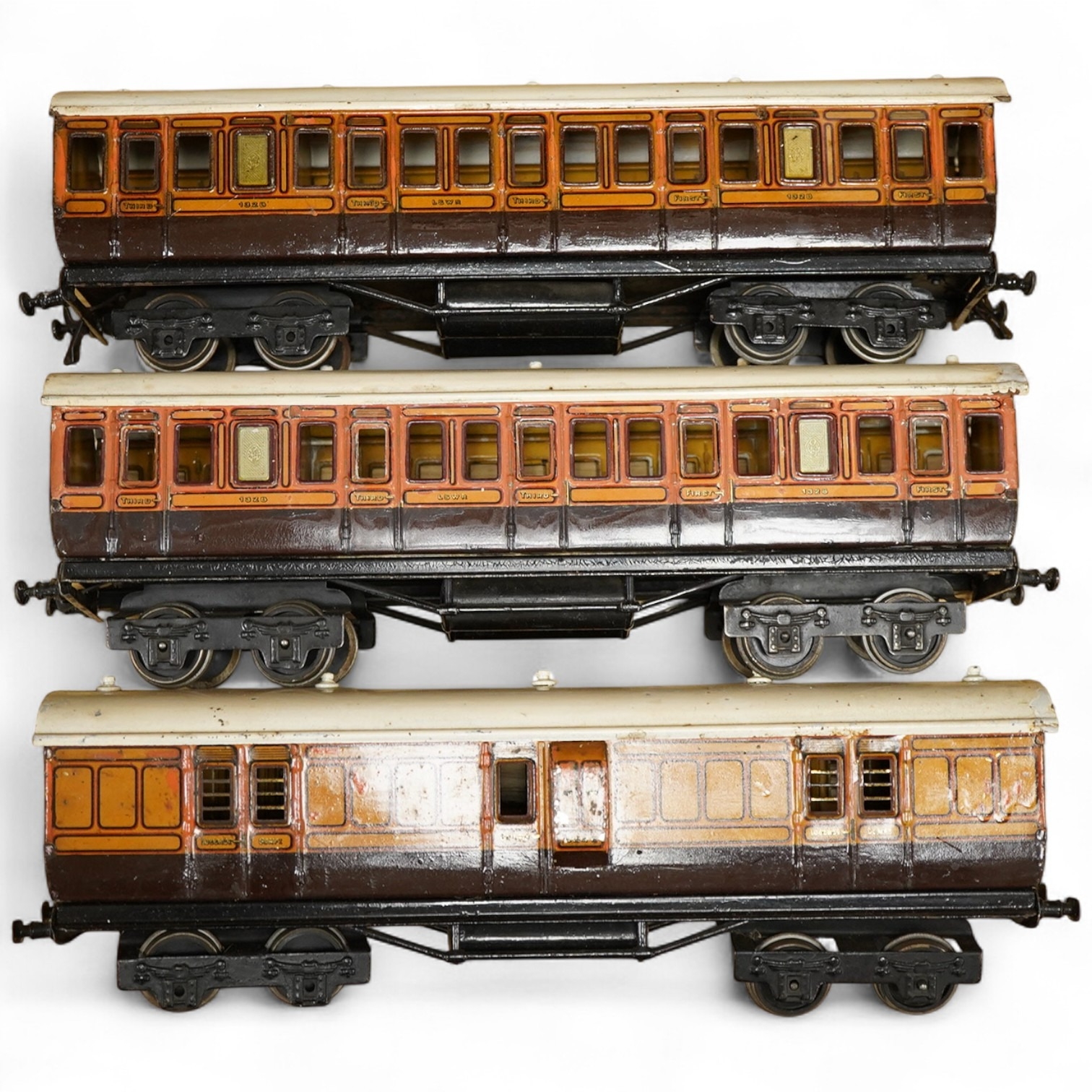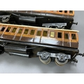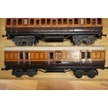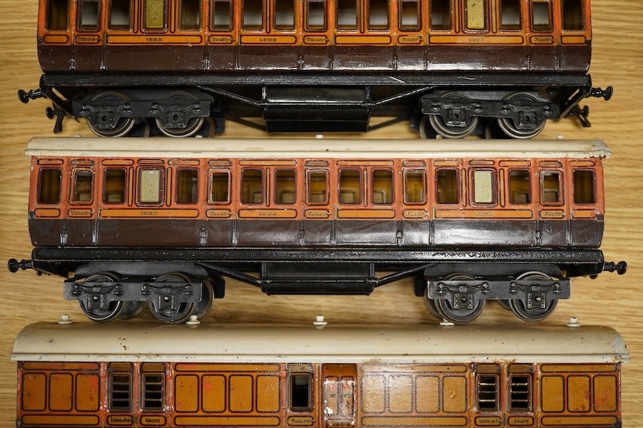 Three Carette for Bassett-Lowke 0 gauge railway 1921 series tinplate LSWR bogie coaches fitted with Bing couplings; two First Third Composite coaches, both 1328, and a full brake van, 133, all in salmon and chocolate livery