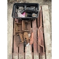 A tractor draw bar, two ball hitches, various brackets and trailer accessories