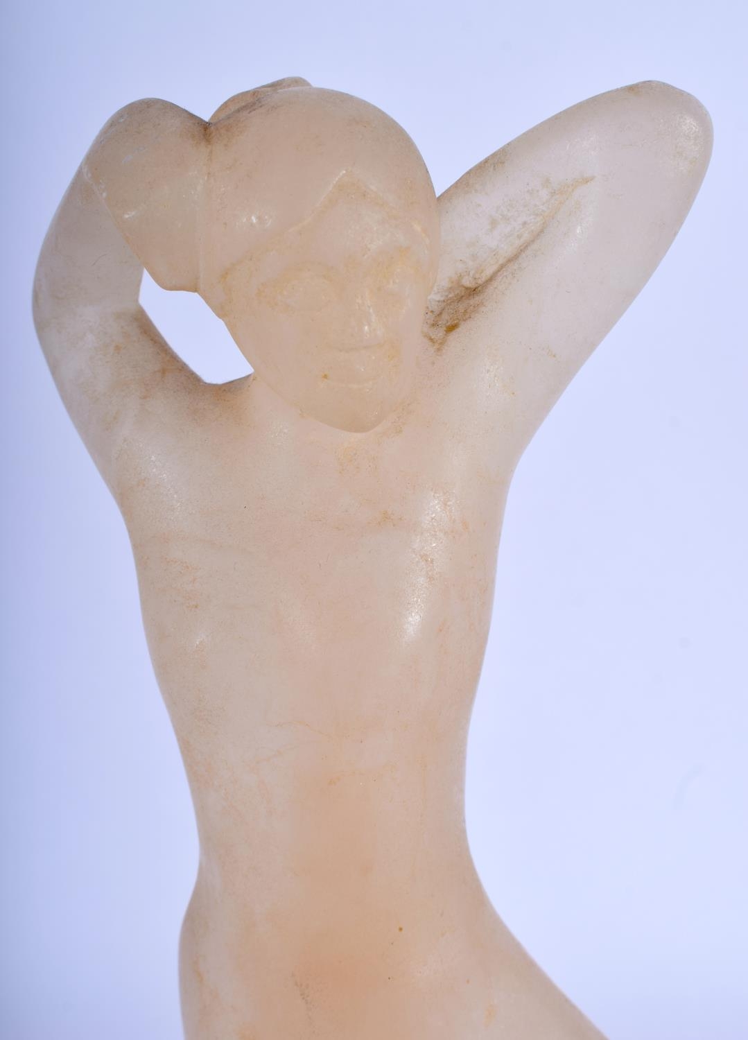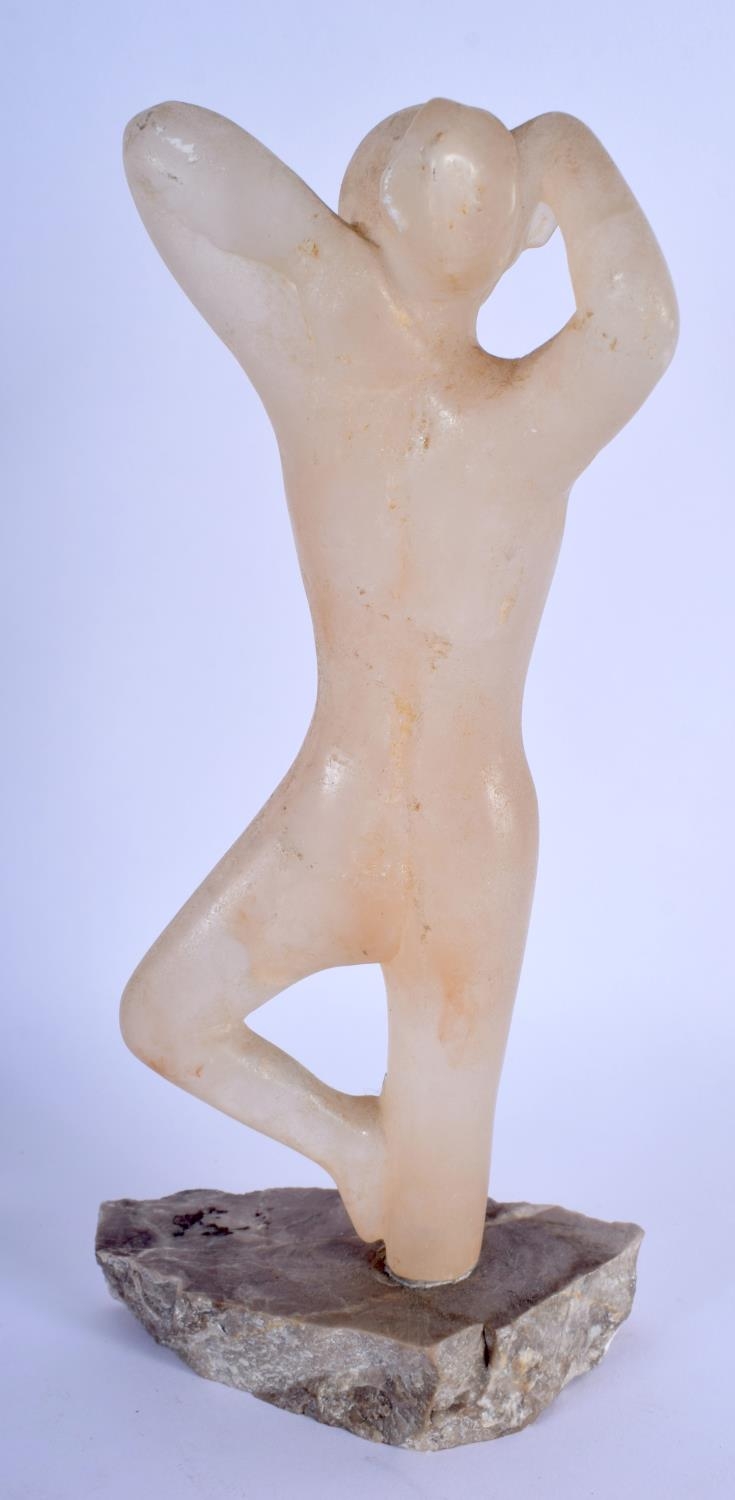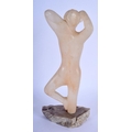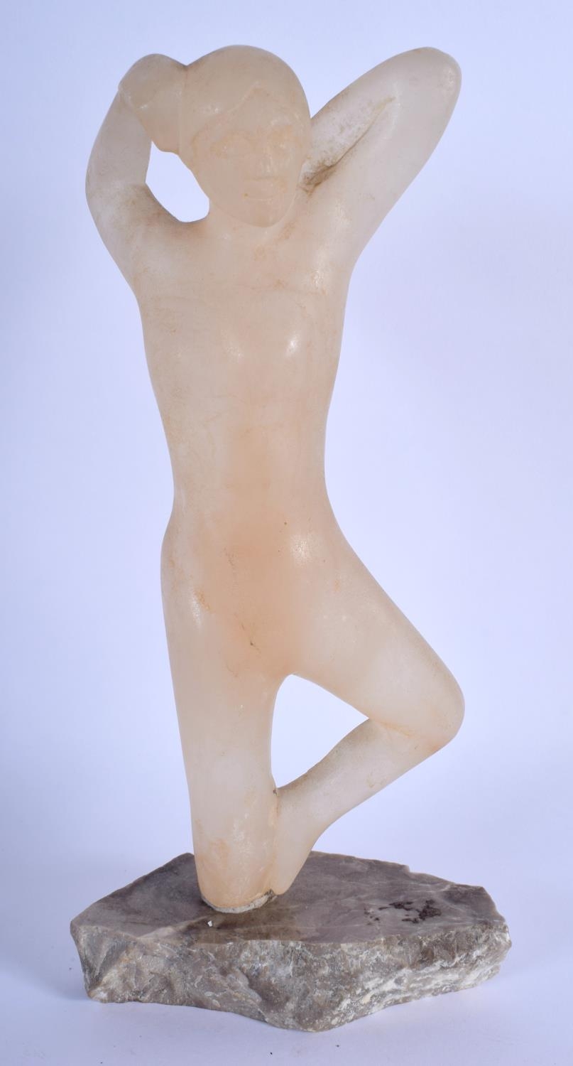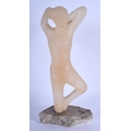 AN ART DECO CARVED STONE FIGURE OF A NUDE FEMALE upon a stone base. 24 cm high.