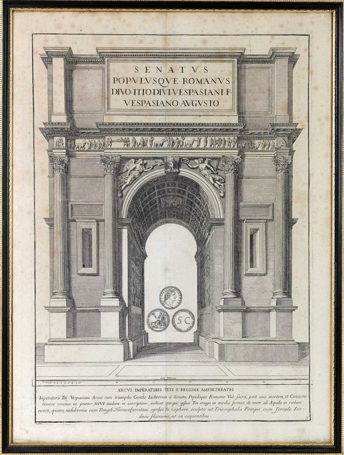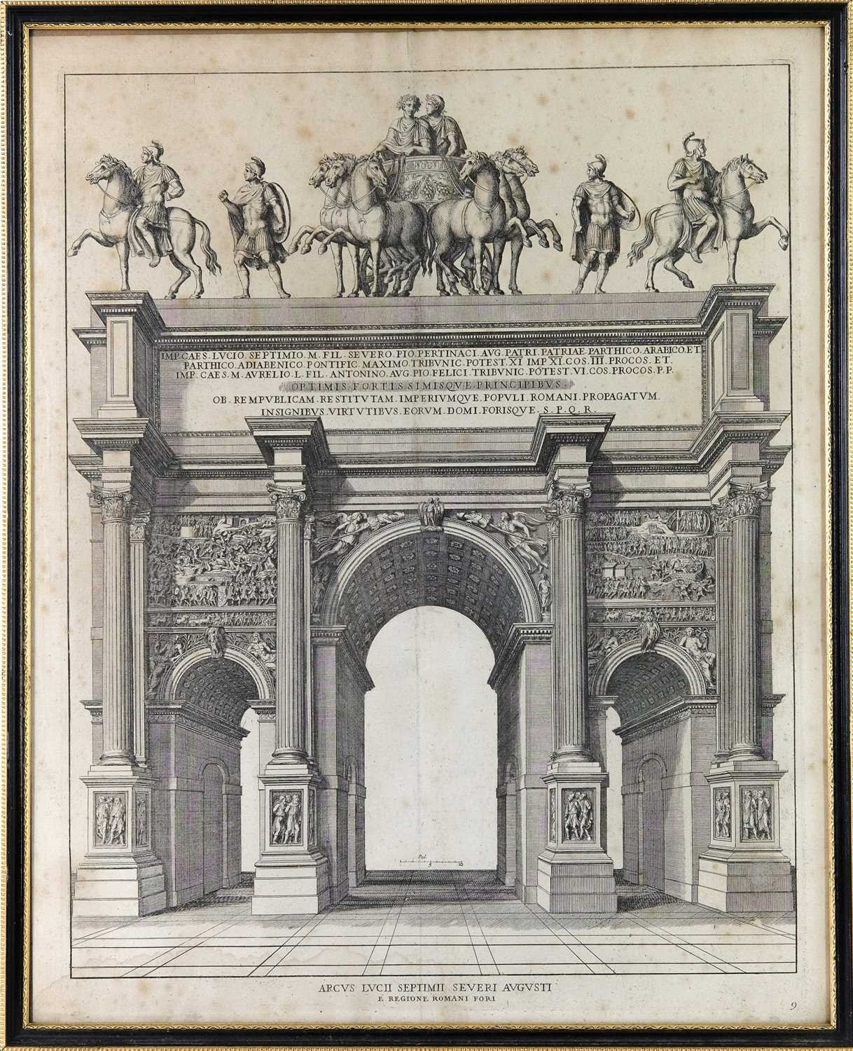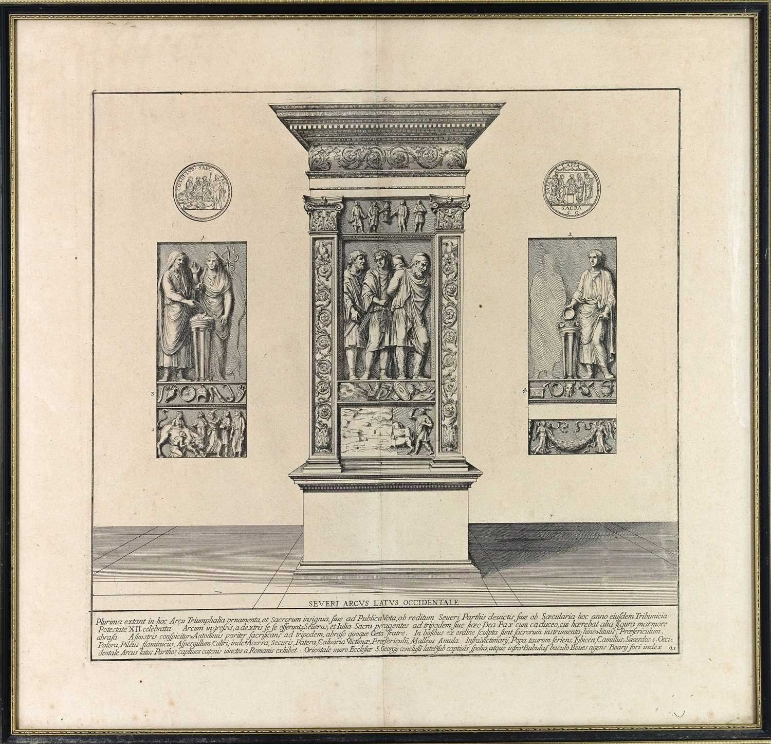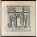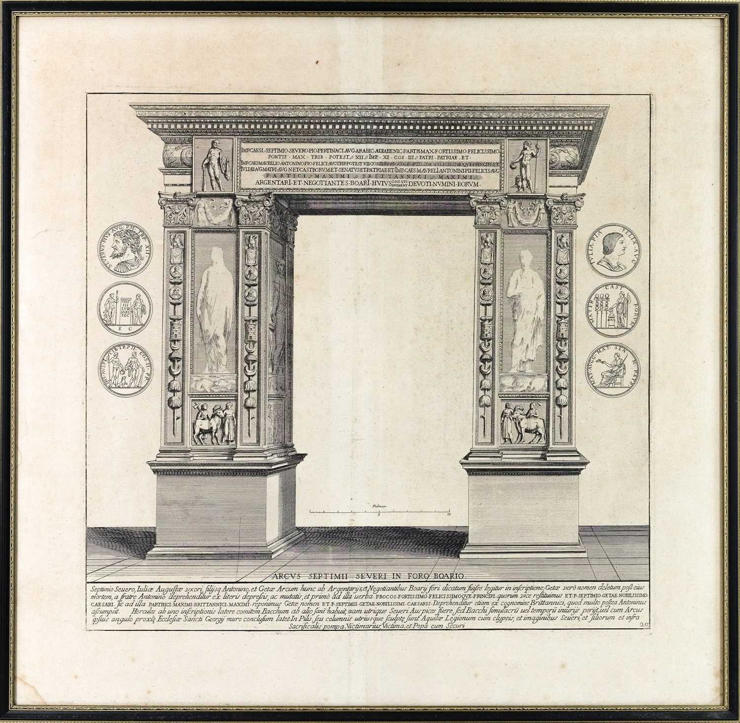 (Rome Architectural Engravings) Seven works Taken from Giovanni Pietro Bellori's 'Veteres Arcus Augustorum Triumphis Insignes ex Reliquiis quae Romae adhunc Supersunt,' centre folds, some spotting, all framed and glazed, largest measures 51.5cm x 50cm, [Ad Templum Sanctae Mariae de Pace, Rome 1690].