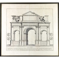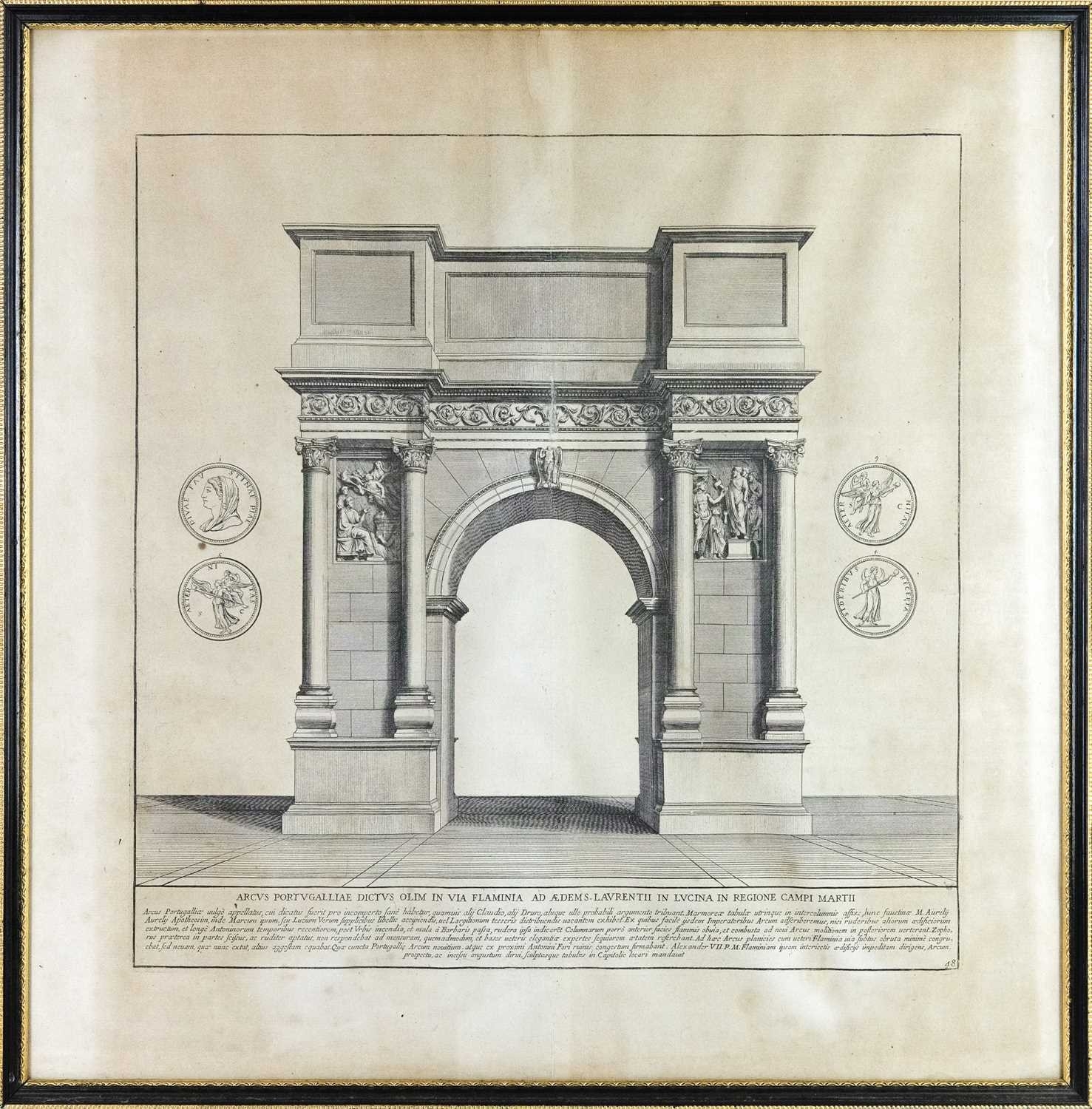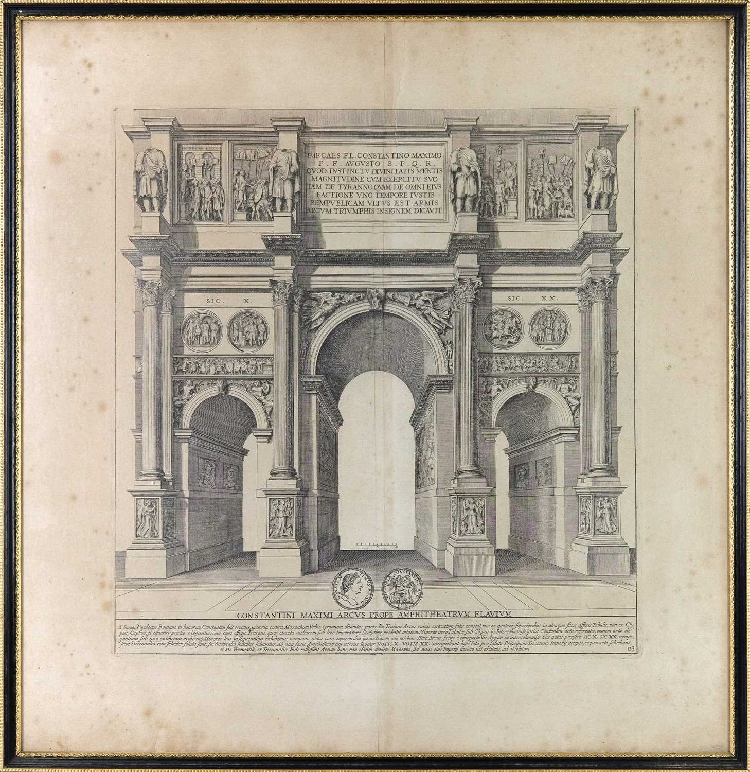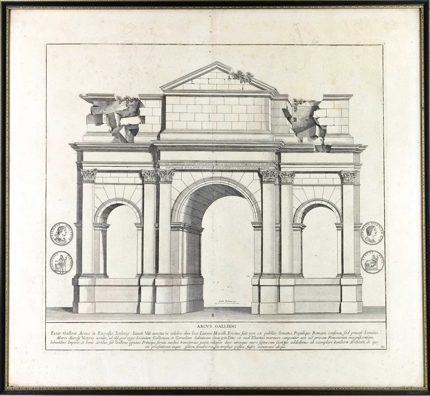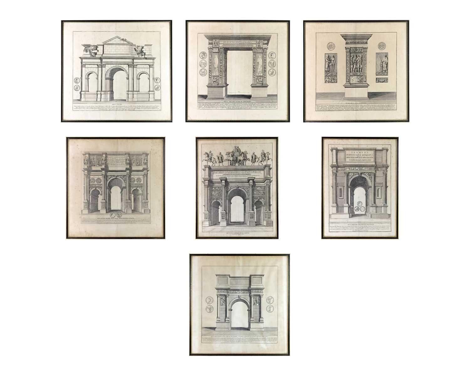 (Rome Architectural Engravings) Seven works Taken from Giovanni Pietro Bellori's 'Veteres Arcus Augustorum Triumphis Insignes ex Reliquiis quae Romae adhunc Supersunt,' centre folds, some spotting, all framed and glazed, largest measures 51.5cm x 50cm, [Ad Templum Sanctae Mariae de Pace, Rome 1690].