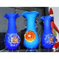 Set of Three Cased Glass Vases (Chinese Glass - with Pontil Marks) - in Royal Blue and Each having a Floral Decoration in Orange Colourway and with Handles - approx 10" High plus other glass works
