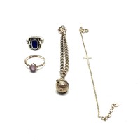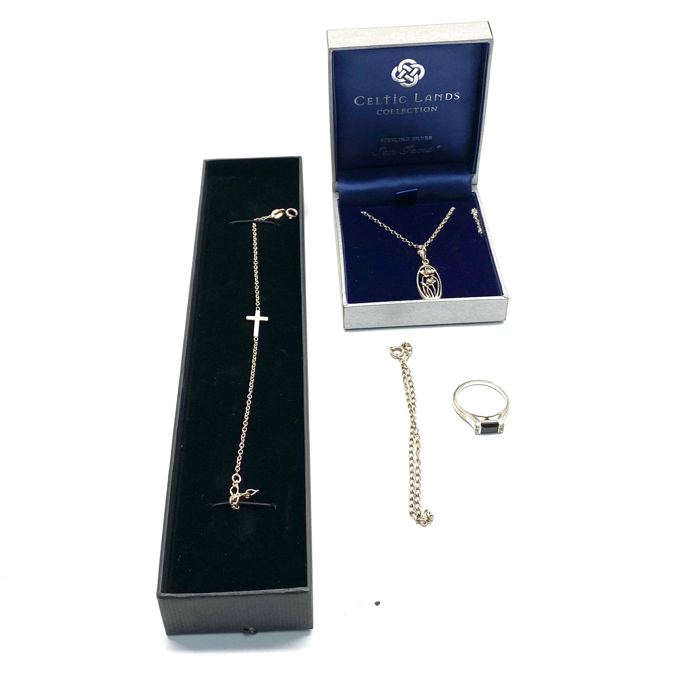 Boxed silver cross bracelet, Celtic lands silver chain and daffodil pendant, Black Onyx silver ring with diamonds size R and a silver bracelet.