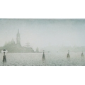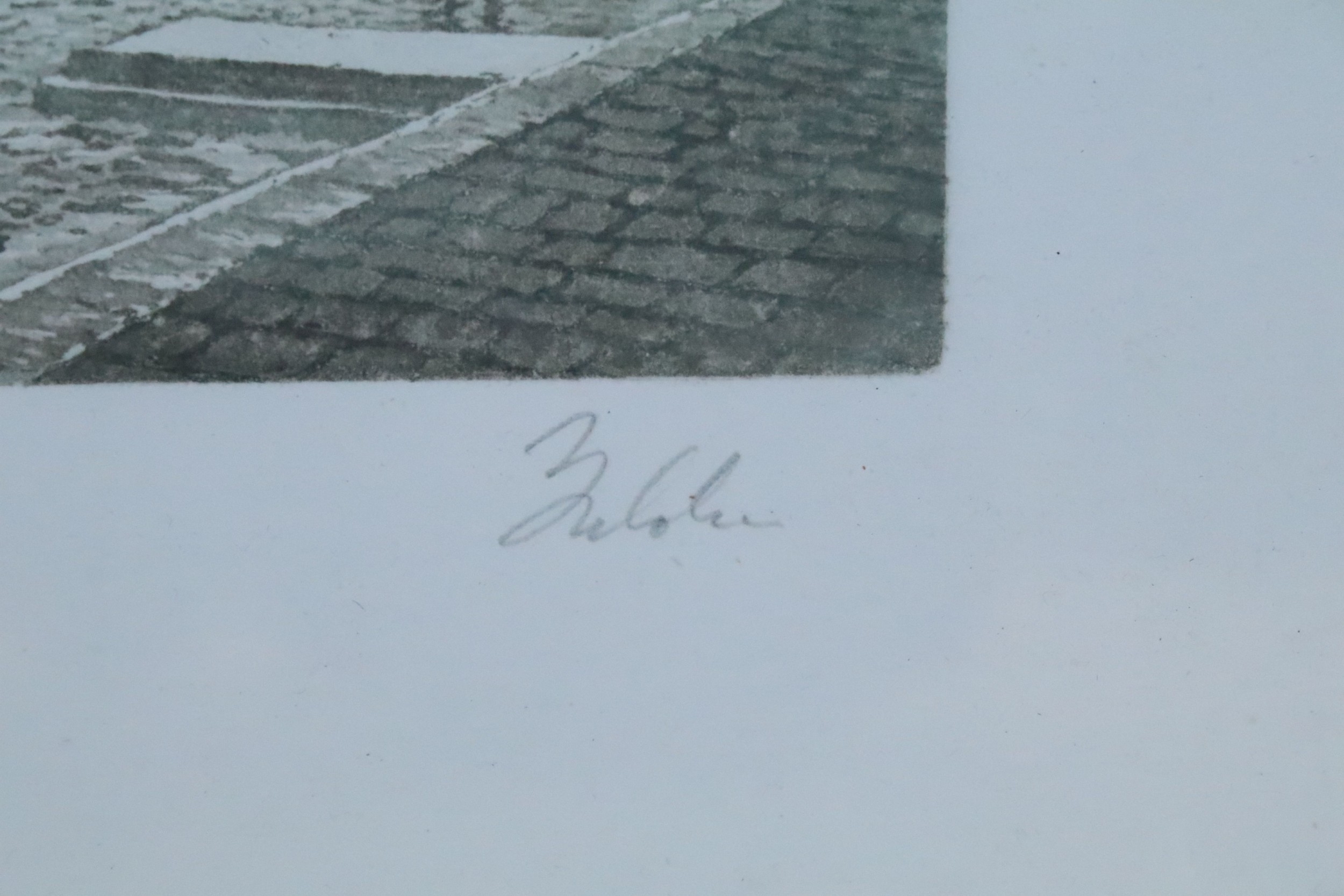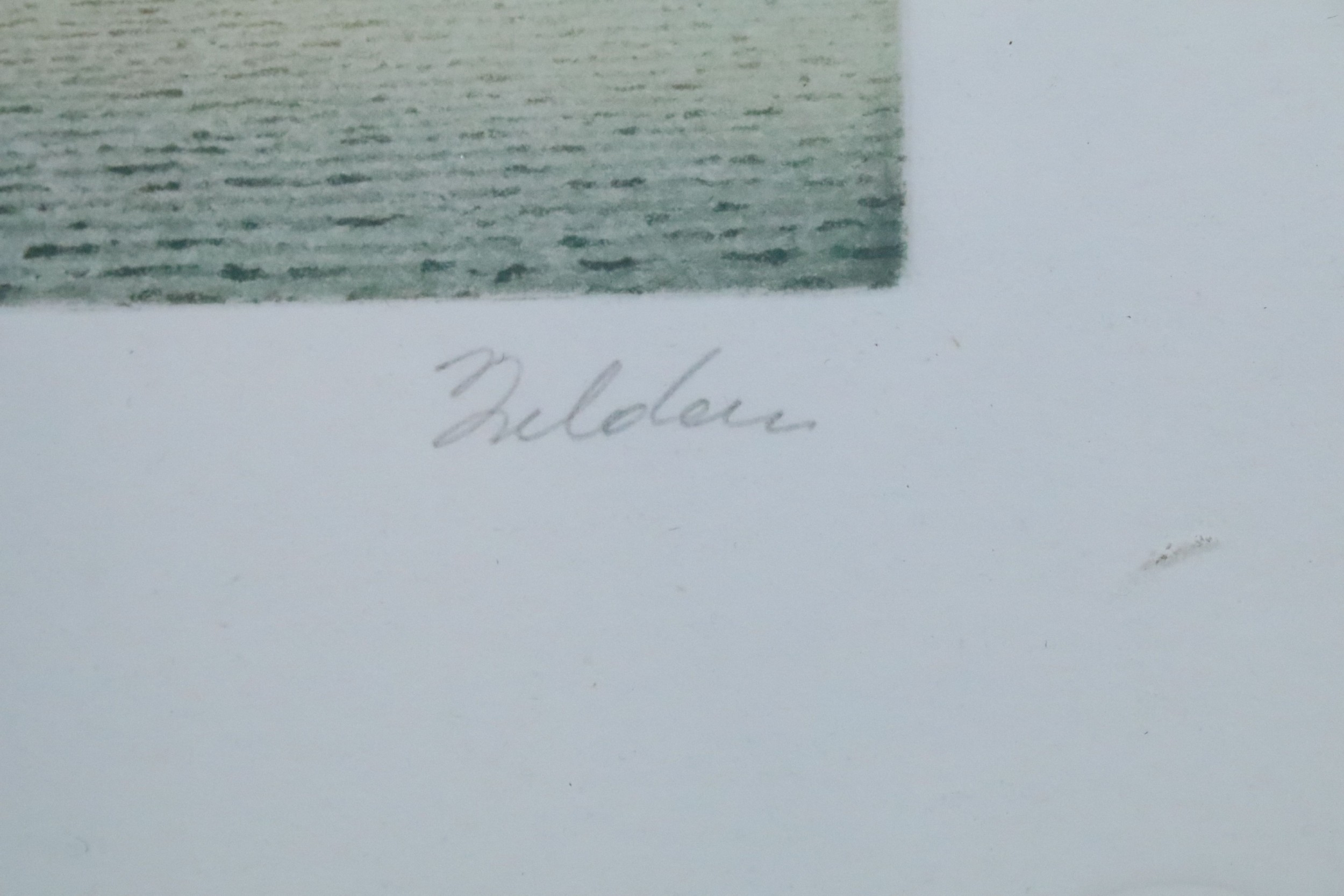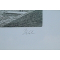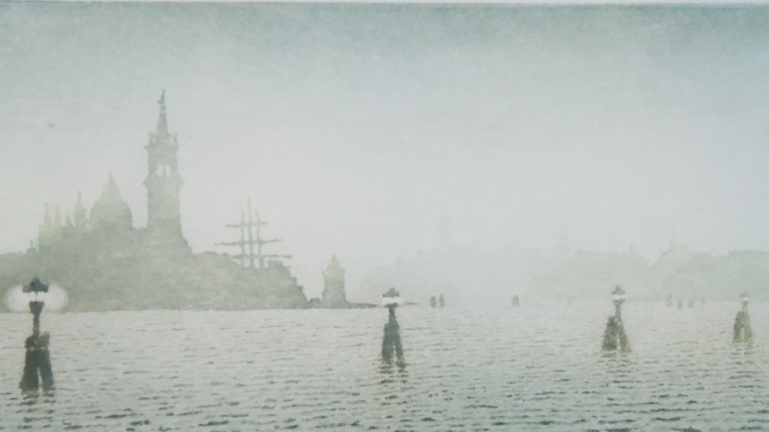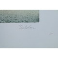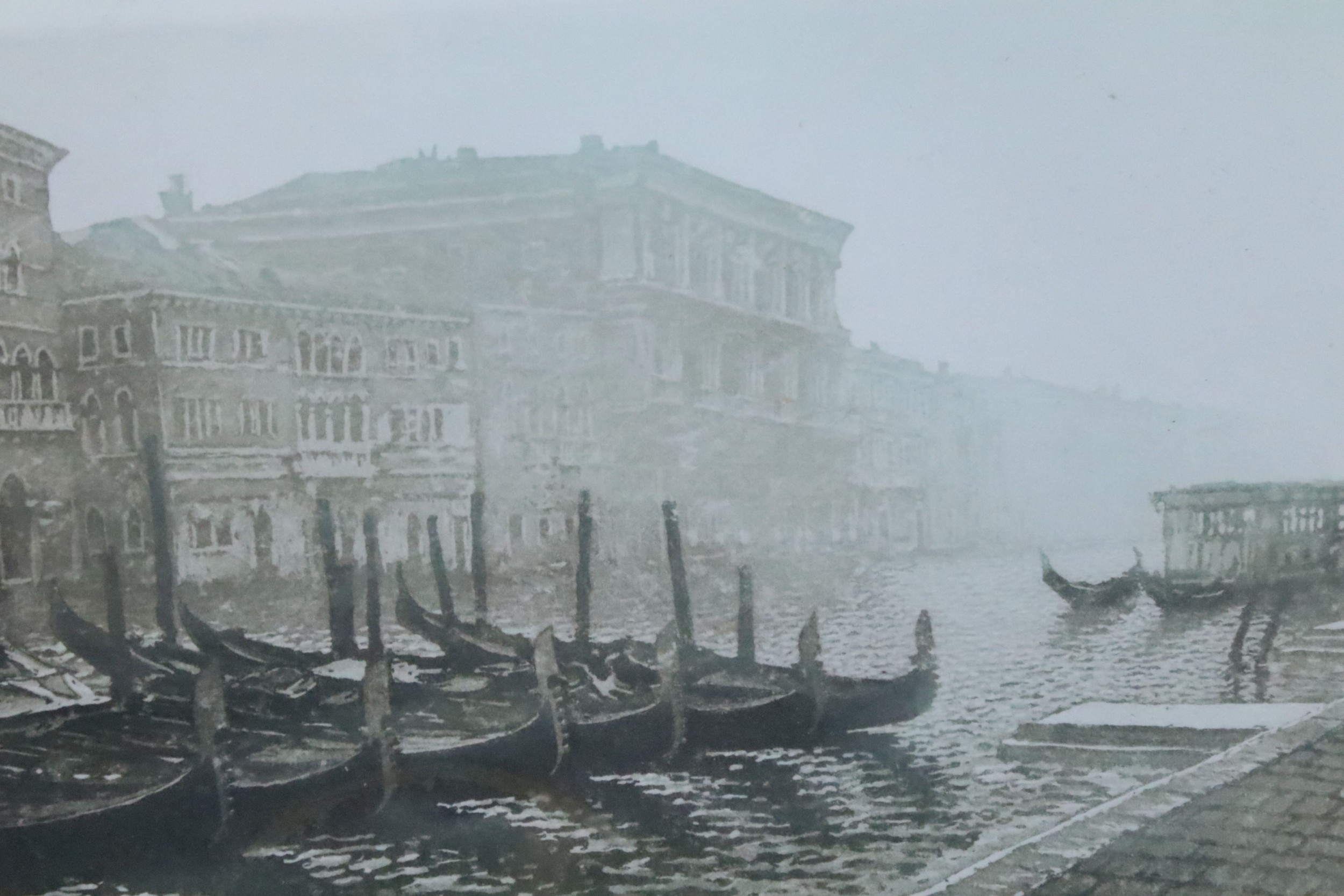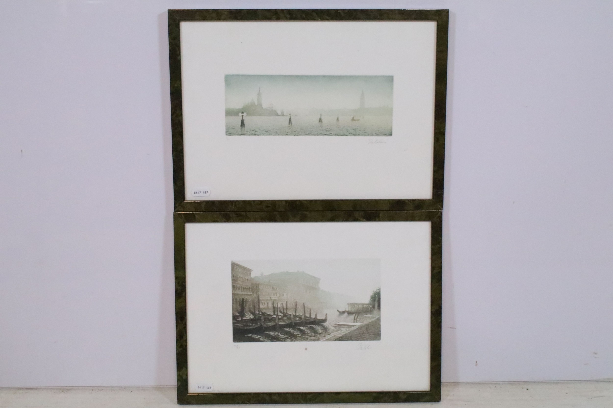 20th century Continental school, Venetian canal scene with a gondola station, limited edition etching, numbered lower left 18/40, indistinctly signed lower right, blind stamp lower right and another by the same hand, view of Venice Harbour from the sea, limited edition etching, numbered lower left 1/41, indistinctly lower right, blind stamp lower right, each 24 x 34cm, framed and glazed (2)