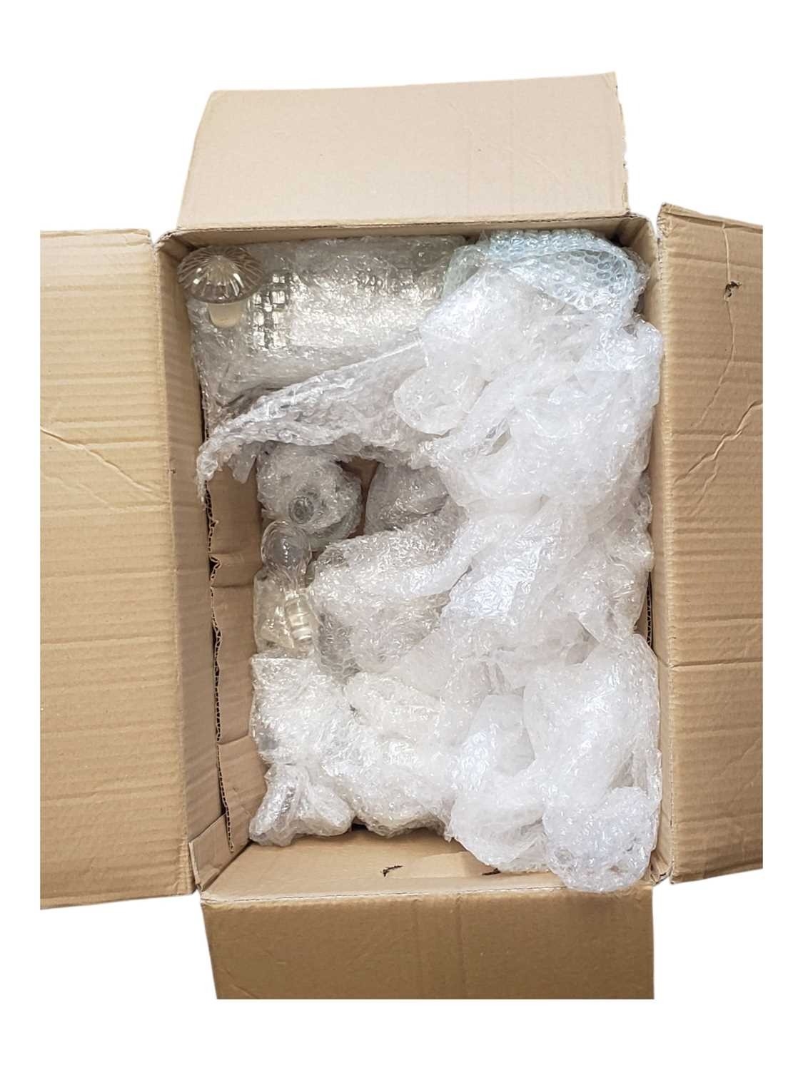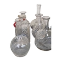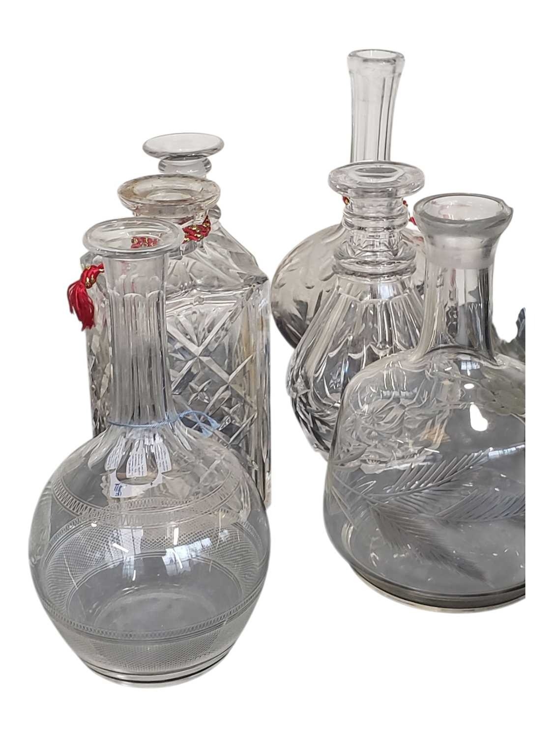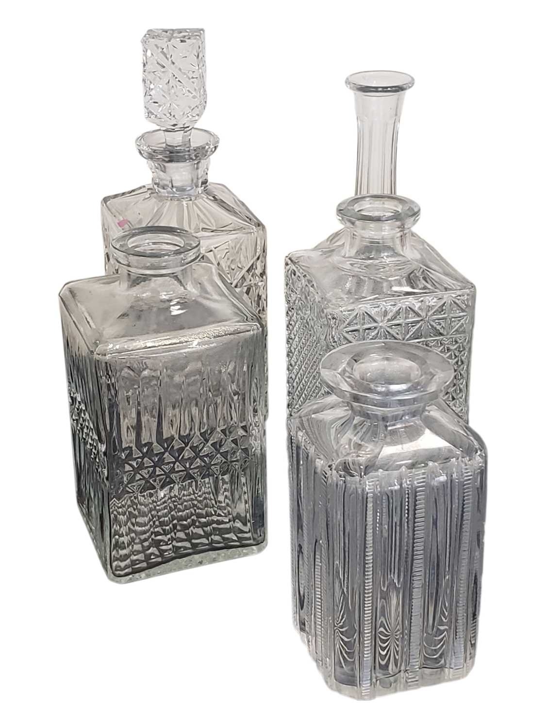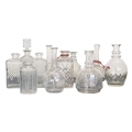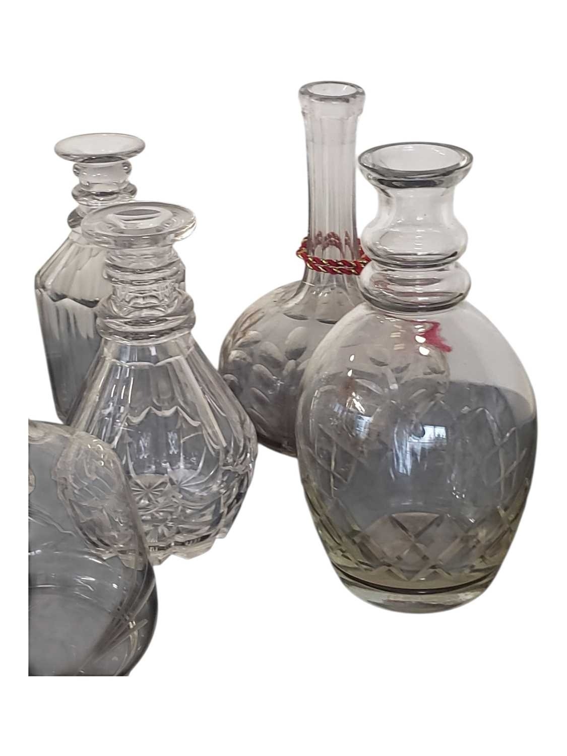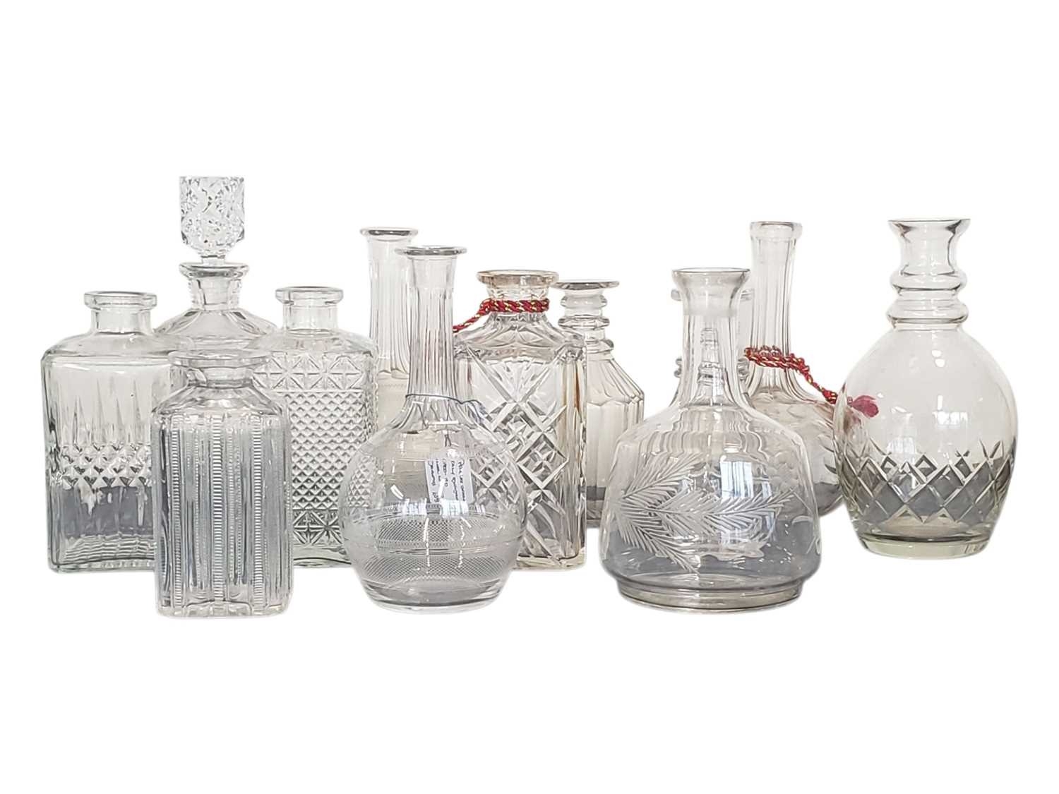 Collection of late 19th / 20th century vintage glass decanters and bottles. To include etched designs, crystal cut designs, facet cut designs, and more. Most including their stoppers.