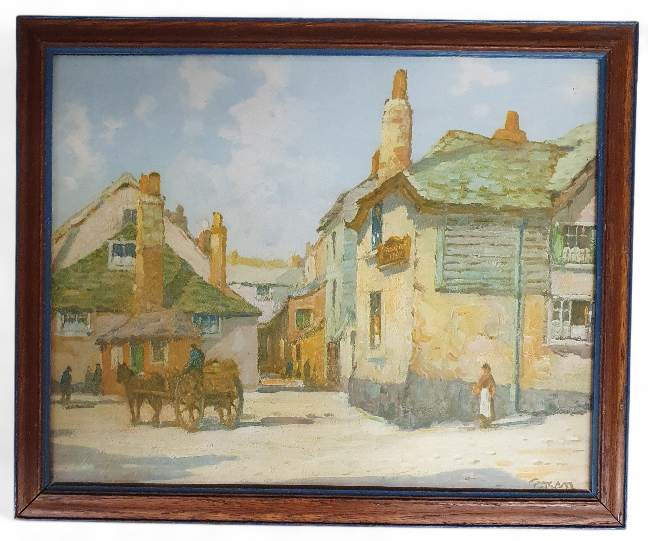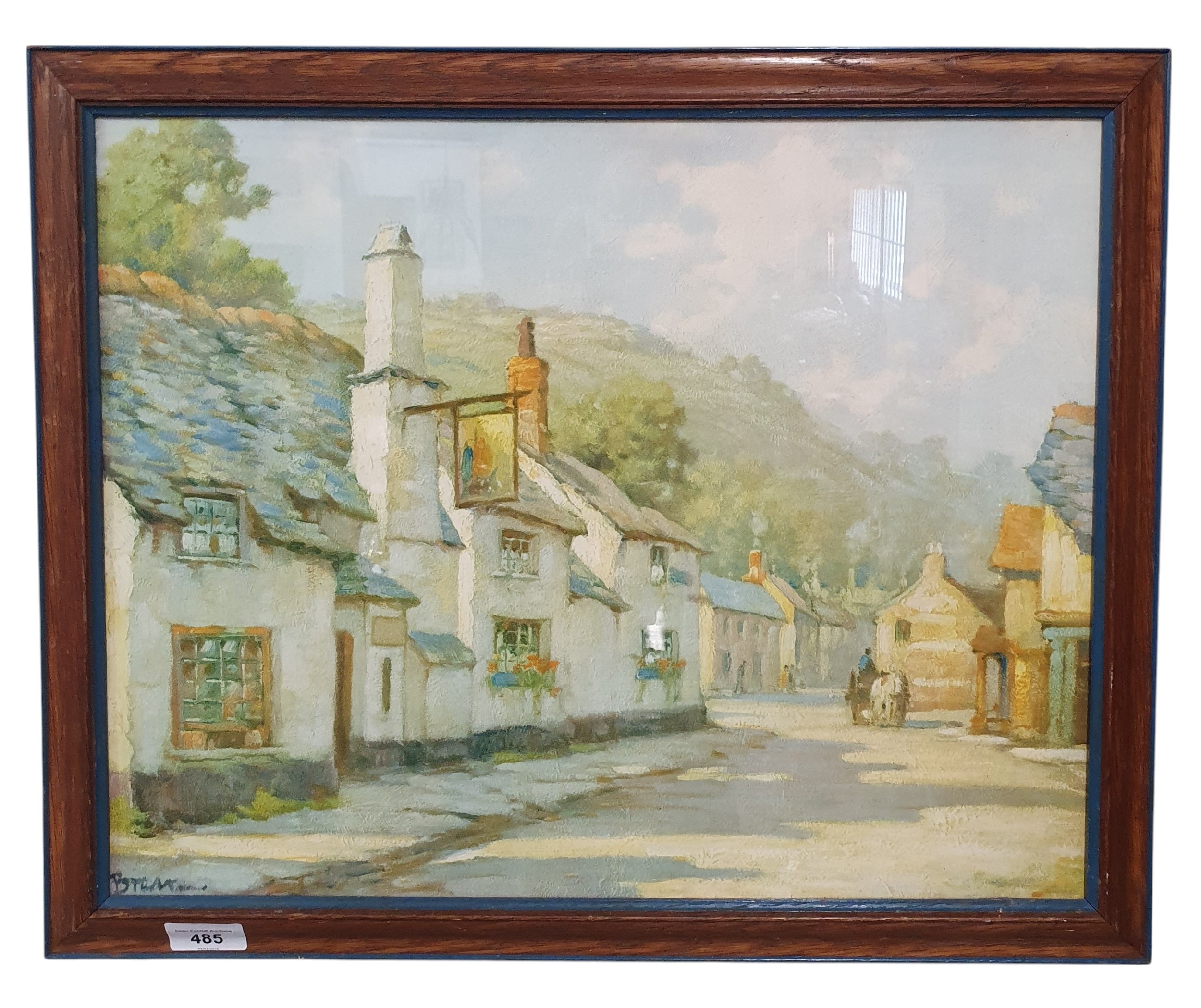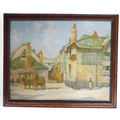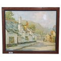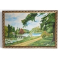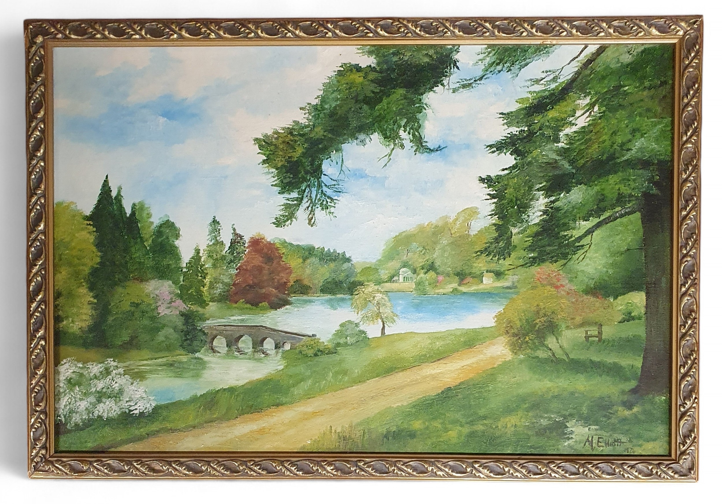 Two coloured Prints of Town scenes along with an Oil on Board of a River Scene which may be Stowe Gardens, signed M Elliot.