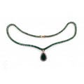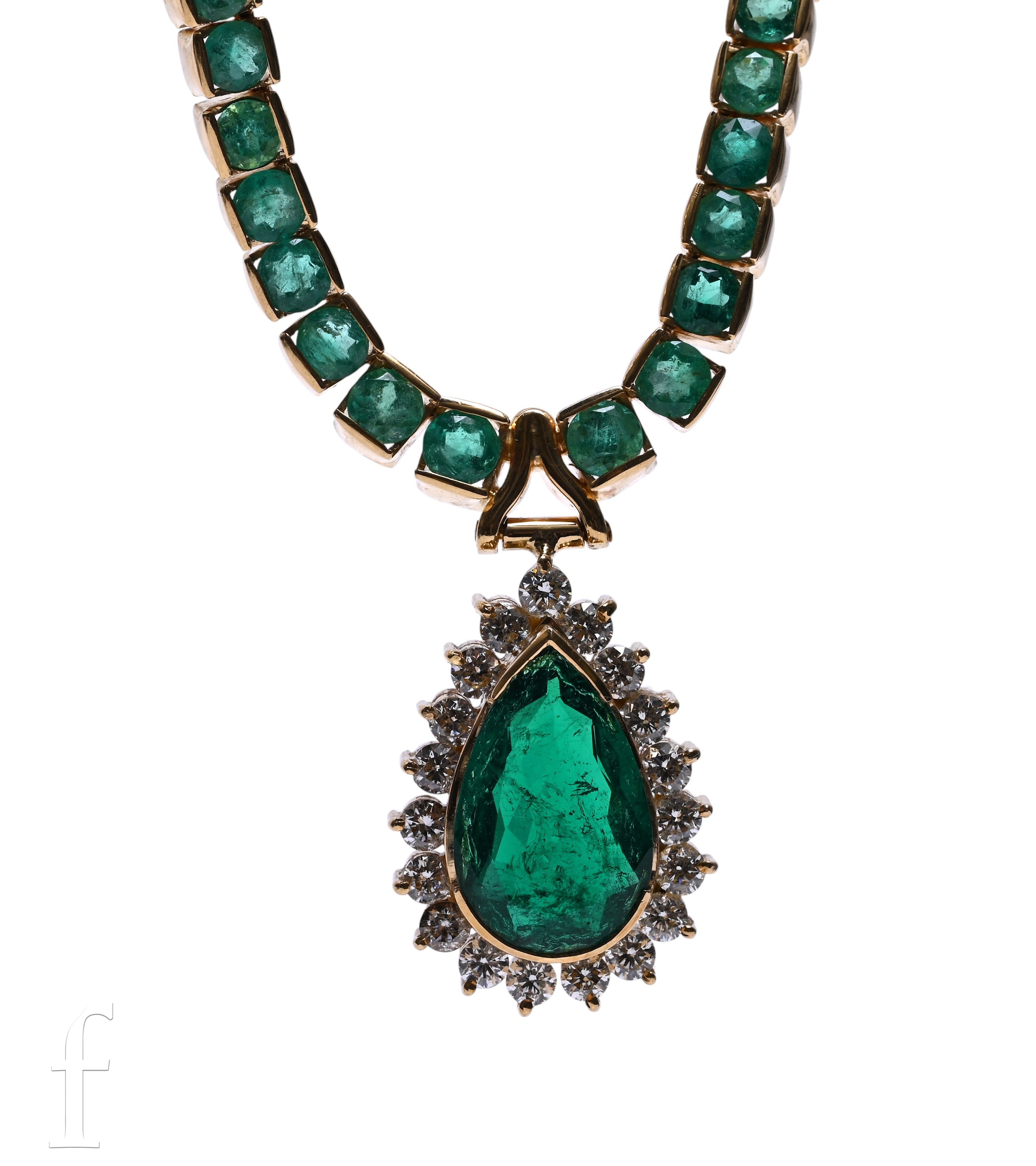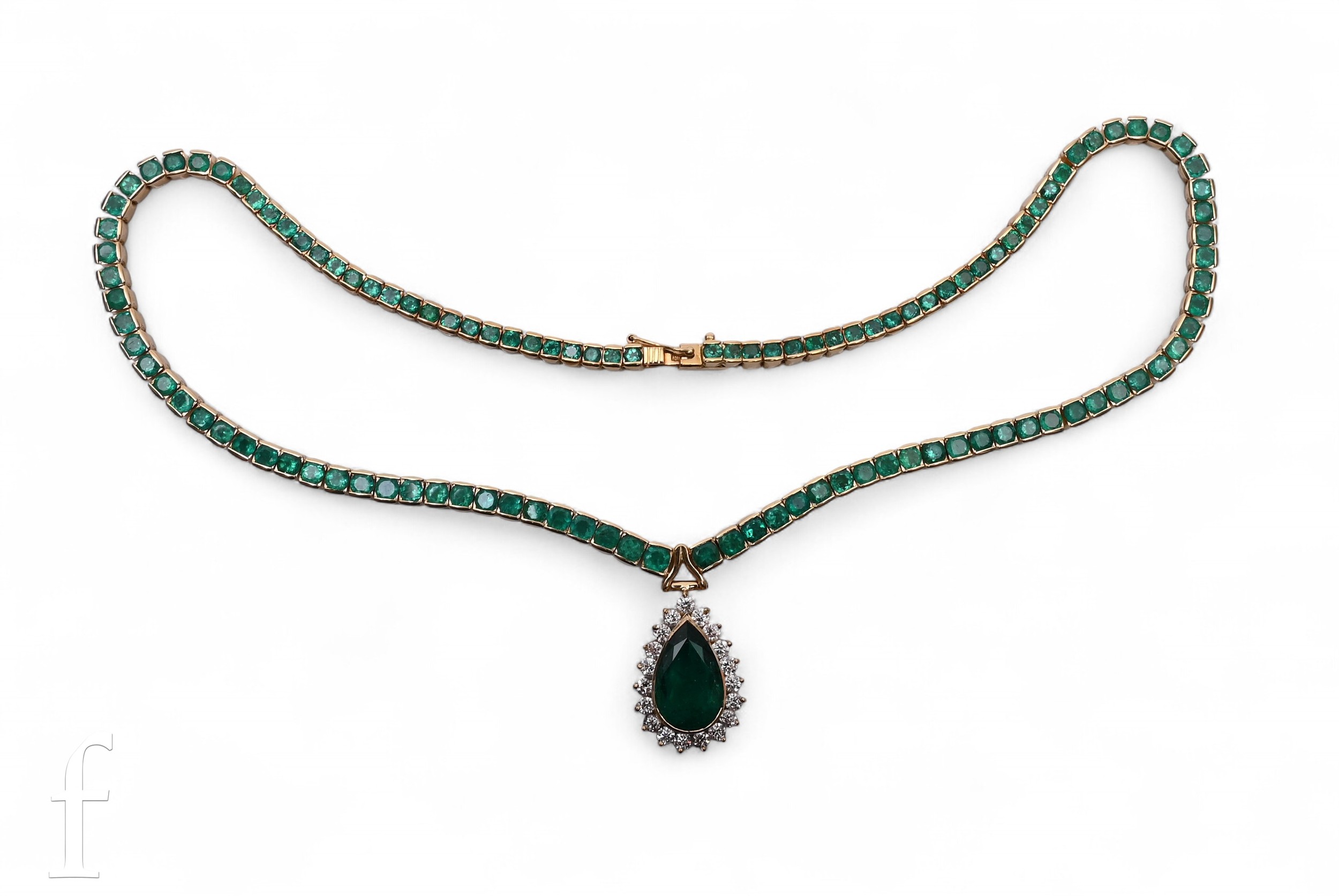 An emerald and diamond necklace, the pear-cut emerald claw set within a surround of nineteen brilliant-cut diamonds on a riviere of one hundred and fourteen slightly graduating circular mixed-cut emeralds, all mount in rub over settings, with integral clasp, marked '18K', total weight 37.1g, pendant measures 2.1cm x 1.5cm, necklace is 39cm long including clasp,