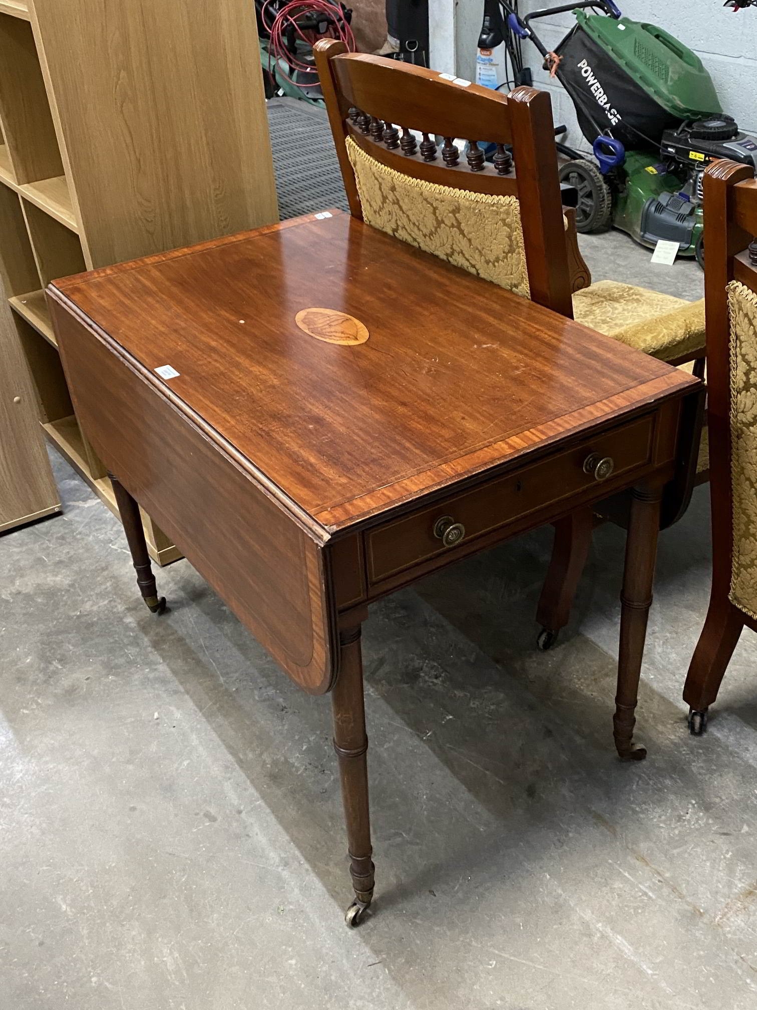 Victorian mahogany inlaid Pembroke table with one drawer 72H 92W 59-112D