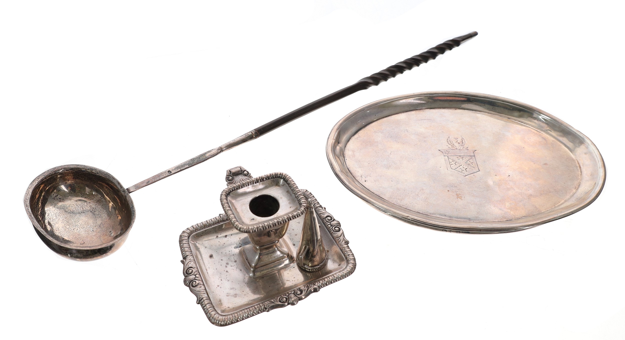 Small George III silver chamberstick and snuffer, with shell handle and gadroon border, together with a punch ladle with whalebone handle and an oval teapot stand with wooden base (3)