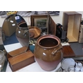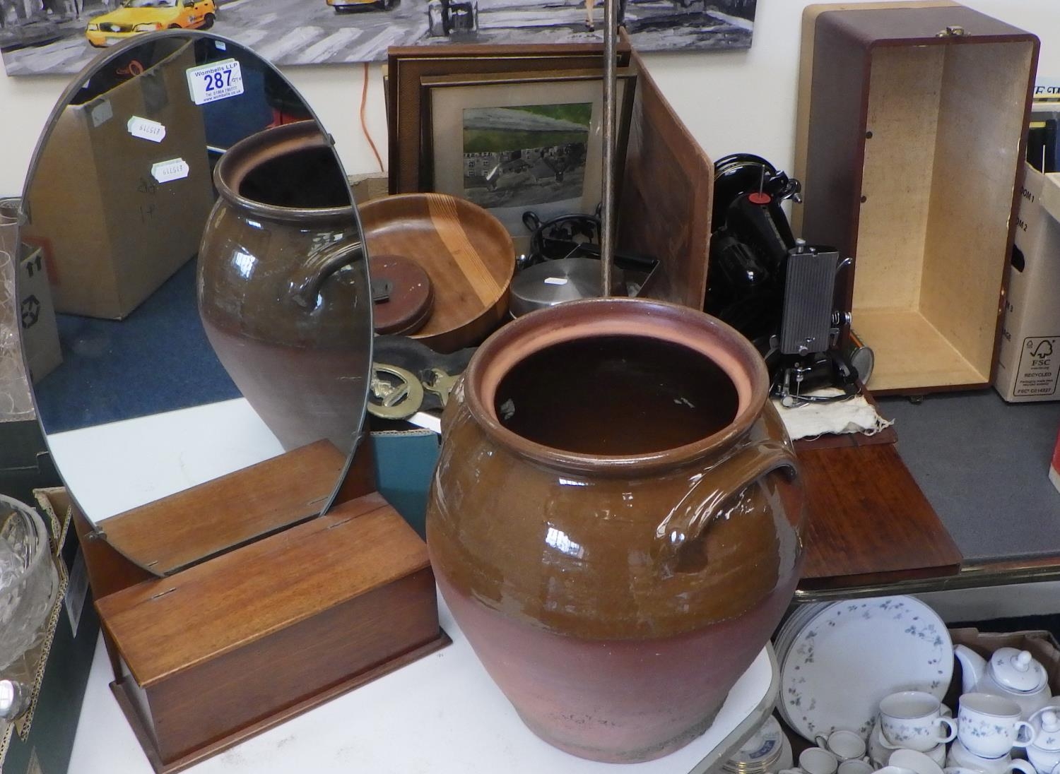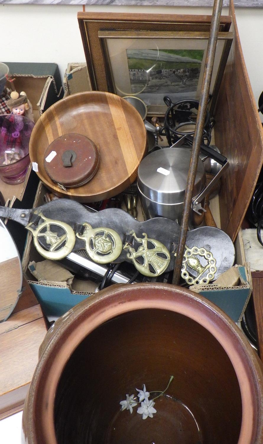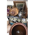 A quantity of misc to include table top Singer sewing machine [ Failed pat test, sold for parts], prints, vanity mirror, metal wares etc (qty)