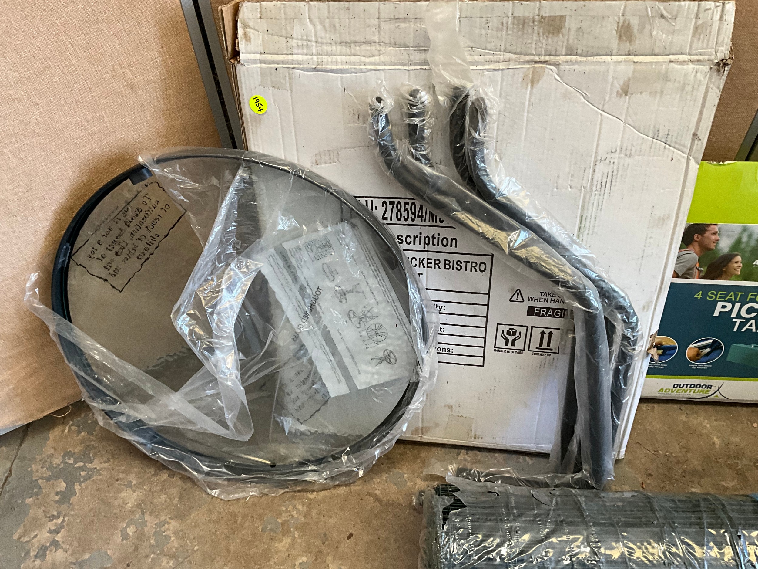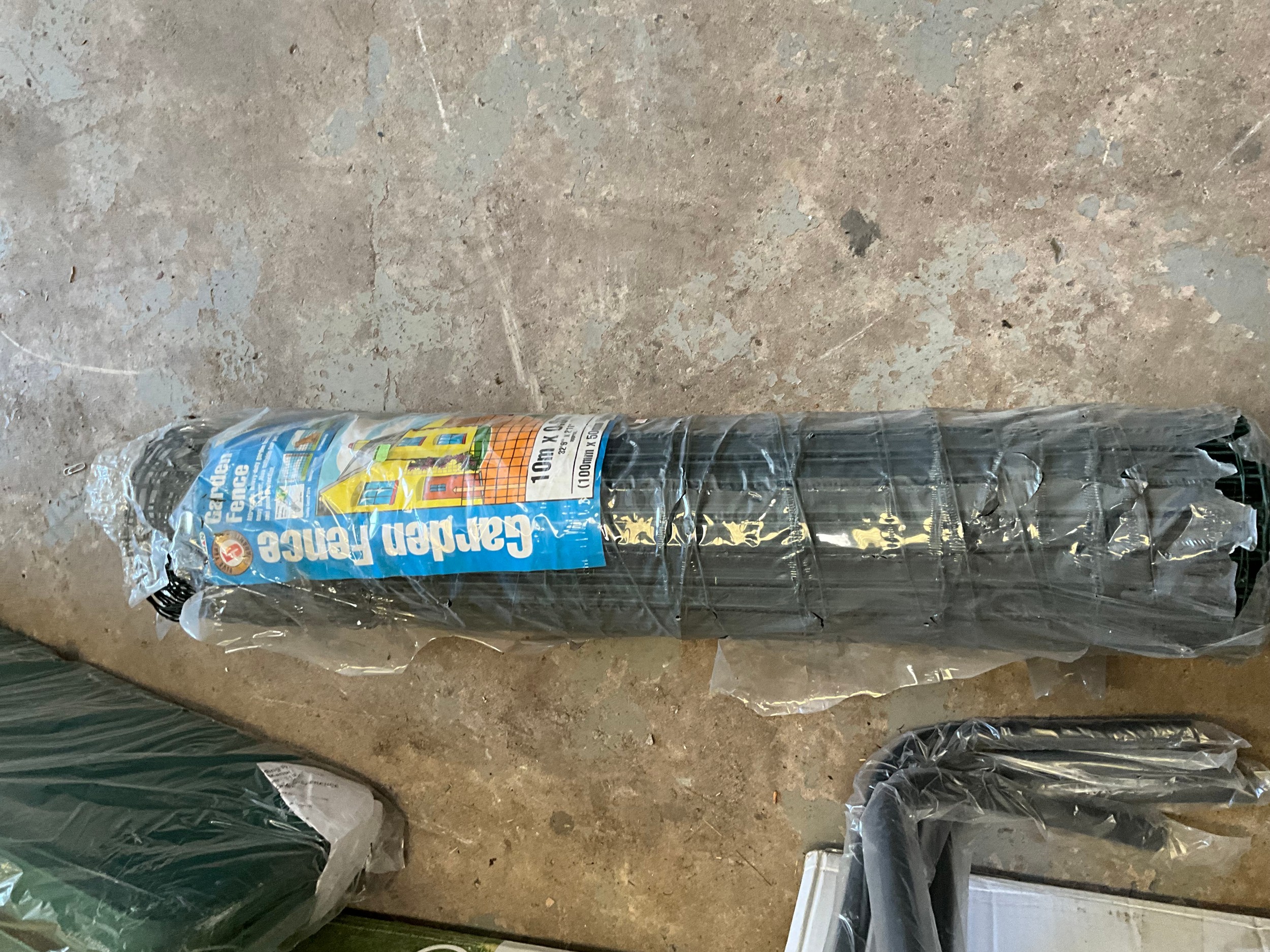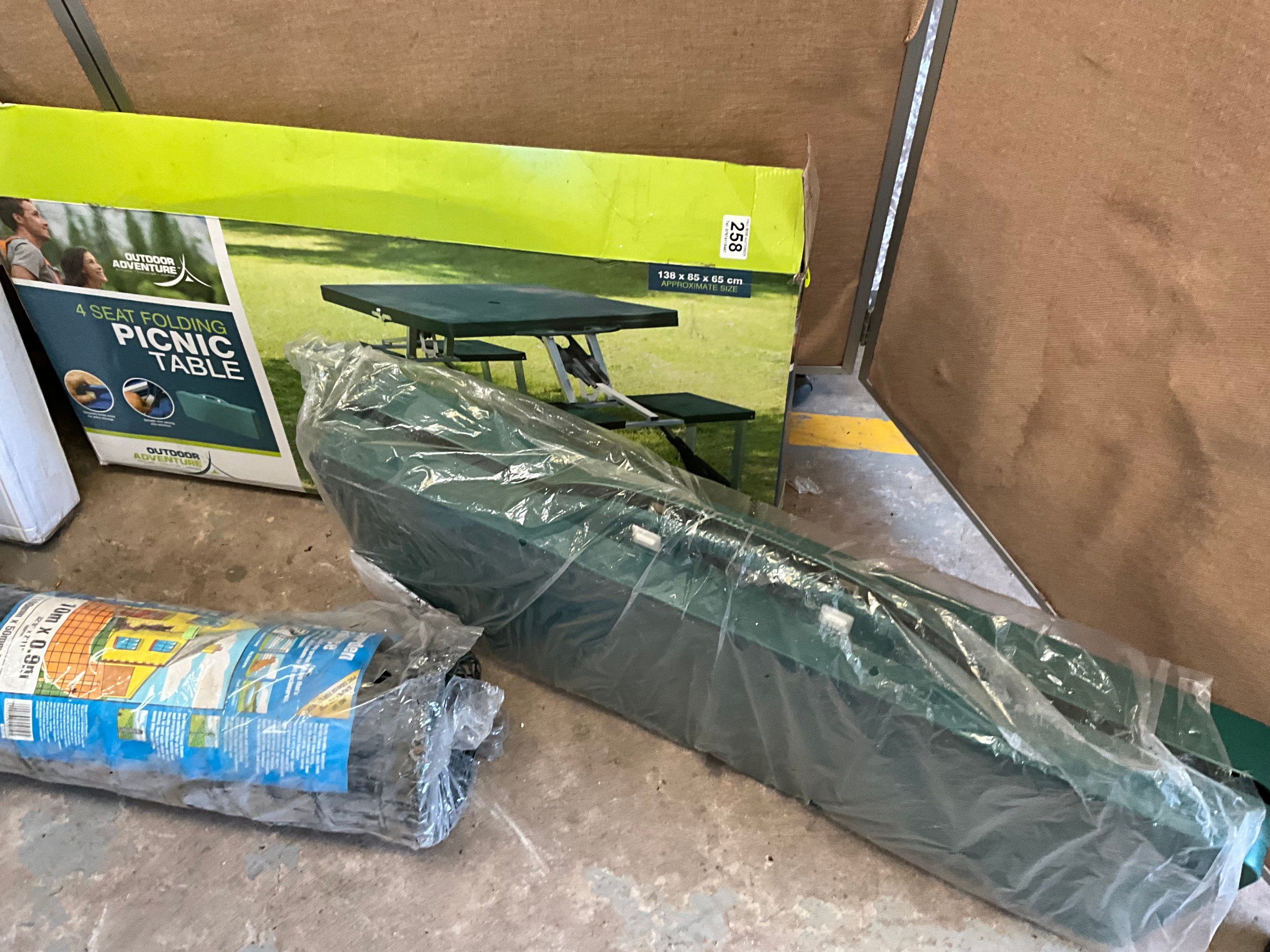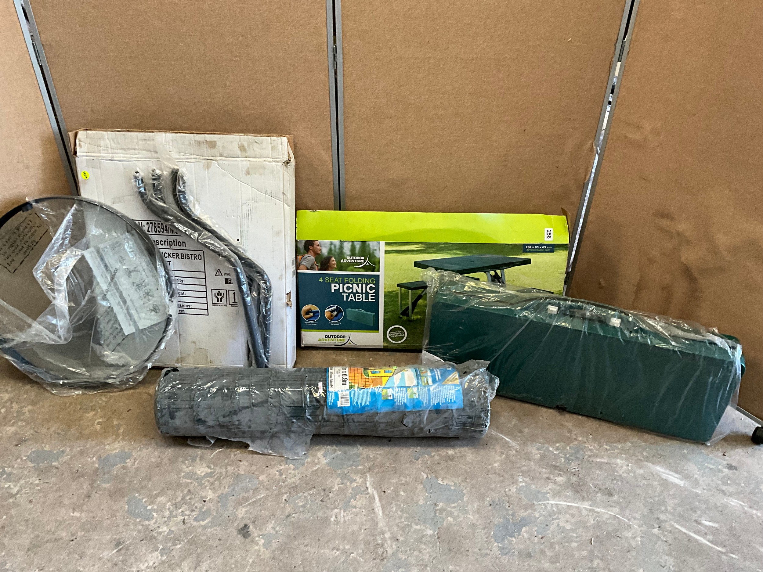 BOXED PATIO TABLE, FOLDING PICNIC TABLE AND ROLL OF GARDEN FENCING