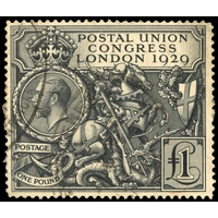 GB: 1929 £1 black Postal Union Congress, light central cds fine used. SG 438