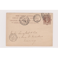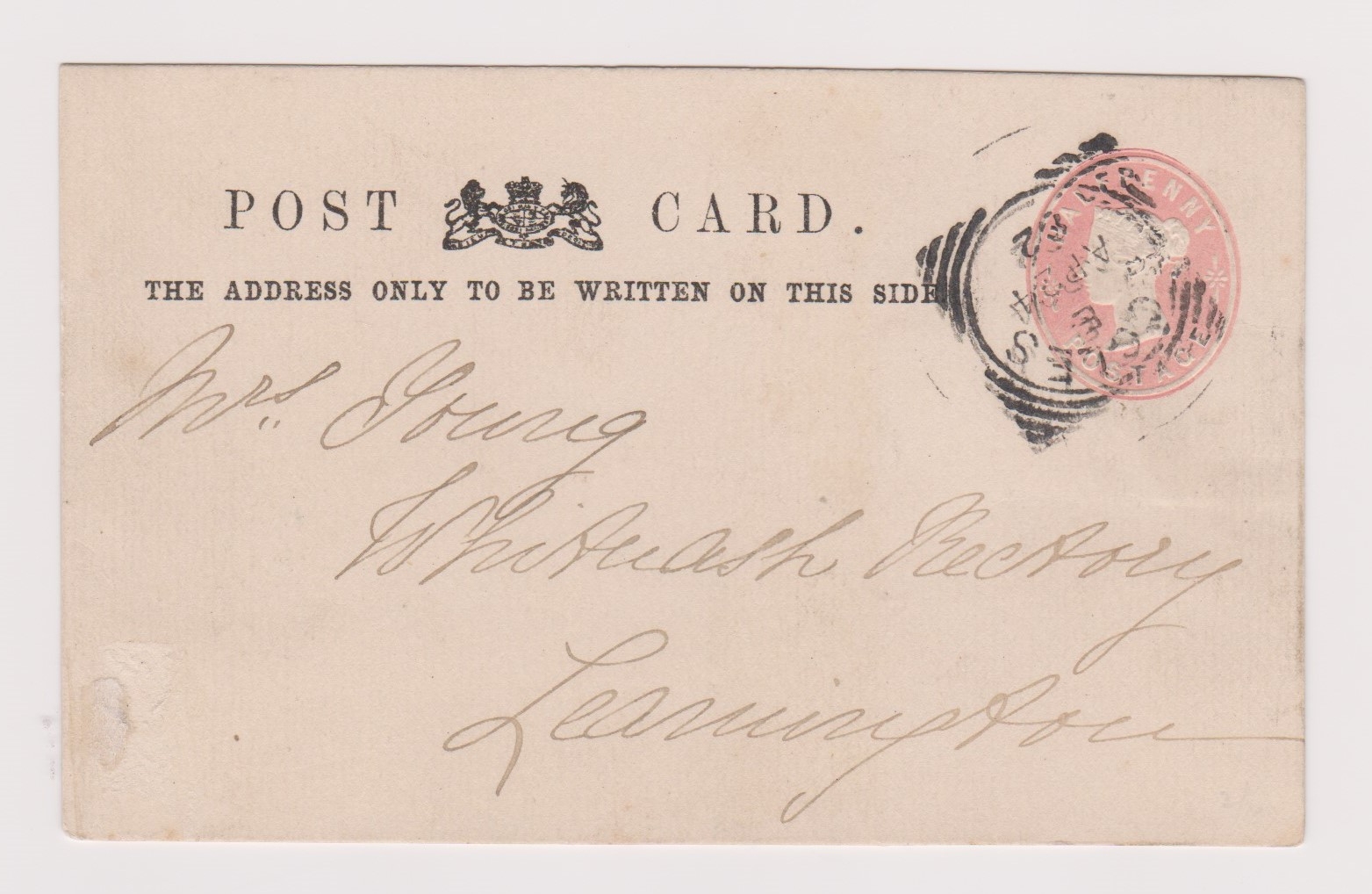 Great Britain 1882-prepaid Michel P5 postcard-posted to Leamington cancelled 24.4.1882 Beccles with squared cancel on 1.2d rose postage