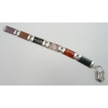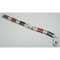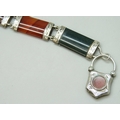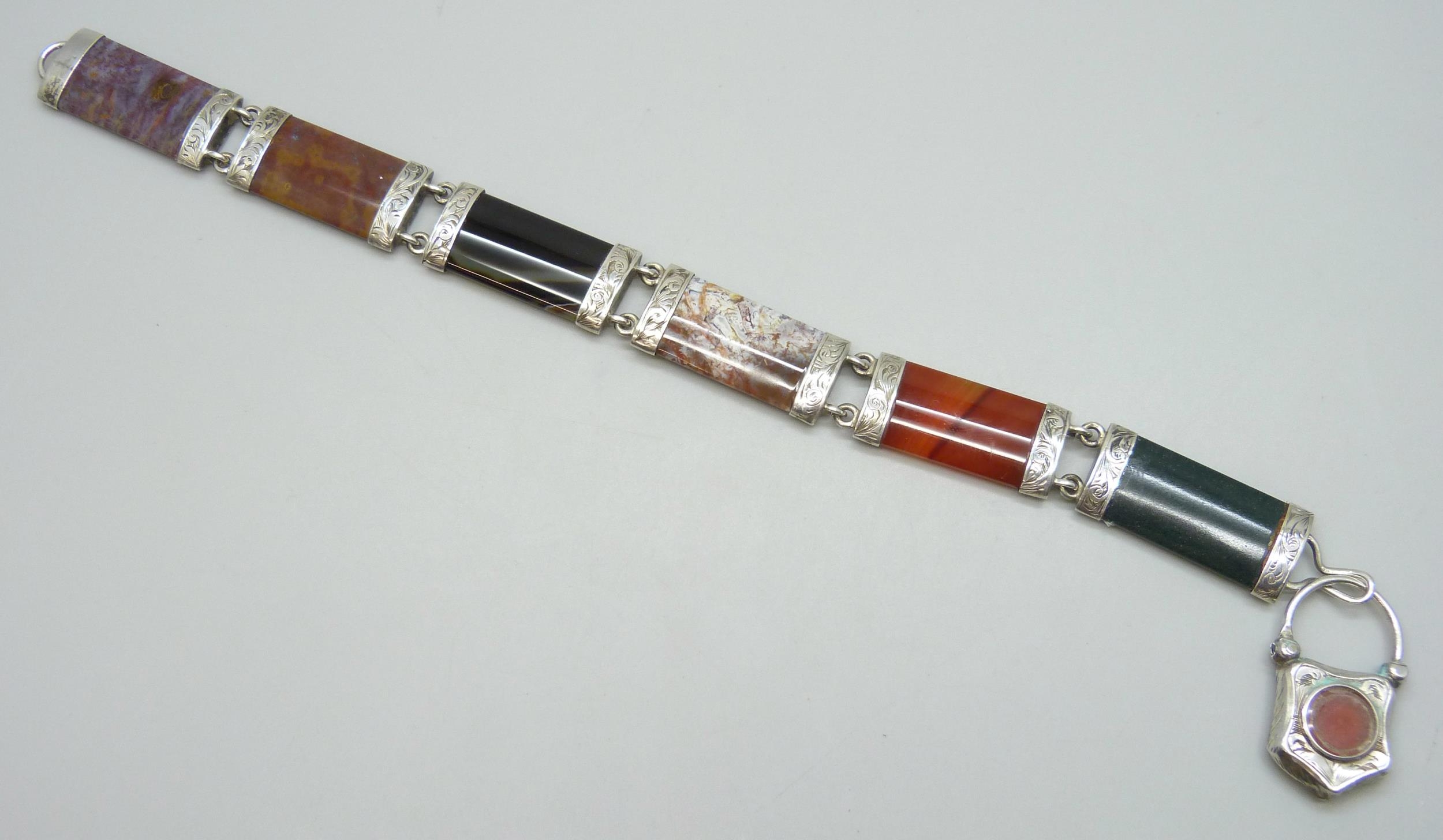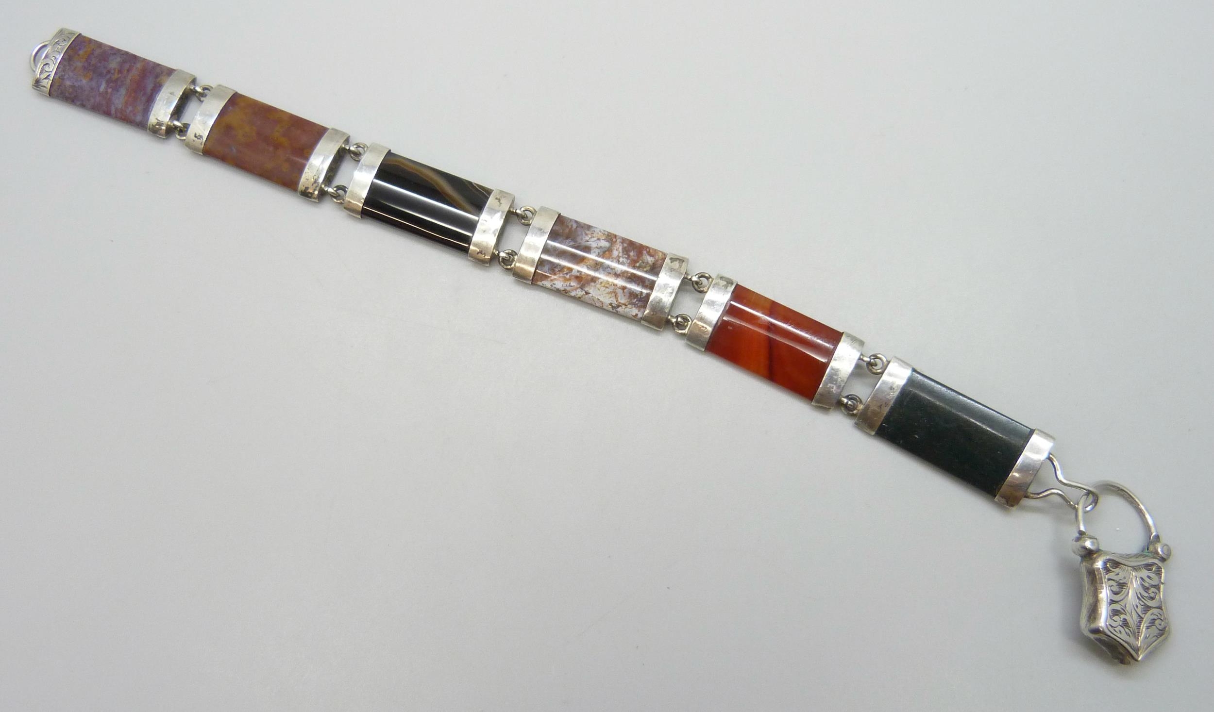 A Victorian Scottish white metal panel bracelet set with agate and with a heart padlock clasp, some glue residue, 22.5cm, 36g
