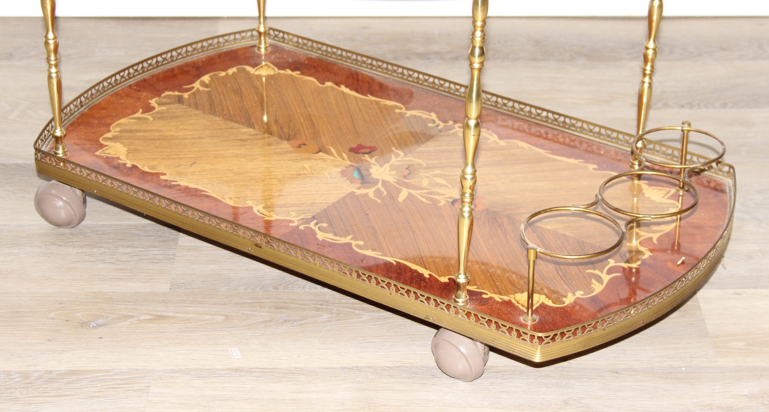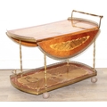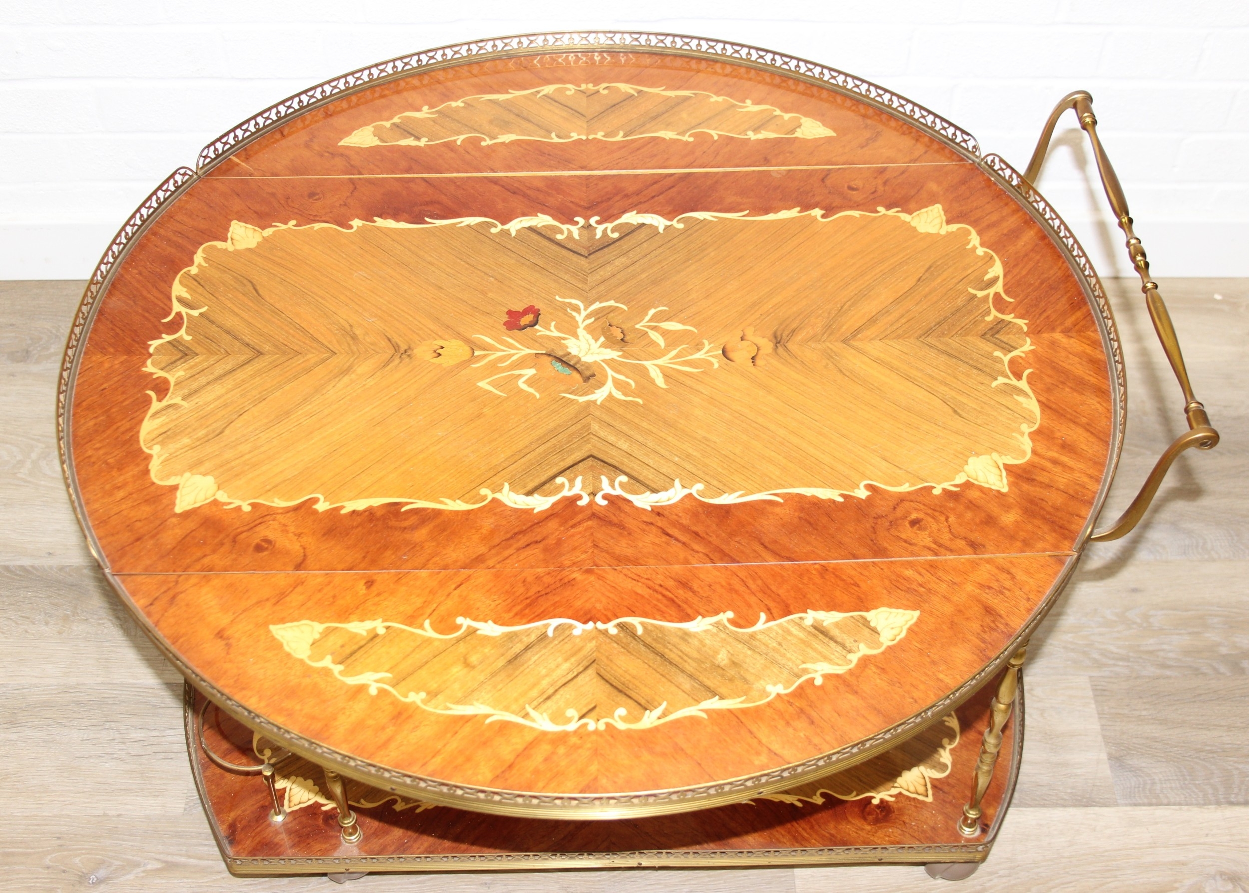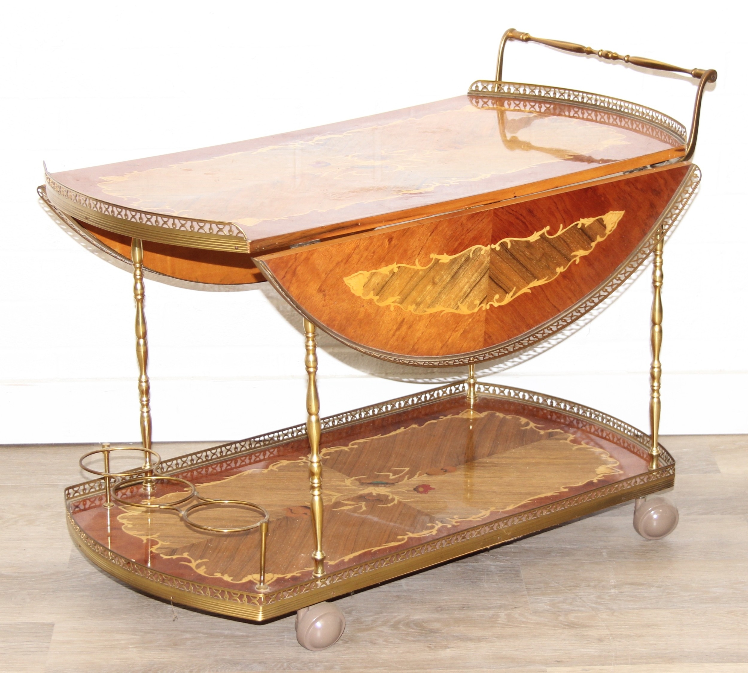 A mid-century Italian marquetry inlaid serving trolley, top loose, 43cm raising to 81cm x 80cm x 62cm