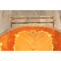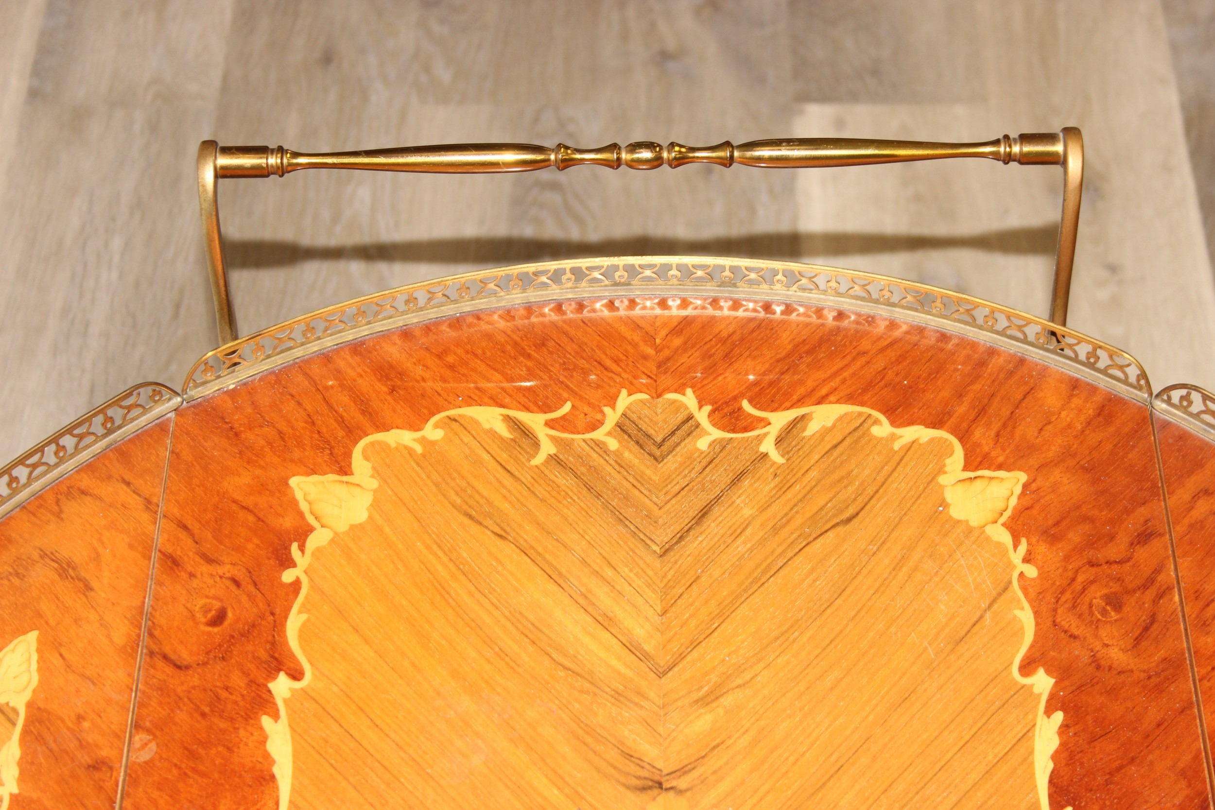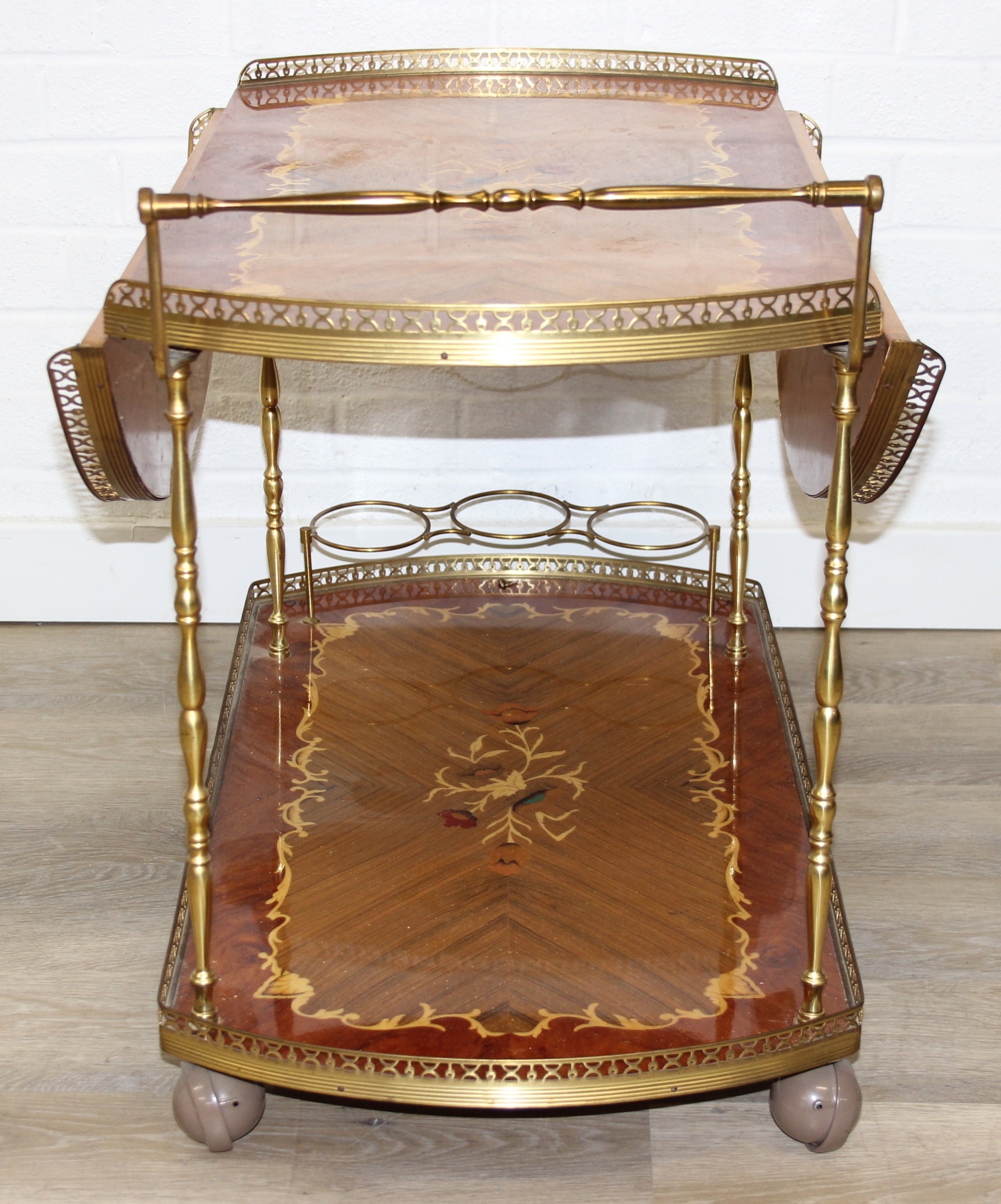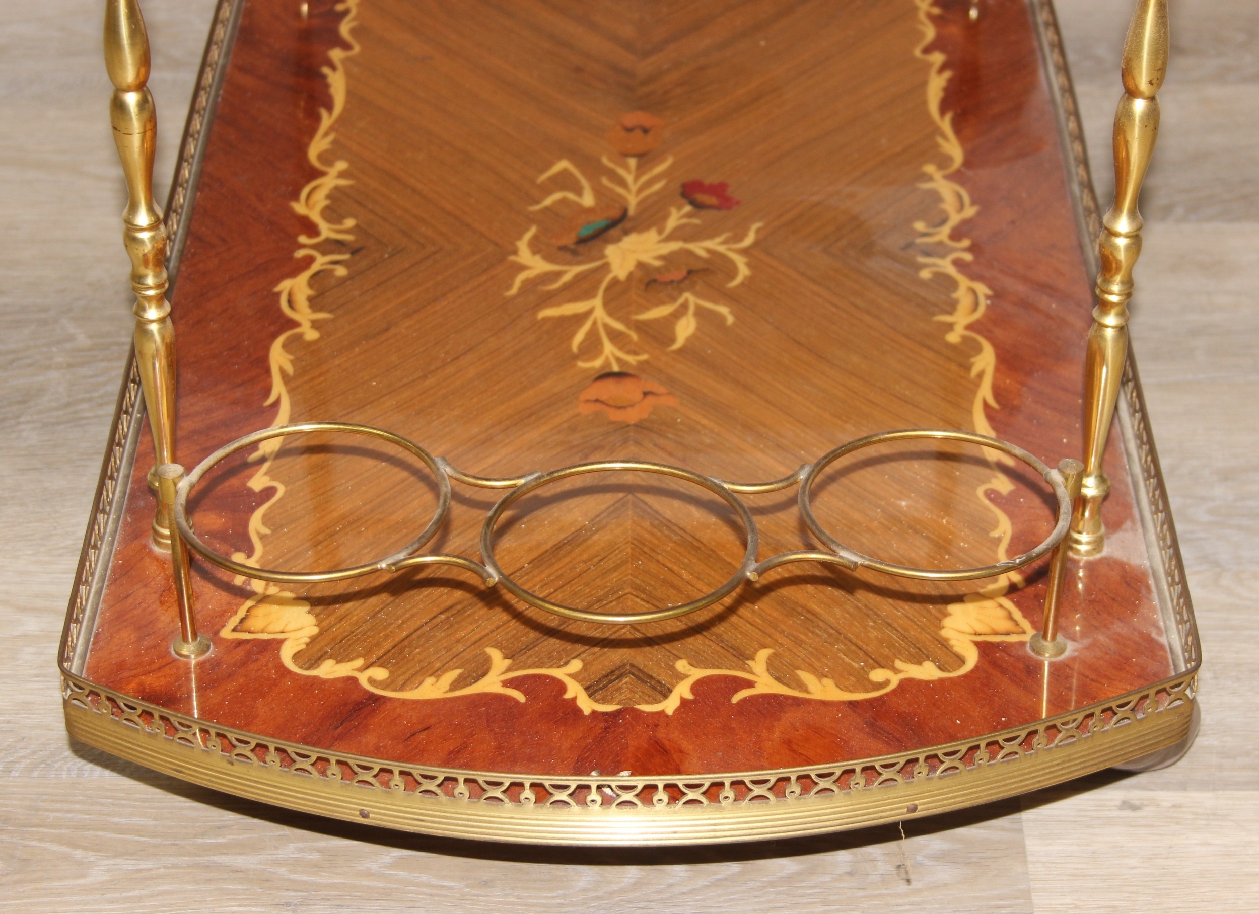 A mid-century Italian marquetry inlaid serving trolley, top loose, 43cm raising to 81cm x 80cm x 62cm