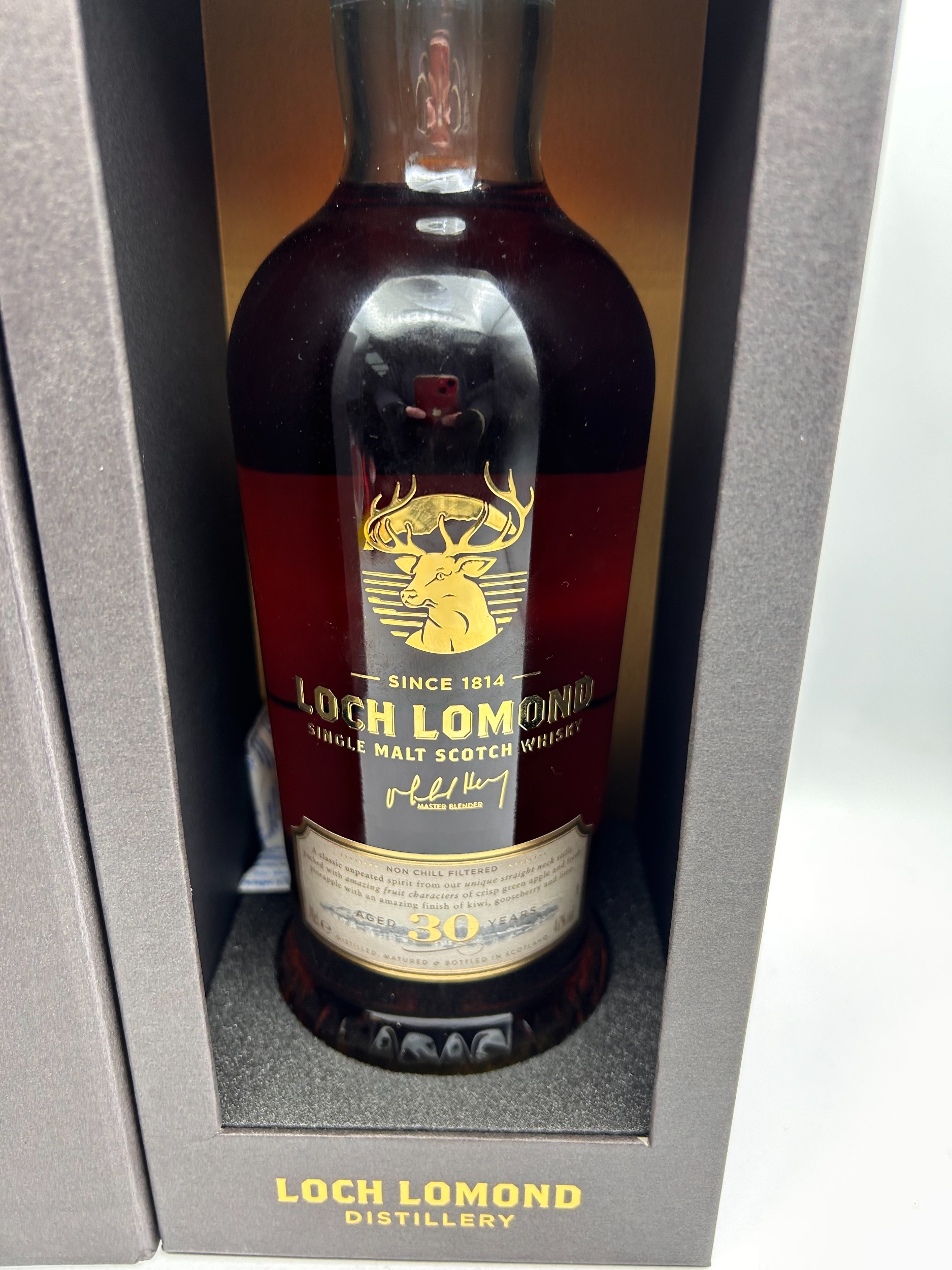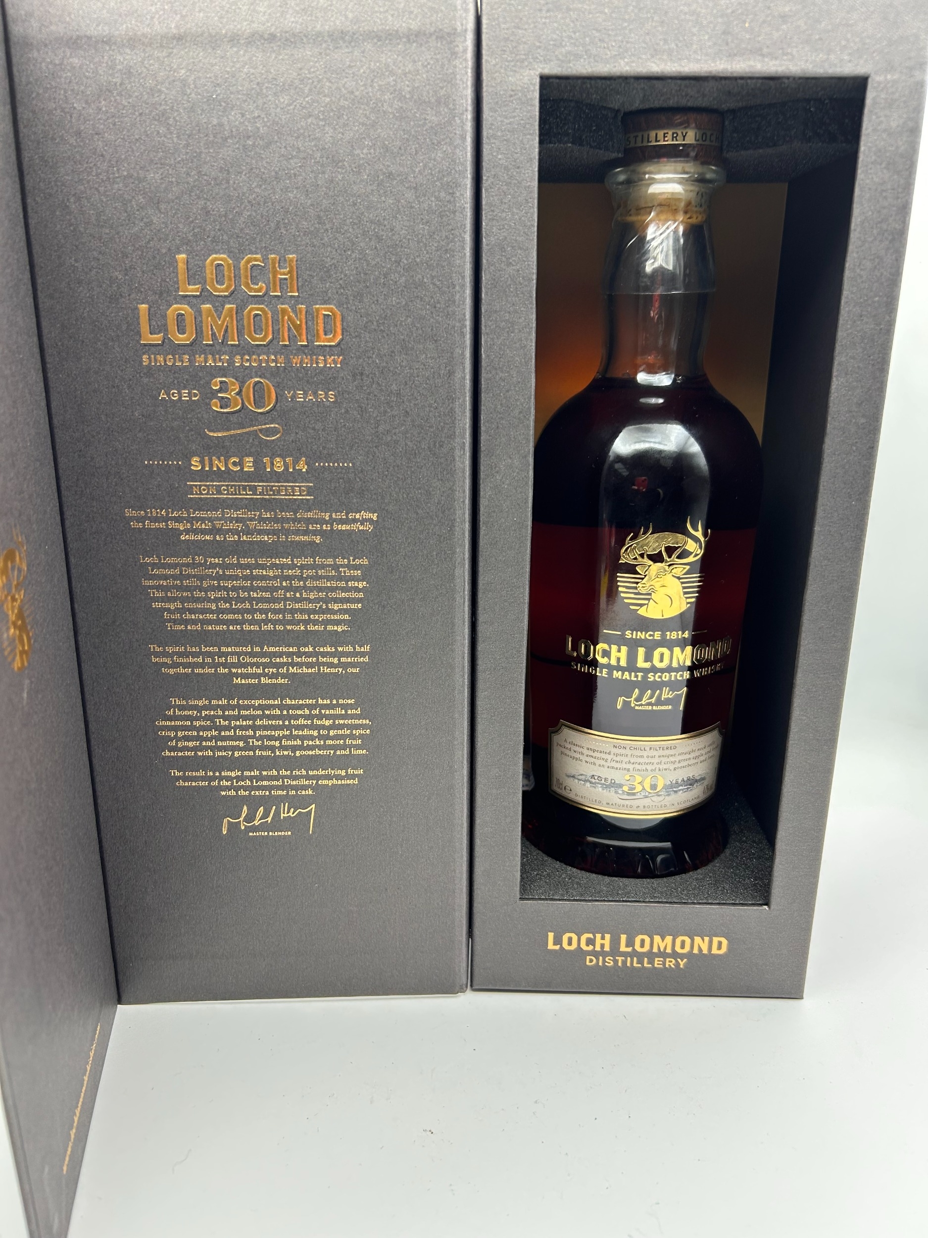 A single bottle of Loch Lomond 30 Year Old Single Malt Scotch Whisky. The spirit is presented in a dark reddish-brown glass bottle featuring a gold foil label decorated with a prominent stag head emblem. The bottle is housed in its original, hinged, dark charcoal-grey presentation case. The packaging text confirms the product is a Single Malt Scotch Whisky, Non Chill Filtered, and carries the signature of Master Blender Michael Henry. The description on the case notes that the spirit was matured in American oak casks with half being finished in 1st fill Oloroso casks.