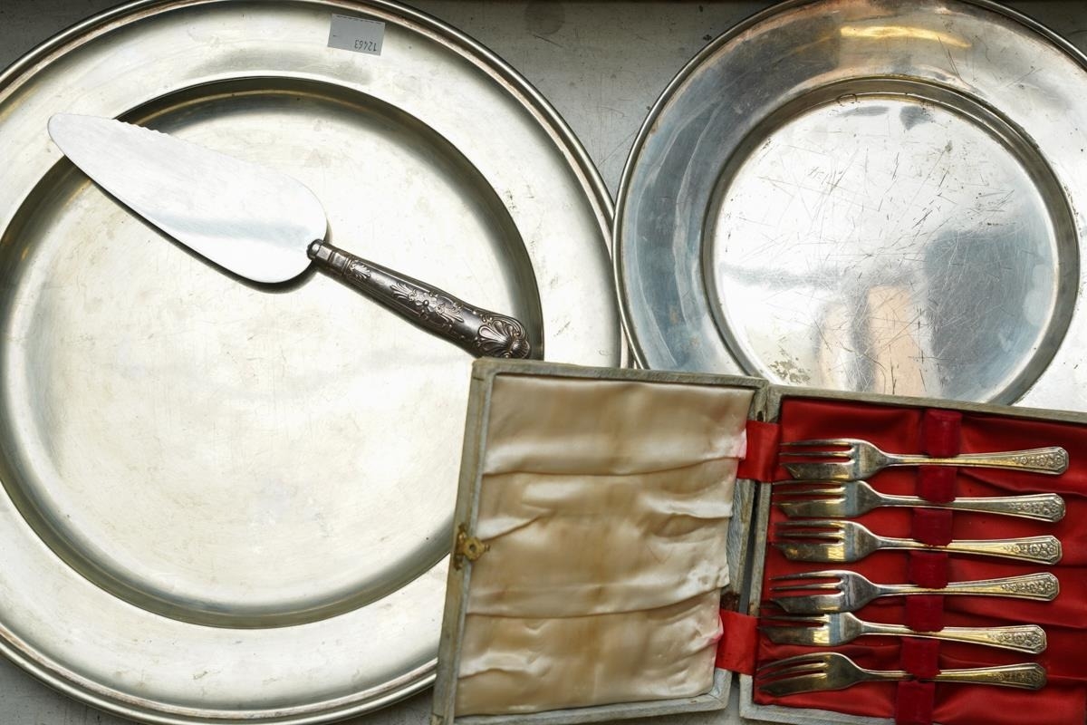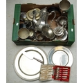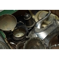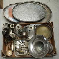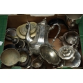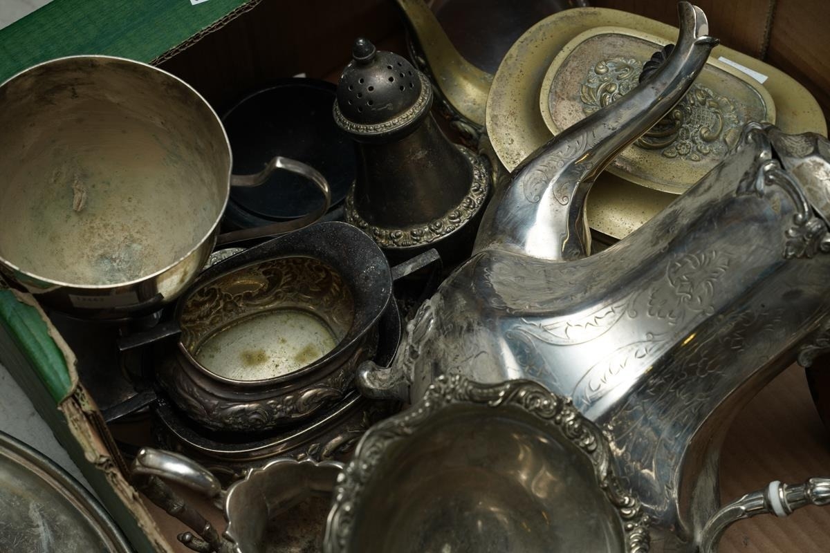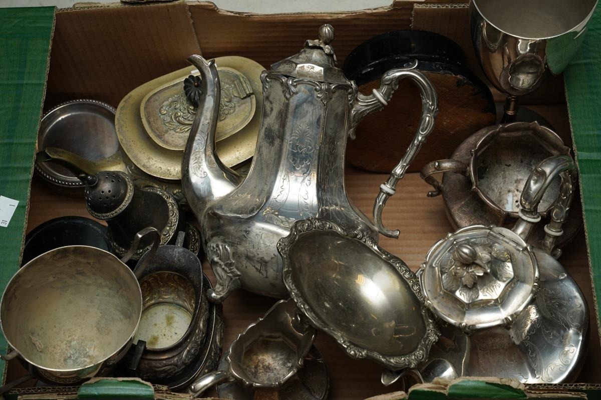 Assorted silver plate, EPNS, EP to include circular serving dishes, large goblet, two handled trophy, three piece tea set, four piece tea and coffee set, caster, boxed pastry forks, bon-bon dishes etc [1 box]
