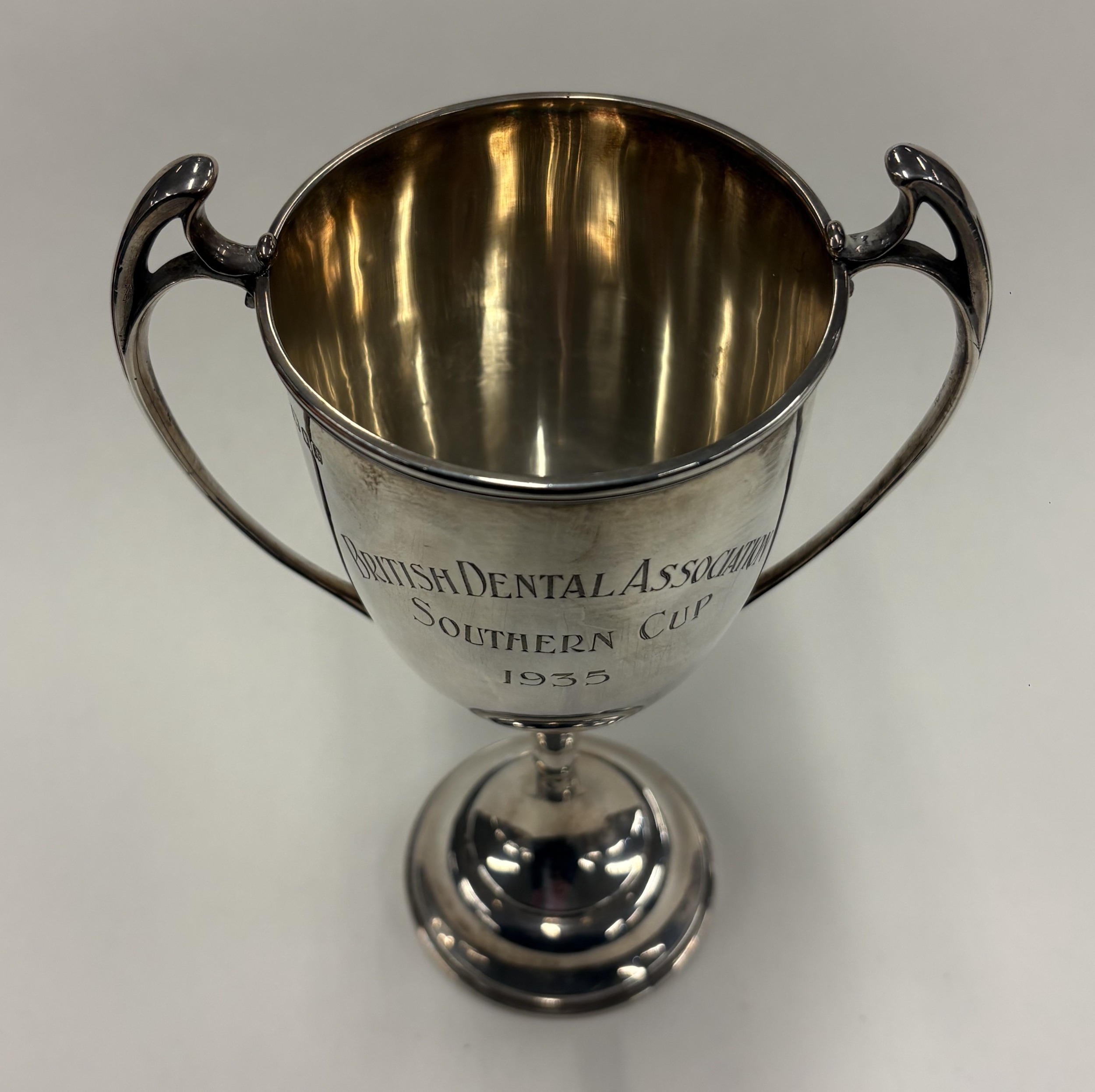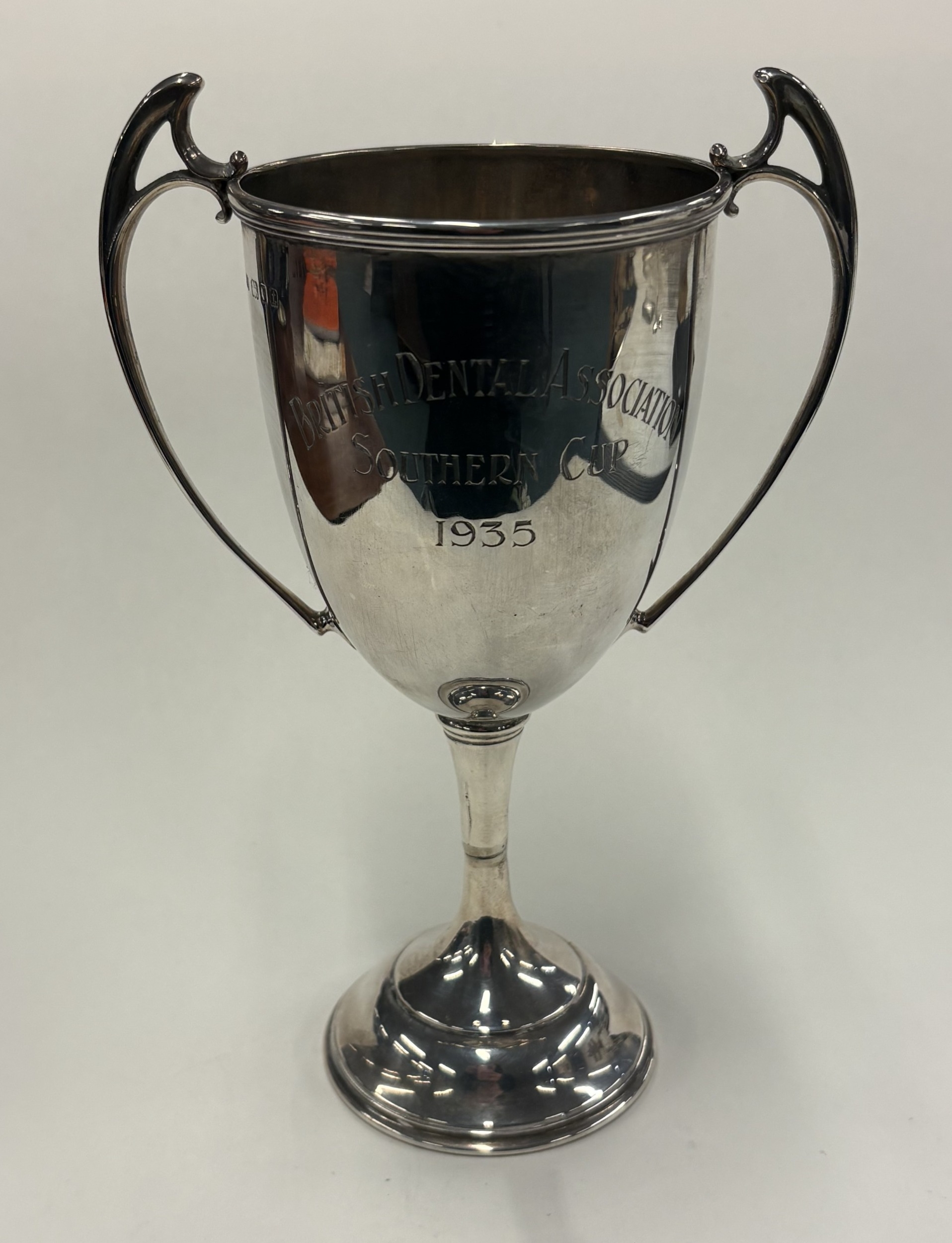 A plain George V silver two-handled cup inscribed 'British Dental Association Southern Cup 1935'. London 1934. By Robert Pringle & Sons. Approx. 186 grams. Est. £180 - £220.