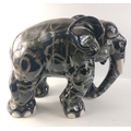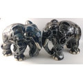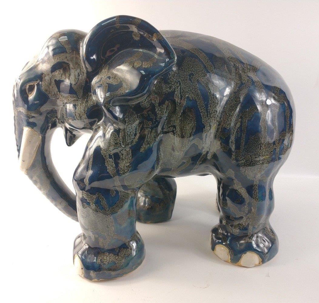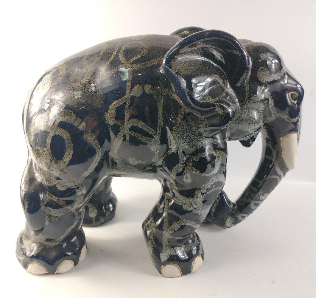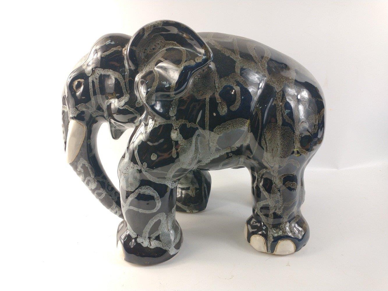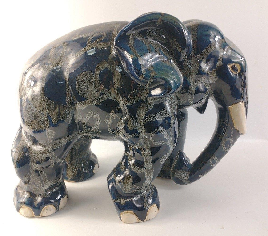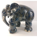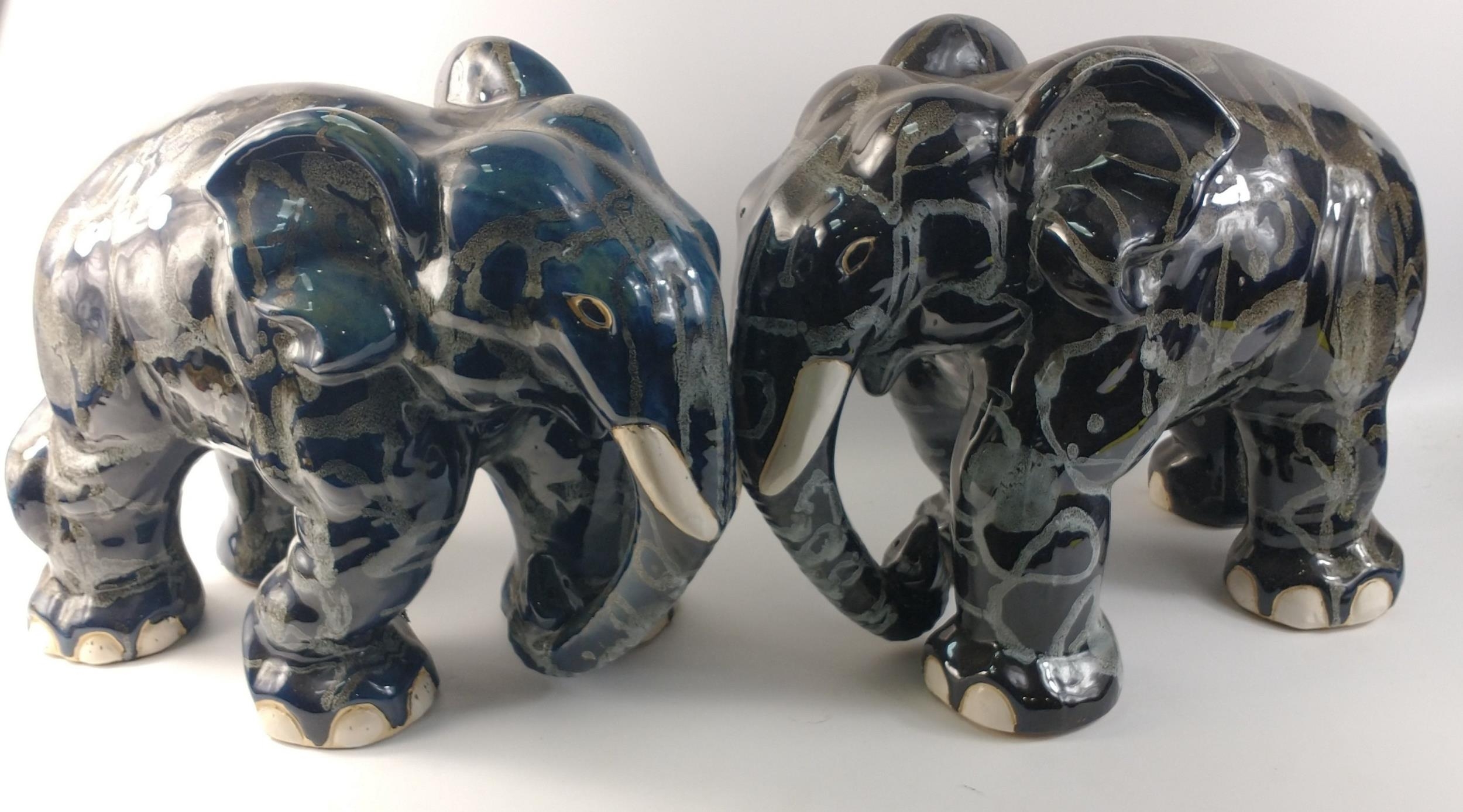 An unusually attractive pair of ceramic elephants glazed in colours of blue/grey/black with random grey textured patterning. Approx. L50cm x W28cm x H37cm.