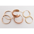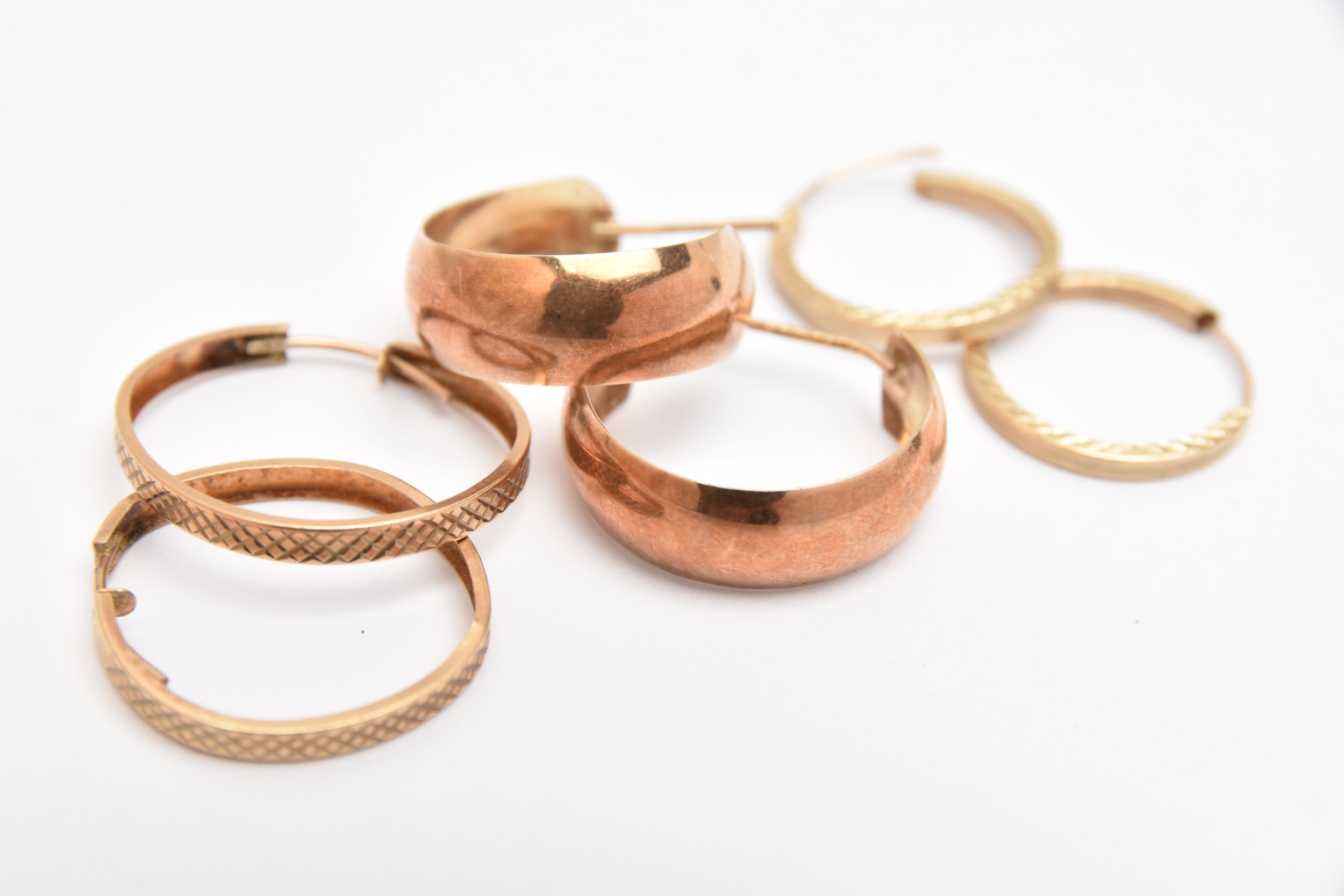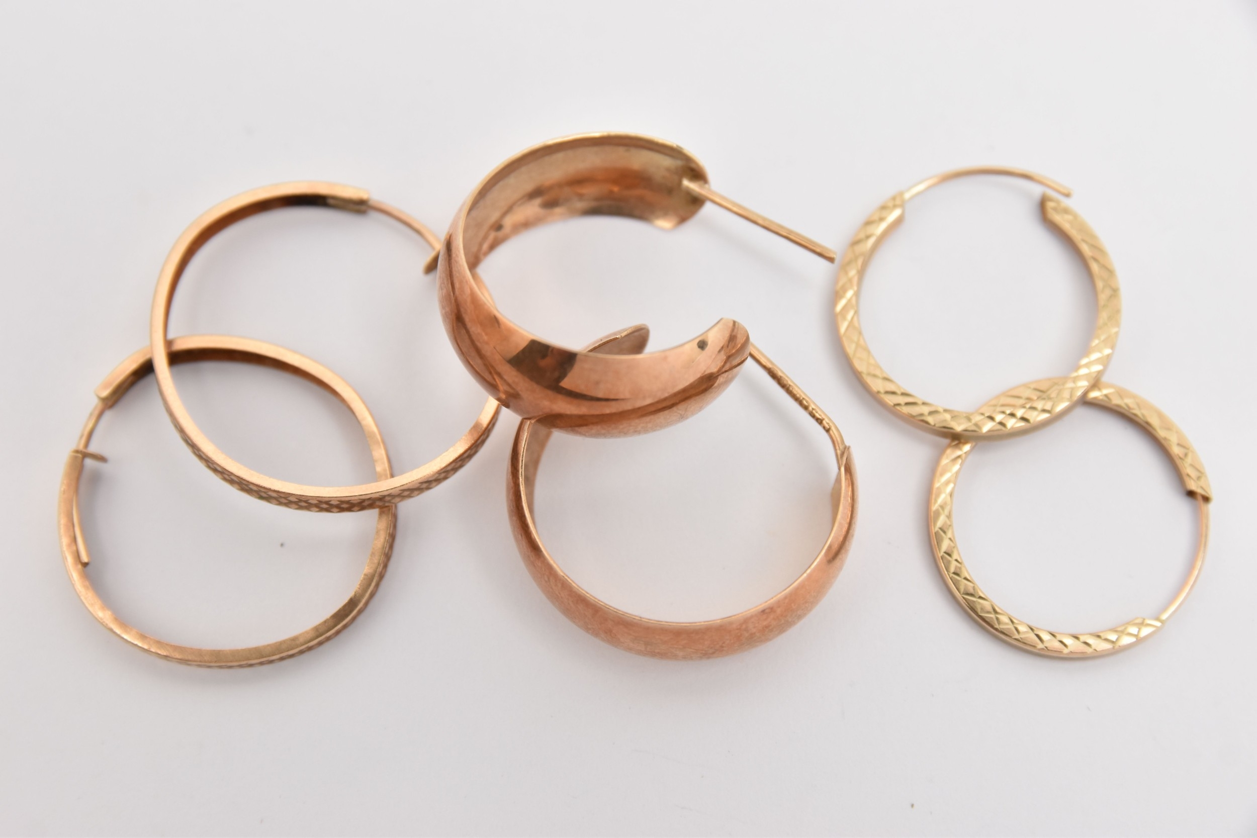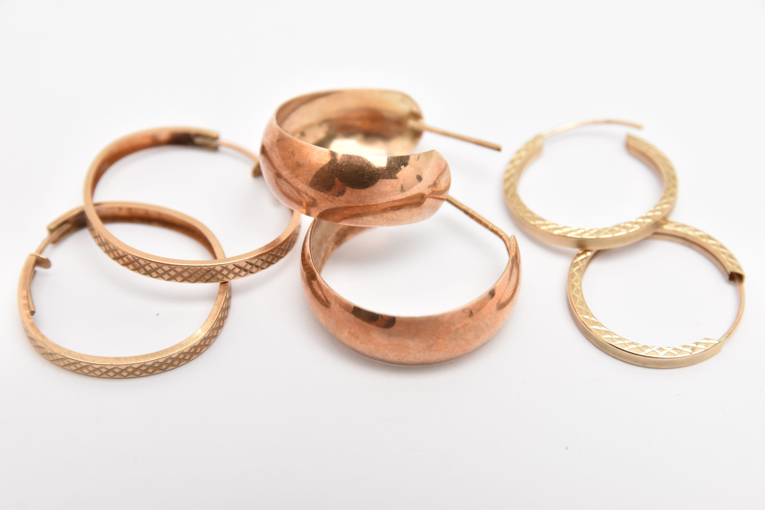 THREE PAIRS OF HOOP EARRINGS, to include a pair of 9ct rose gold half hoop earrings, post fittings hallmarked 9ct Birmingham, missing scrolls, approximate gross weight 2.5 grams, together with two pairs of yellow metal diamond cut pattern hoops, unmarked, approximate gross weight 1.7 grams (condition report: missing scroll backs to half hoops, other two pairs are slightly misshapen and will require some attention)