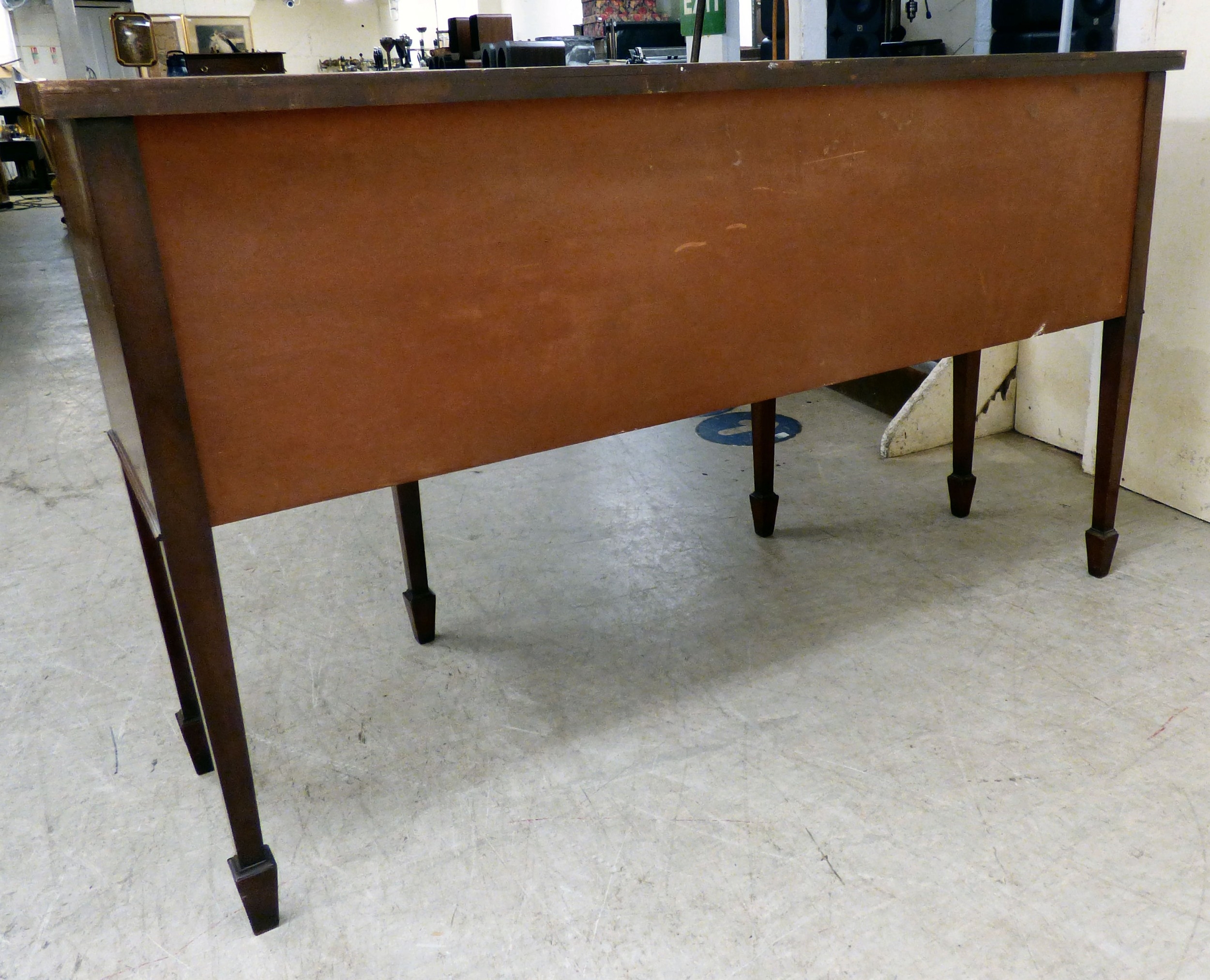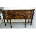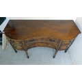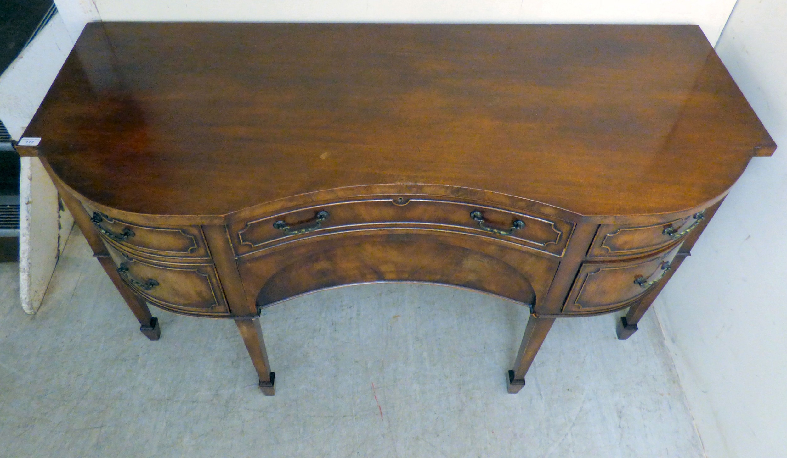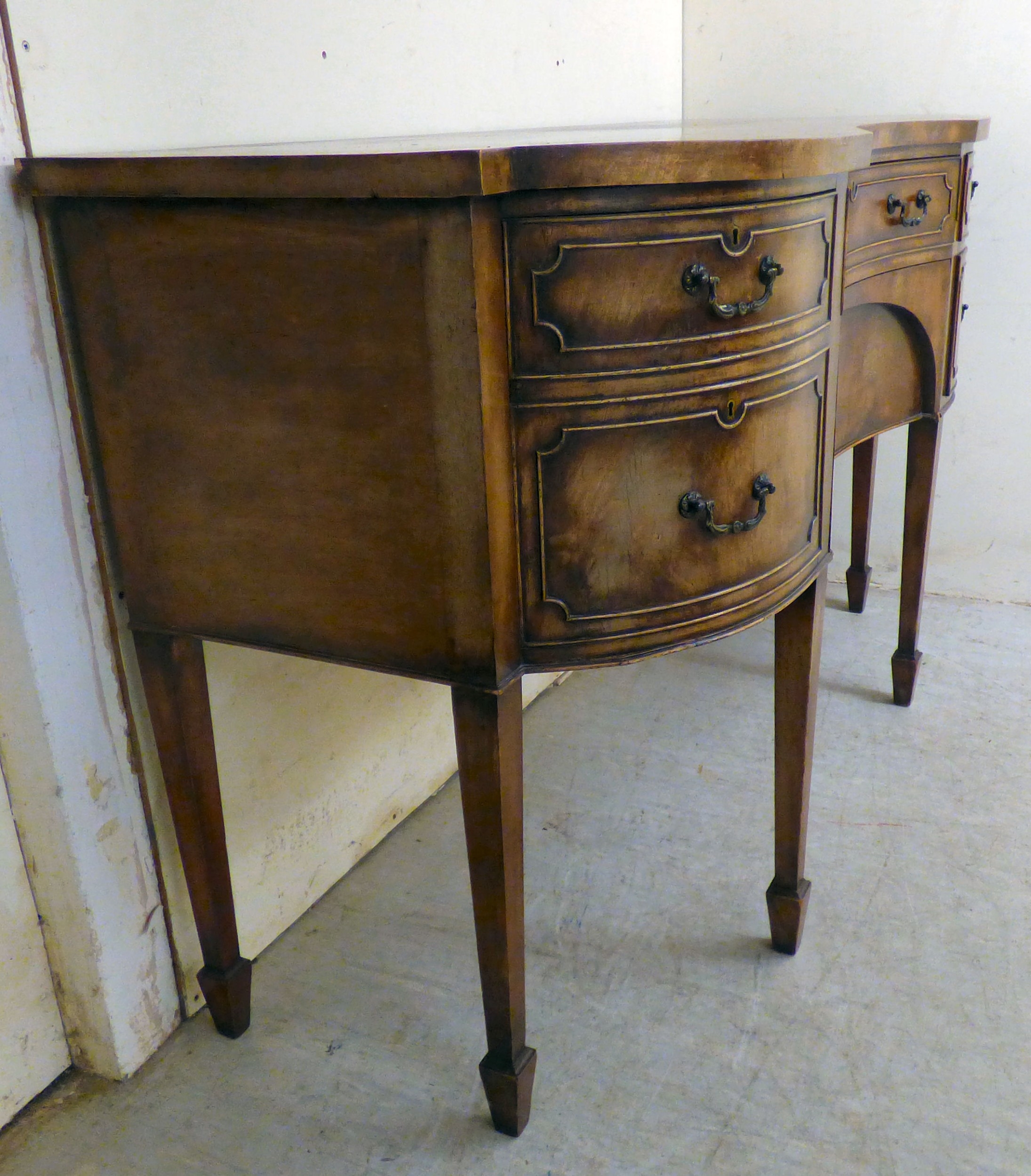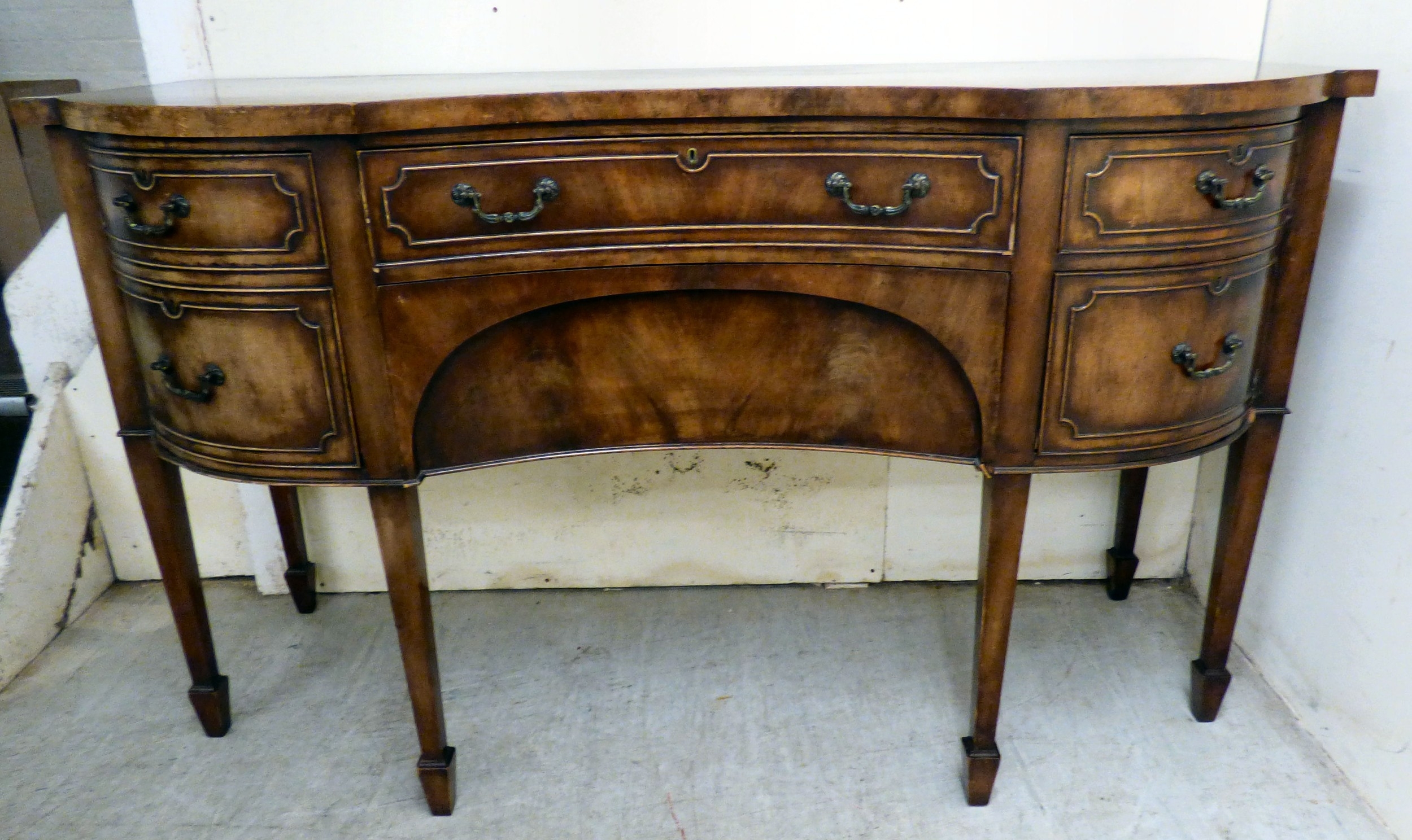 A mid 20thC mahogany finished serpentine front sideboard, comprising an arrangement of drawers and cupboard doors, raised on square, tapered legs 35"h 60"w