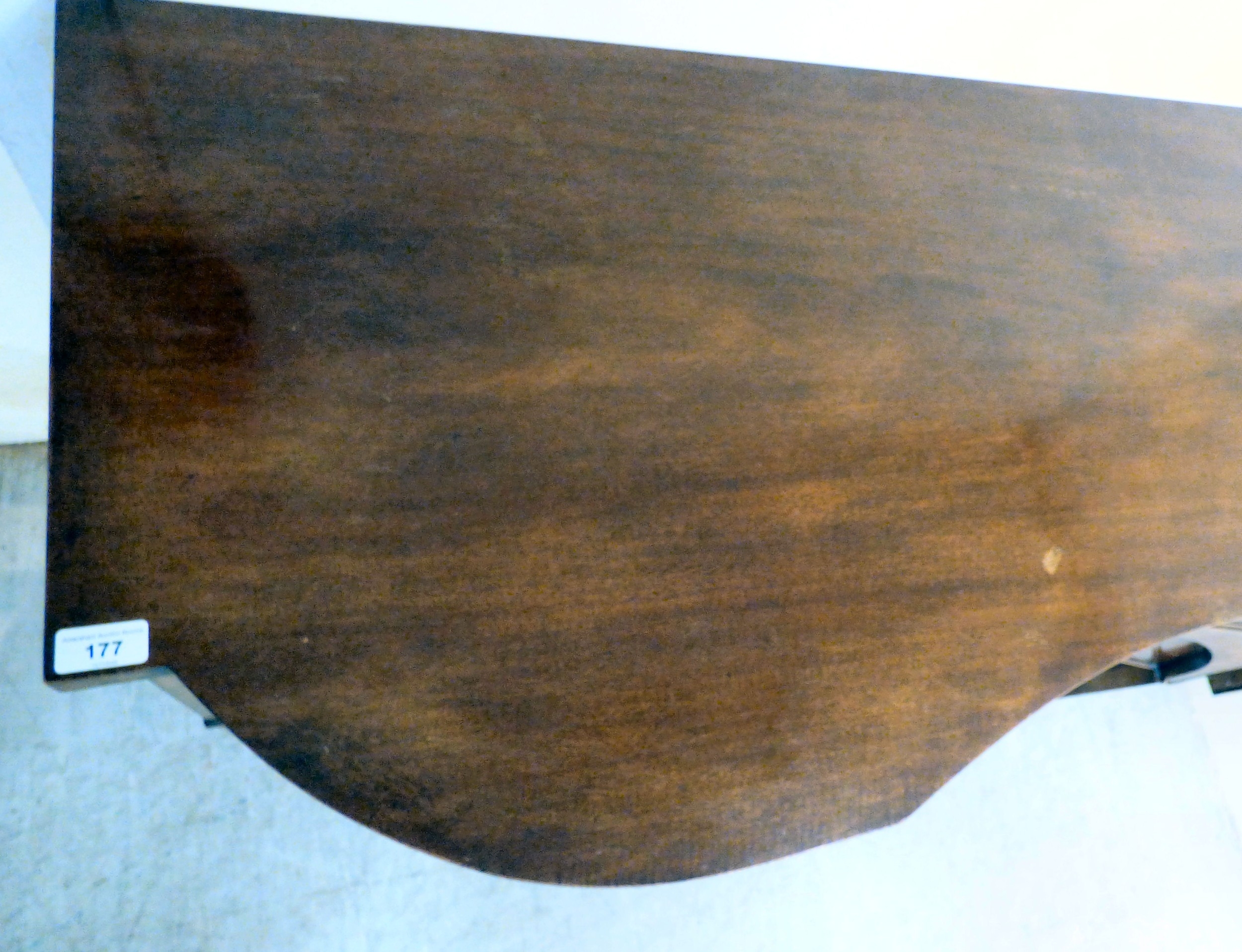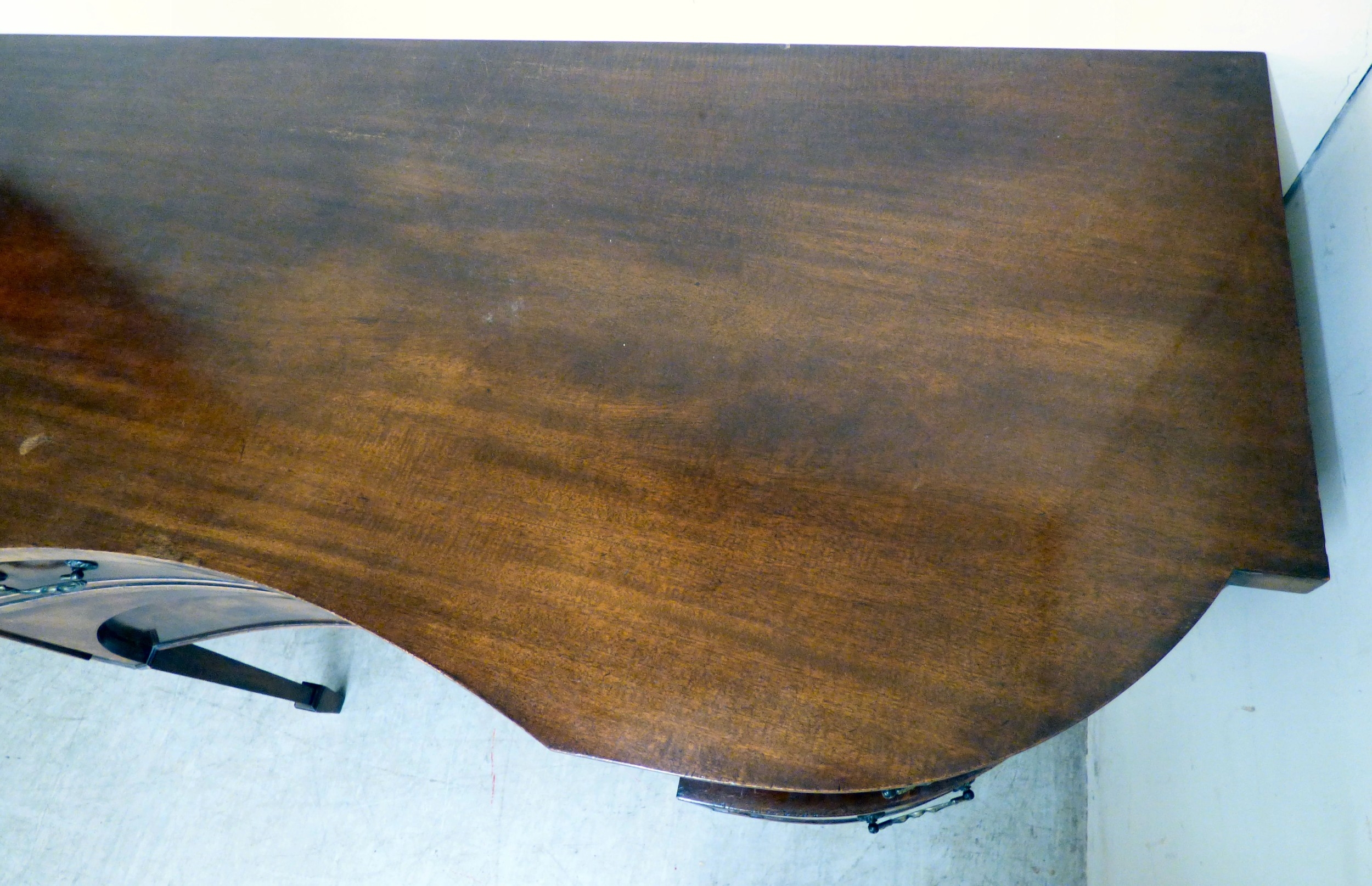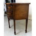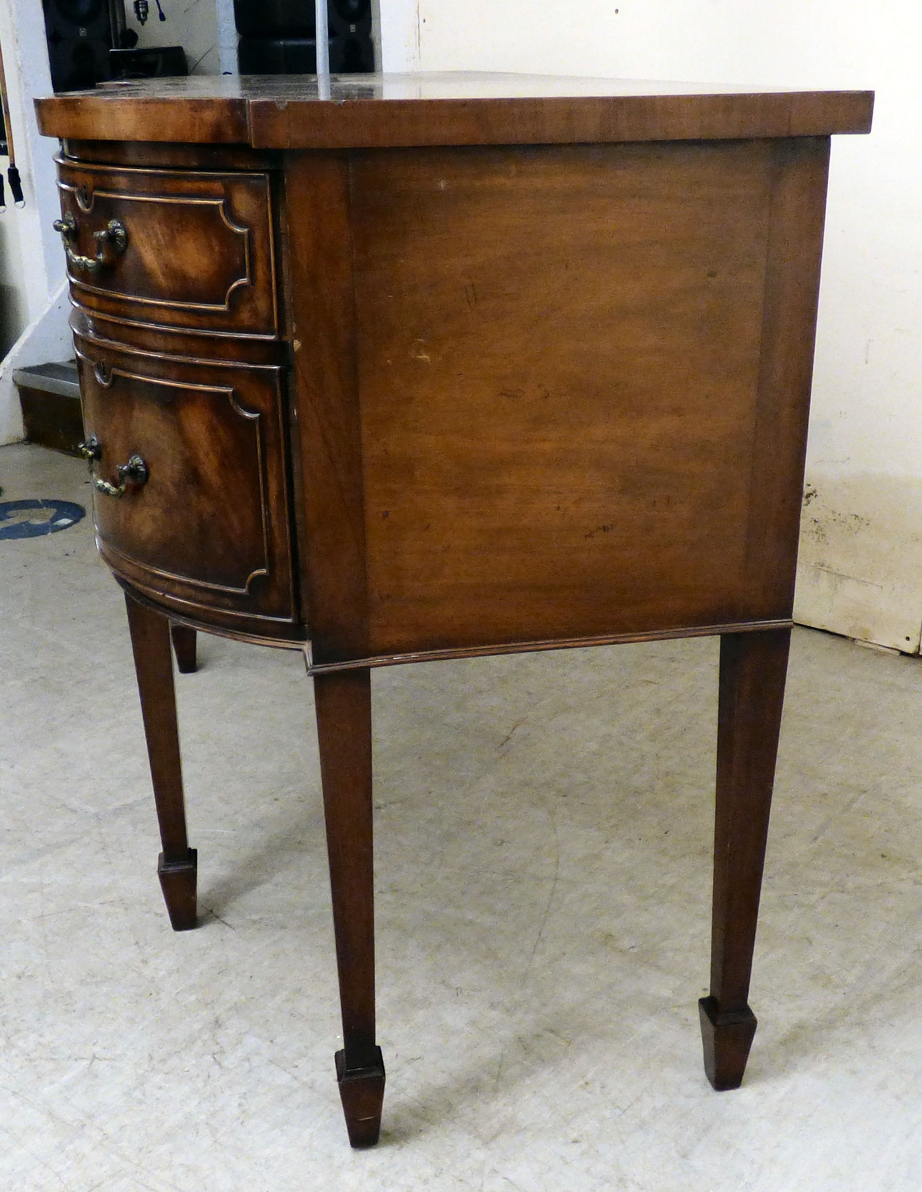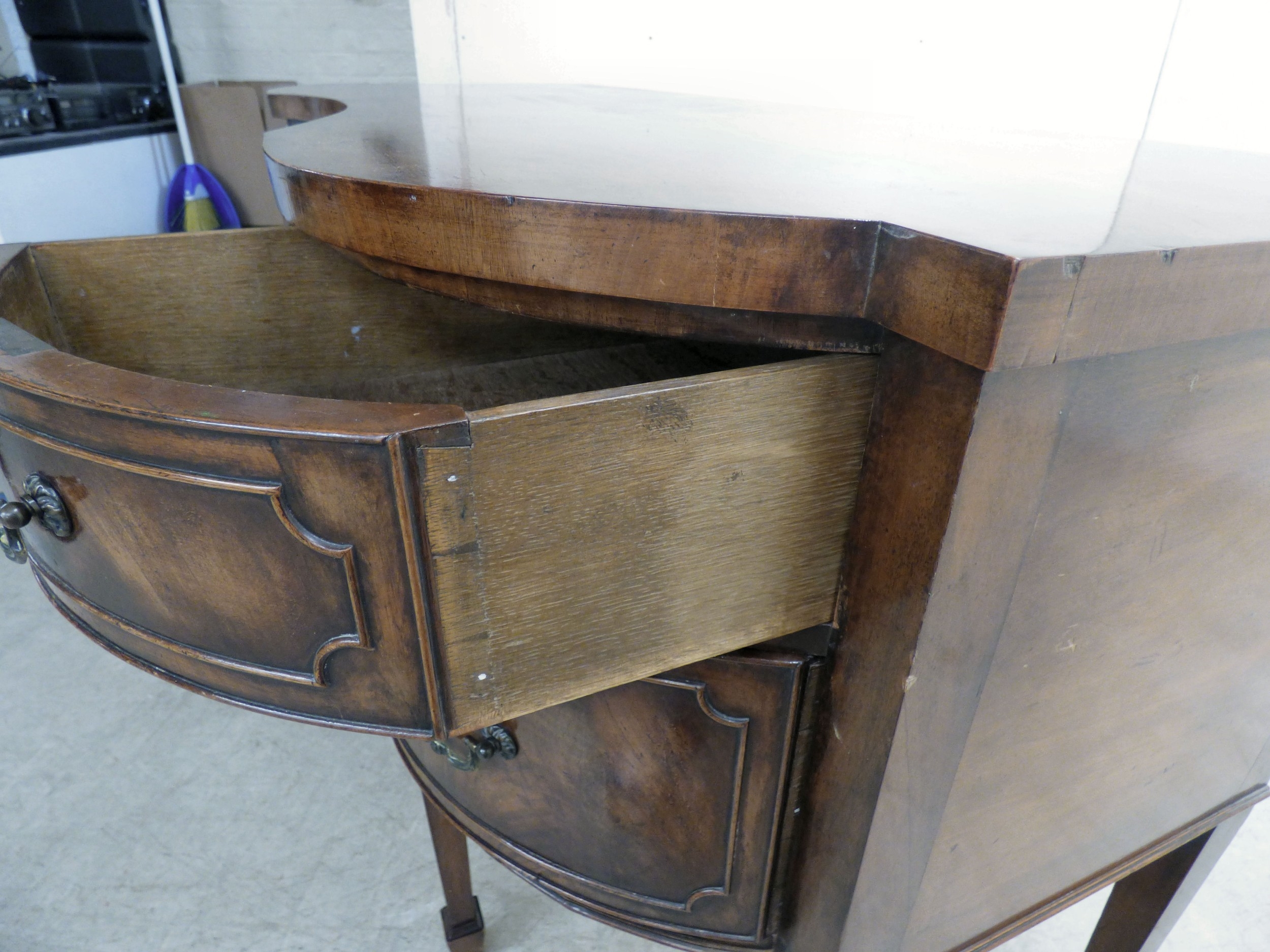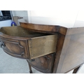 A mid 20thC mahogany finished serpentine front sideboard, comprising an arrangement of drawers and cupboard doors, raised on square, tapered legs 35"h 60"w