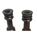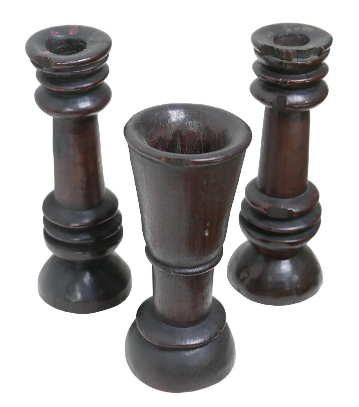 A pair of early 19th century carved oak candlesticks, 8 by 21.5cm high, together with a later vase, 8 by 18.5cm high, a/f. (3)