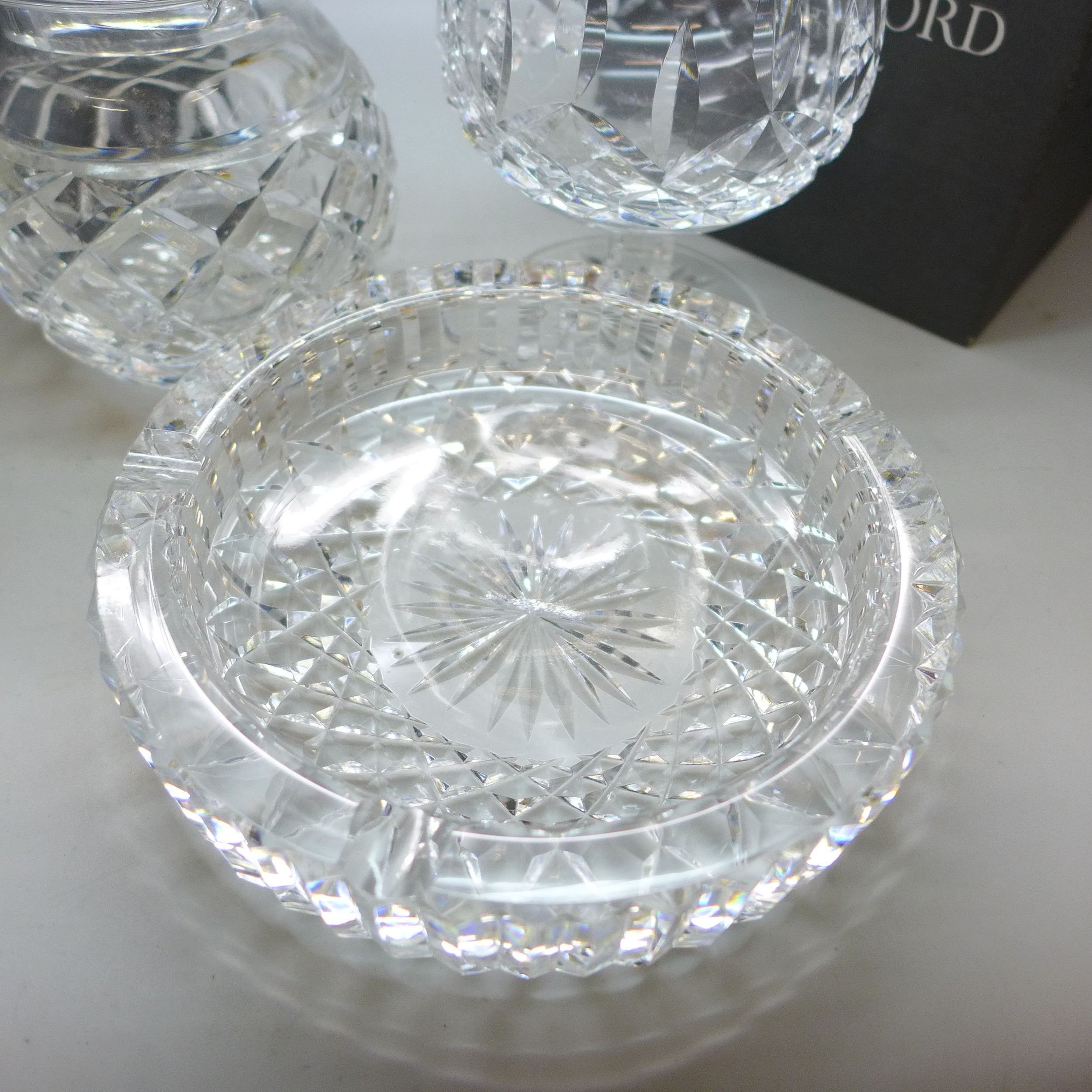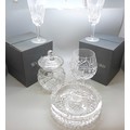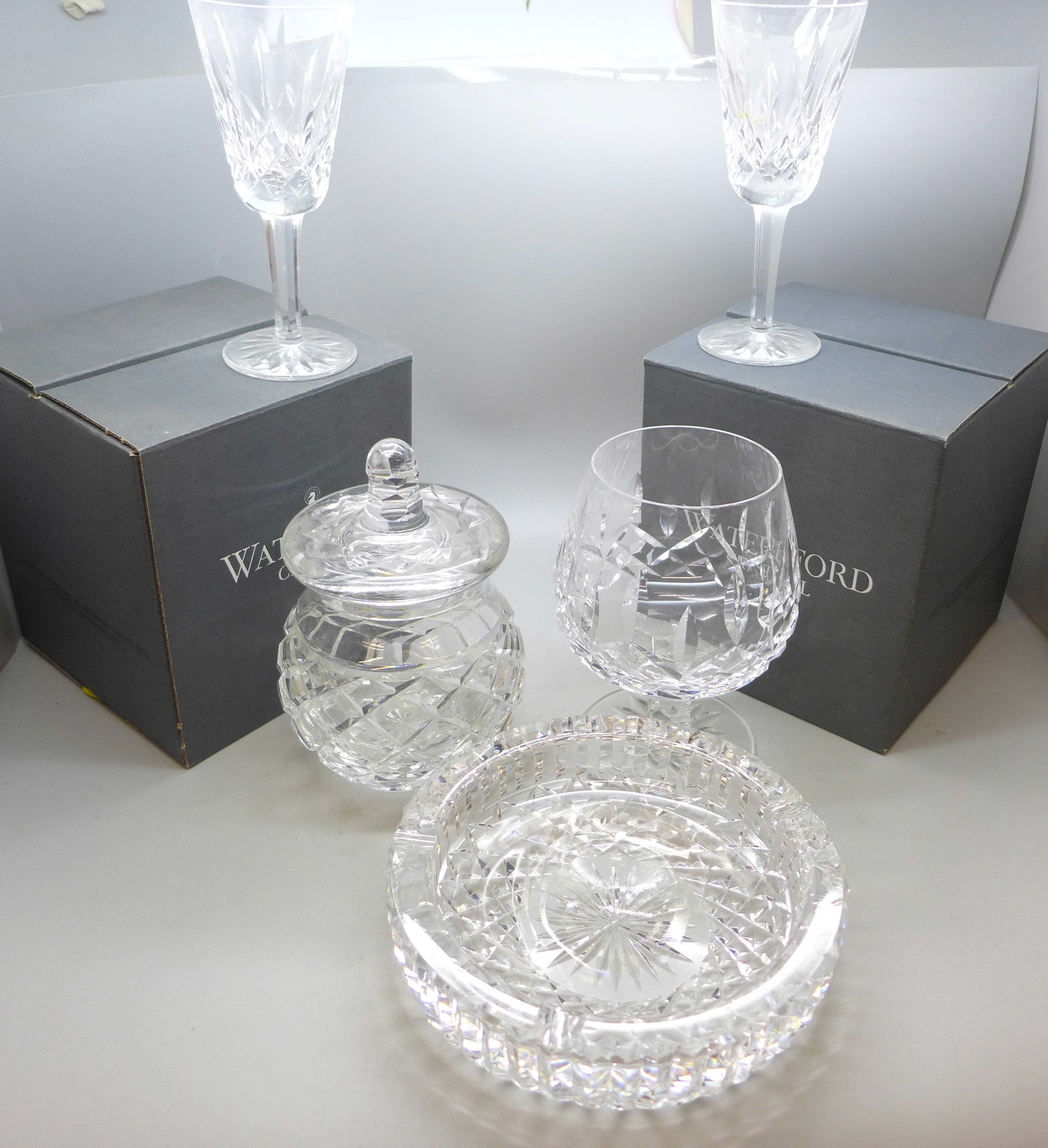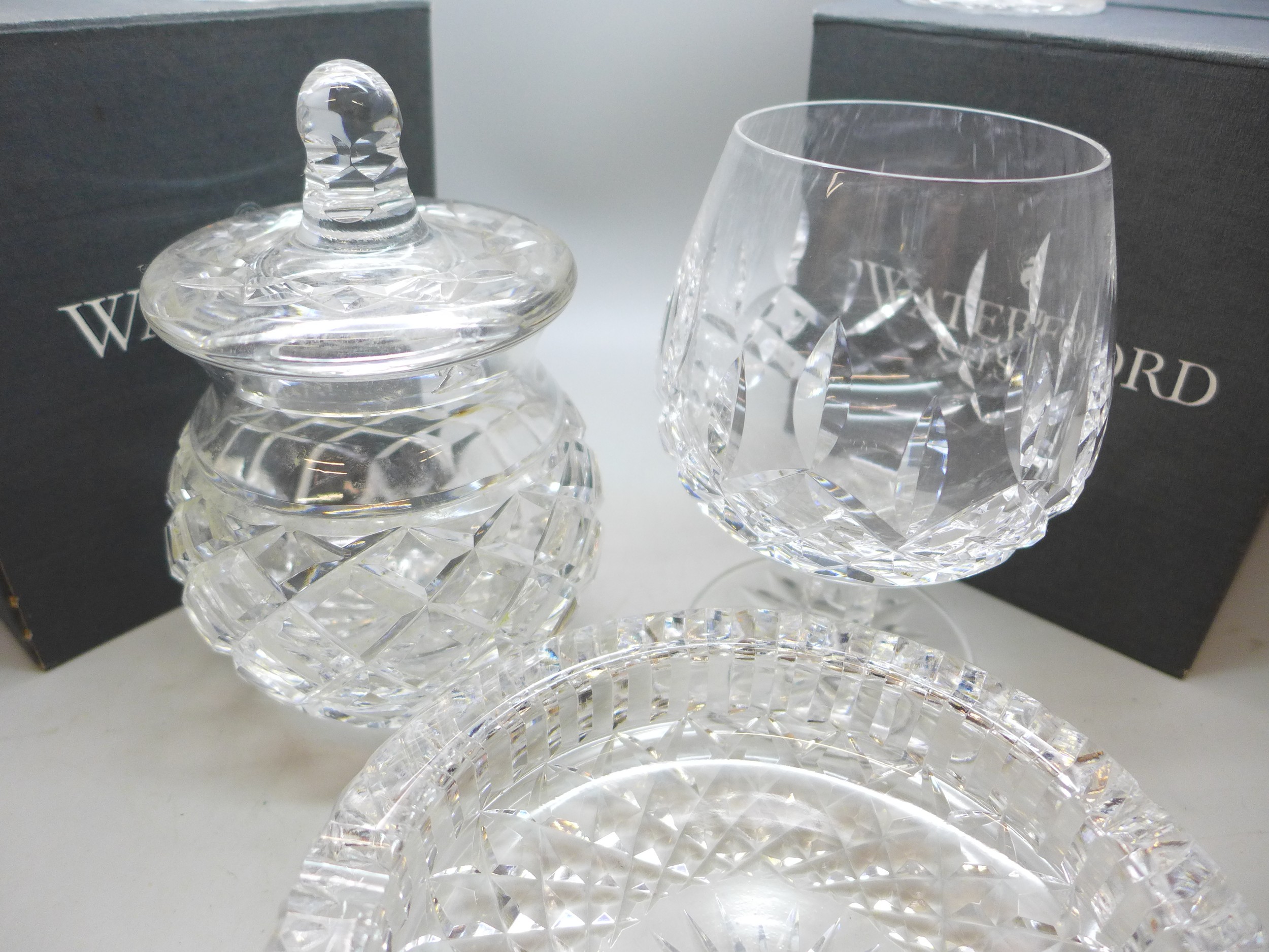 Waterford Crystal, a set of four sherry glasses, boxed, three sherry glasses, boxed, one boxed brandy glass, ashtray and a jam pot with chipped rim