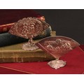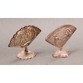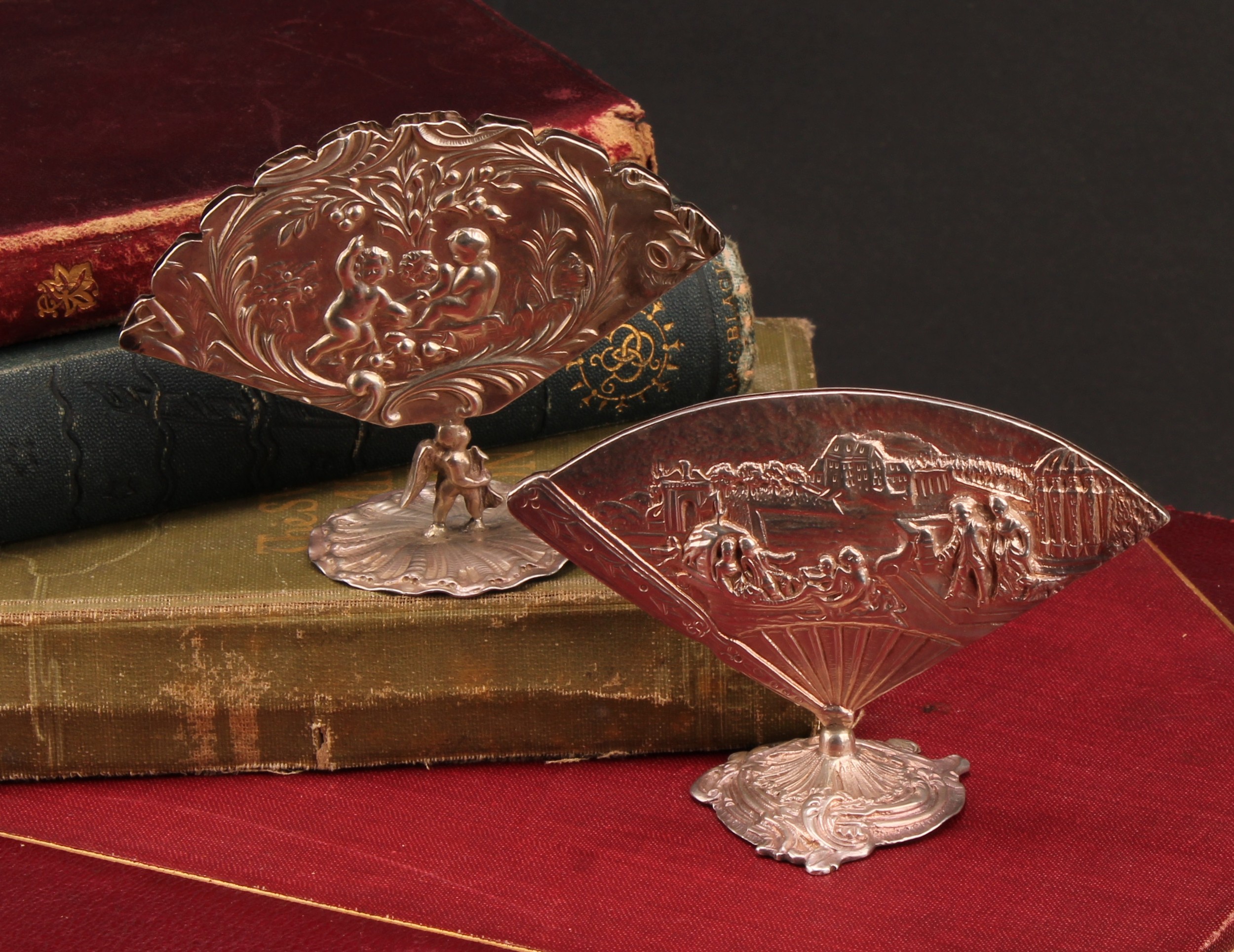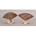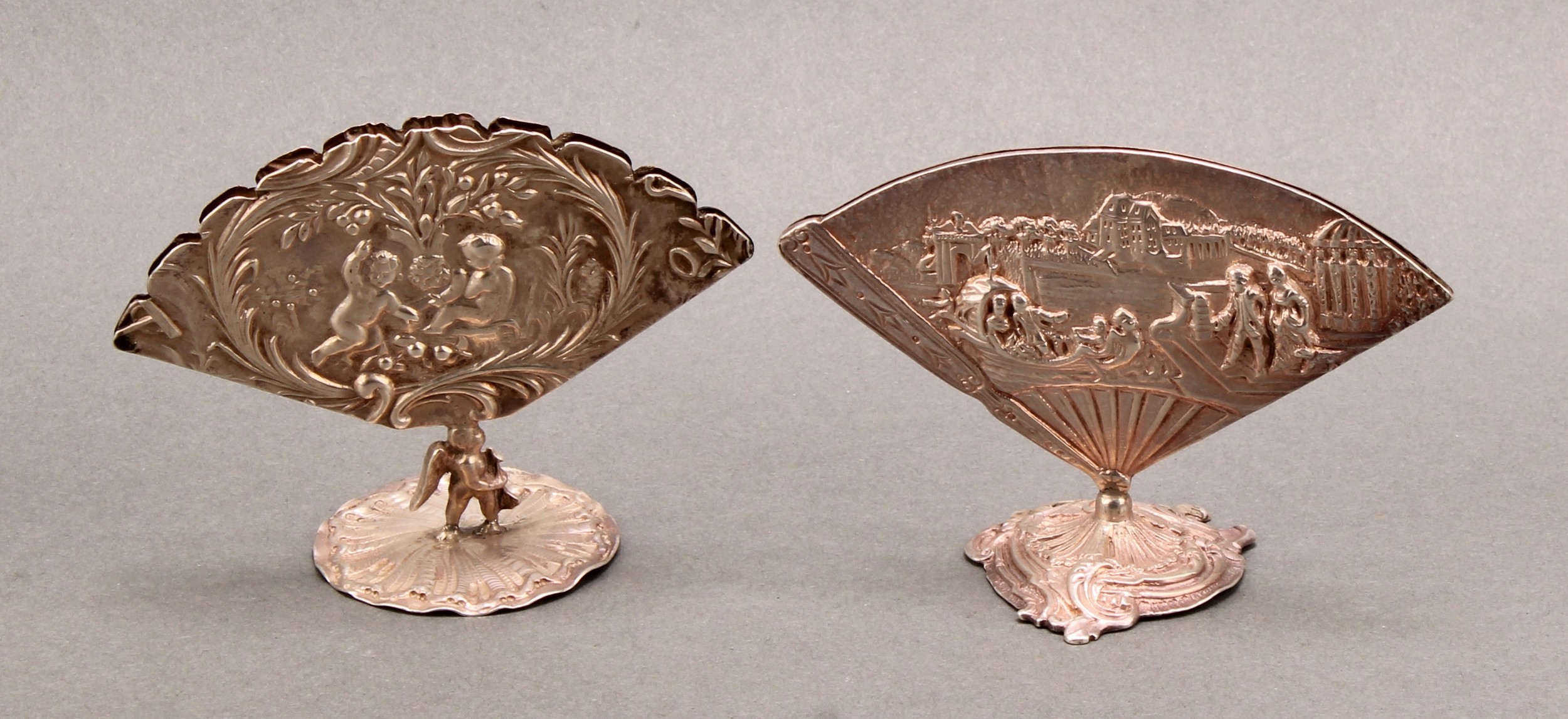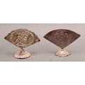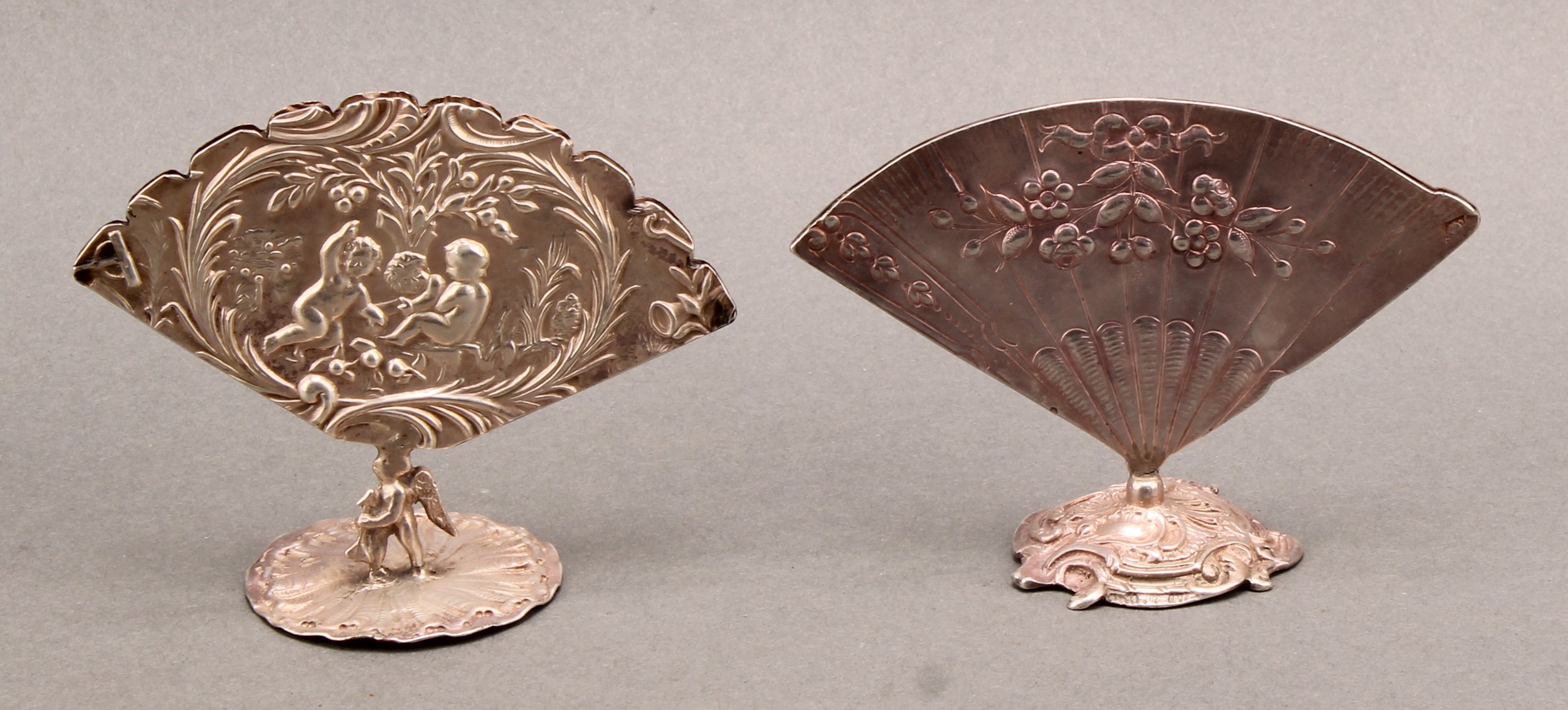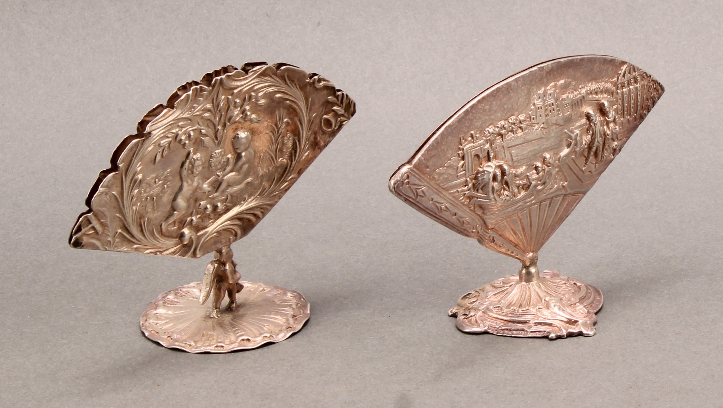 An early 20th century Continental silver fan shaped menu holder, in relief with an 18th century courtship scene, cast base, 9.5cm wide, c.1900; another, similar (2)