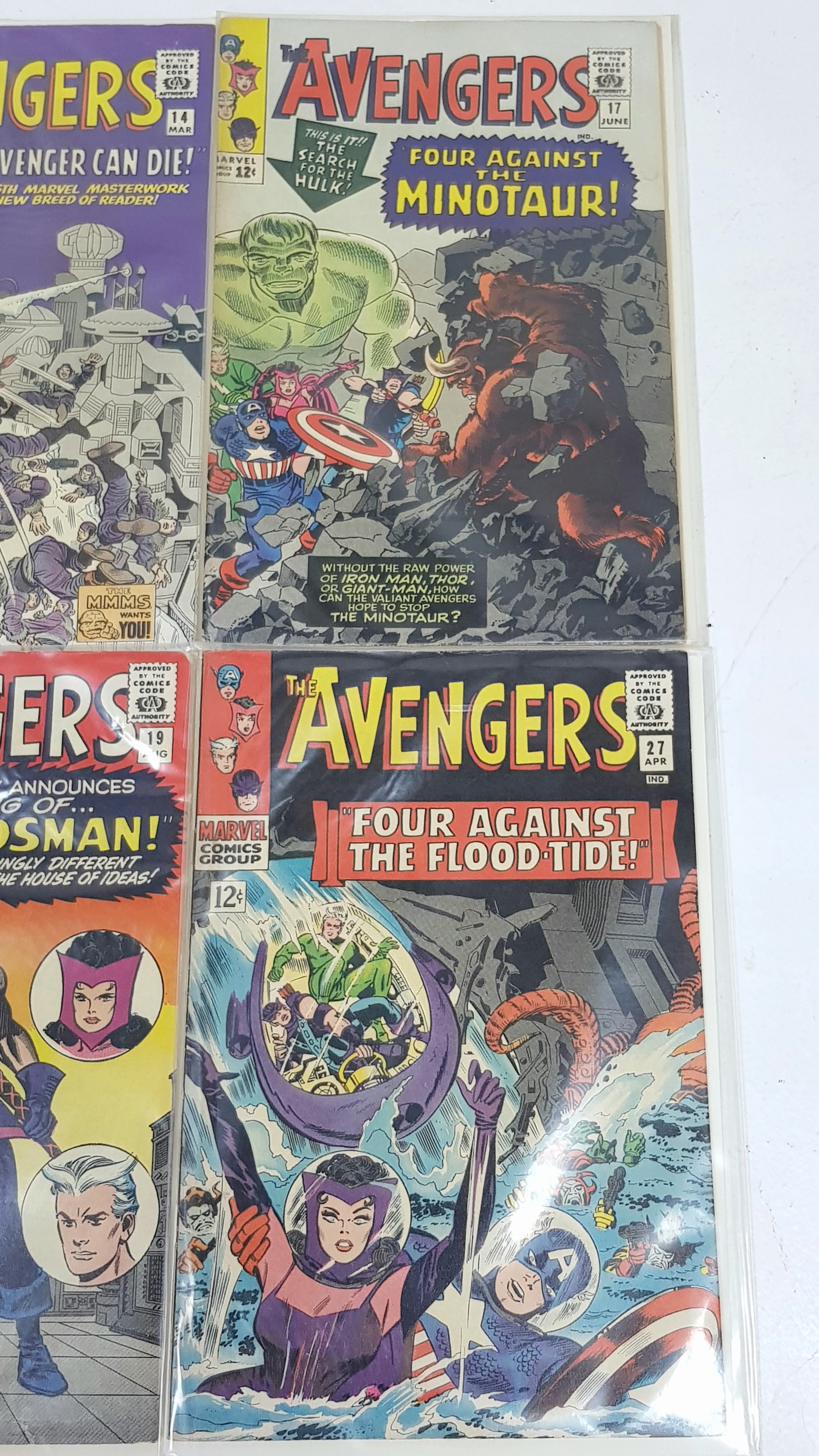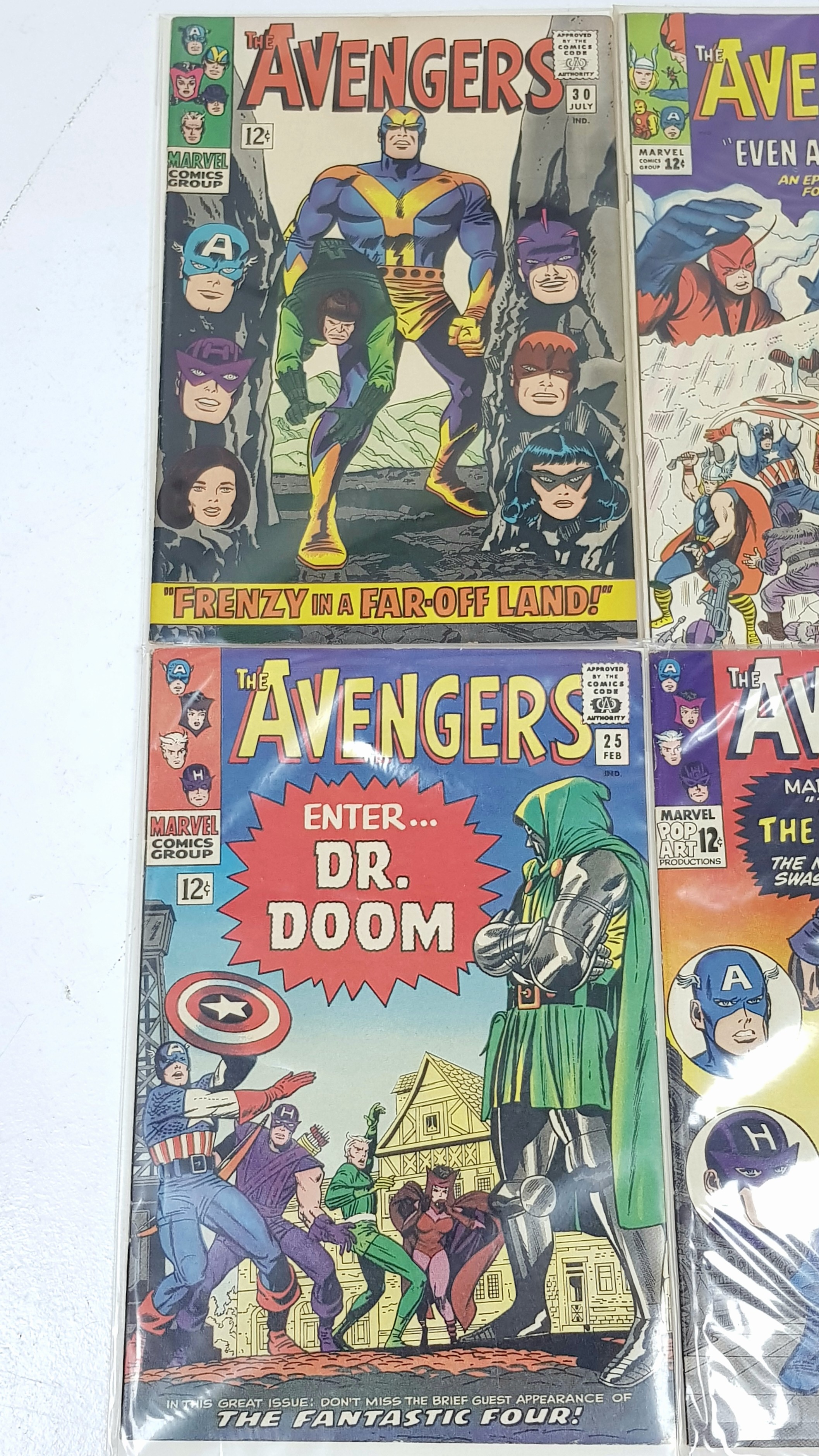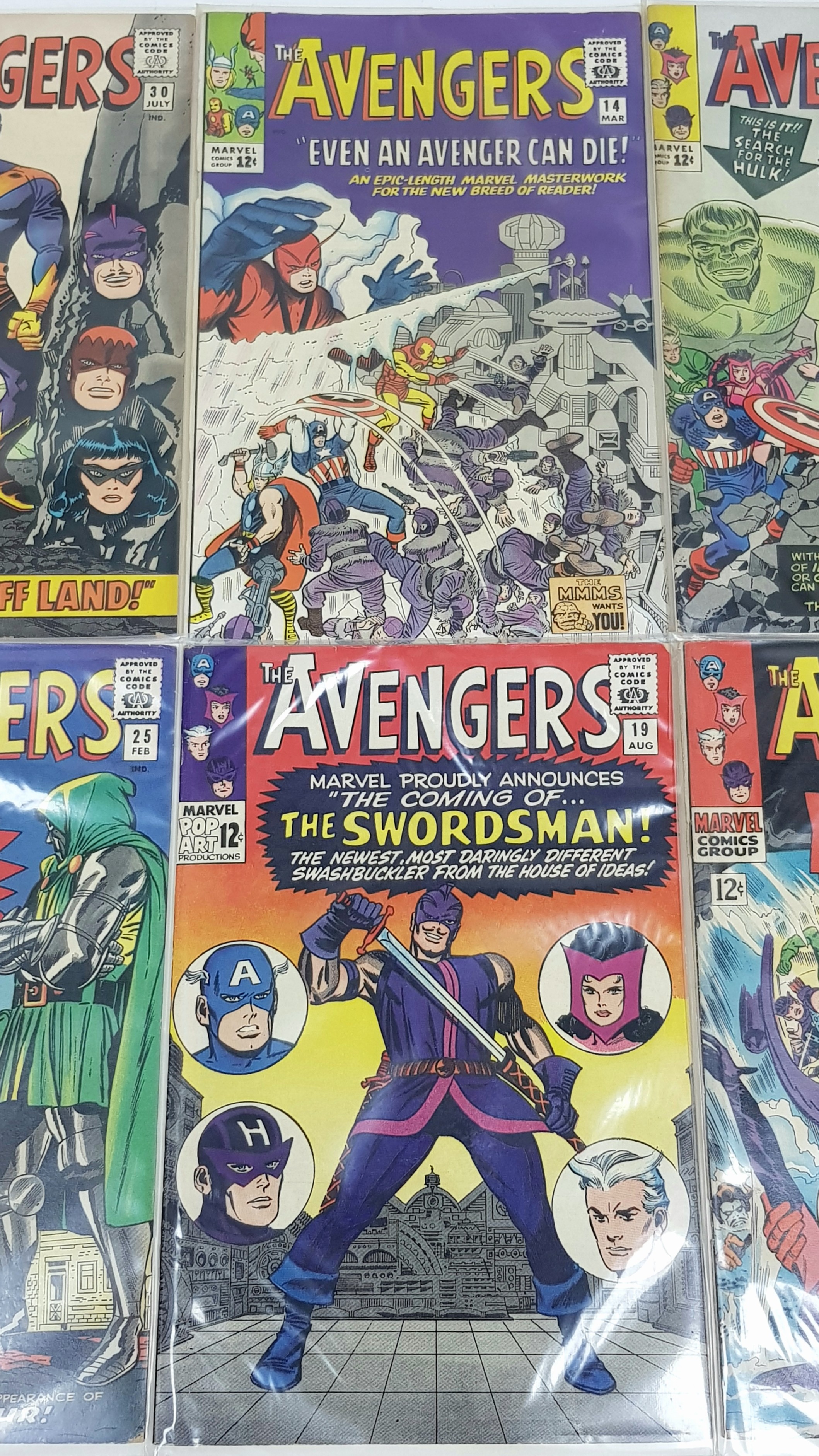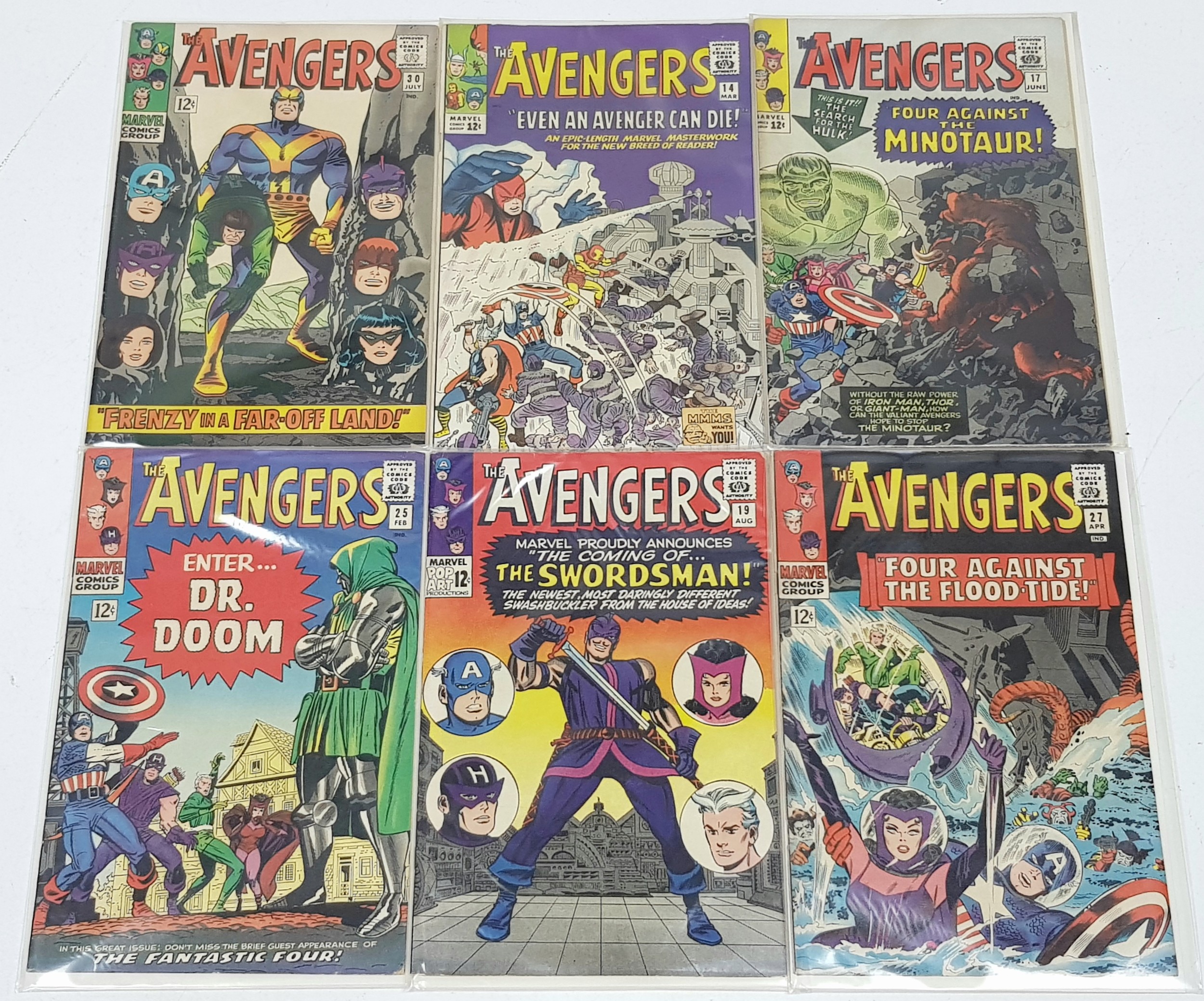 Six Highly Collectible Vintage 1960s Copies of Marvel Avengers Comics. Each individually plastic wrapped with board backing. Please refer to photos for finer details and condition.