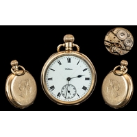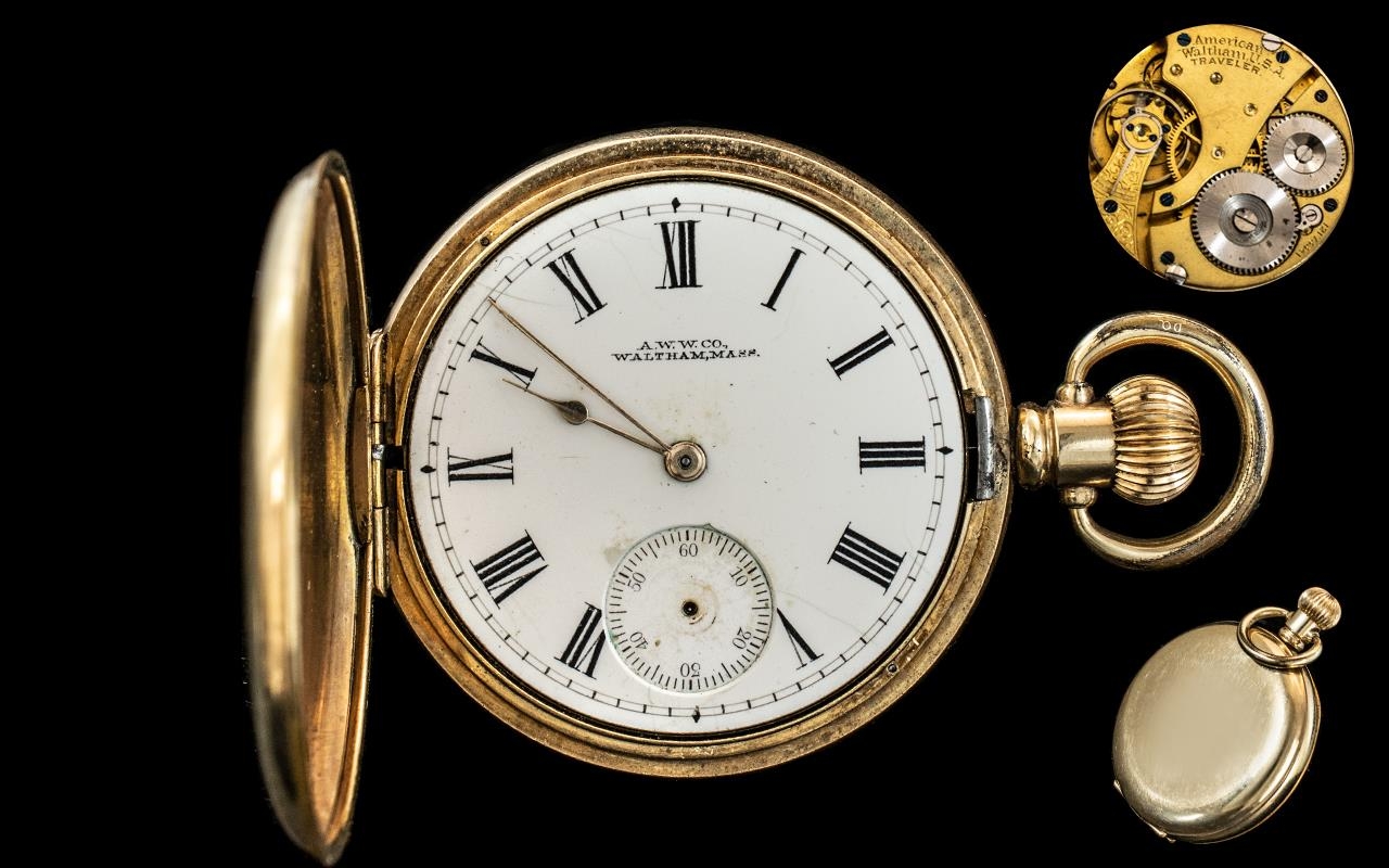 American Watch Co Waltham Traveller 10ct Gold Filled Full Hunter Pocket Watch. Signed to Movement. Guaranteed to be of Two Plates of Gold with Composition Between and to Wear 10 Years. The Case / Dial Excellent, Working at time of Cataloging.