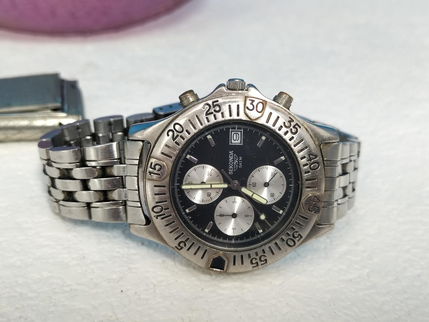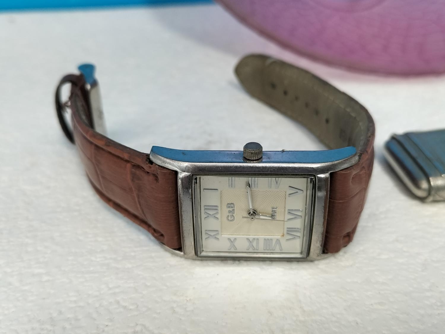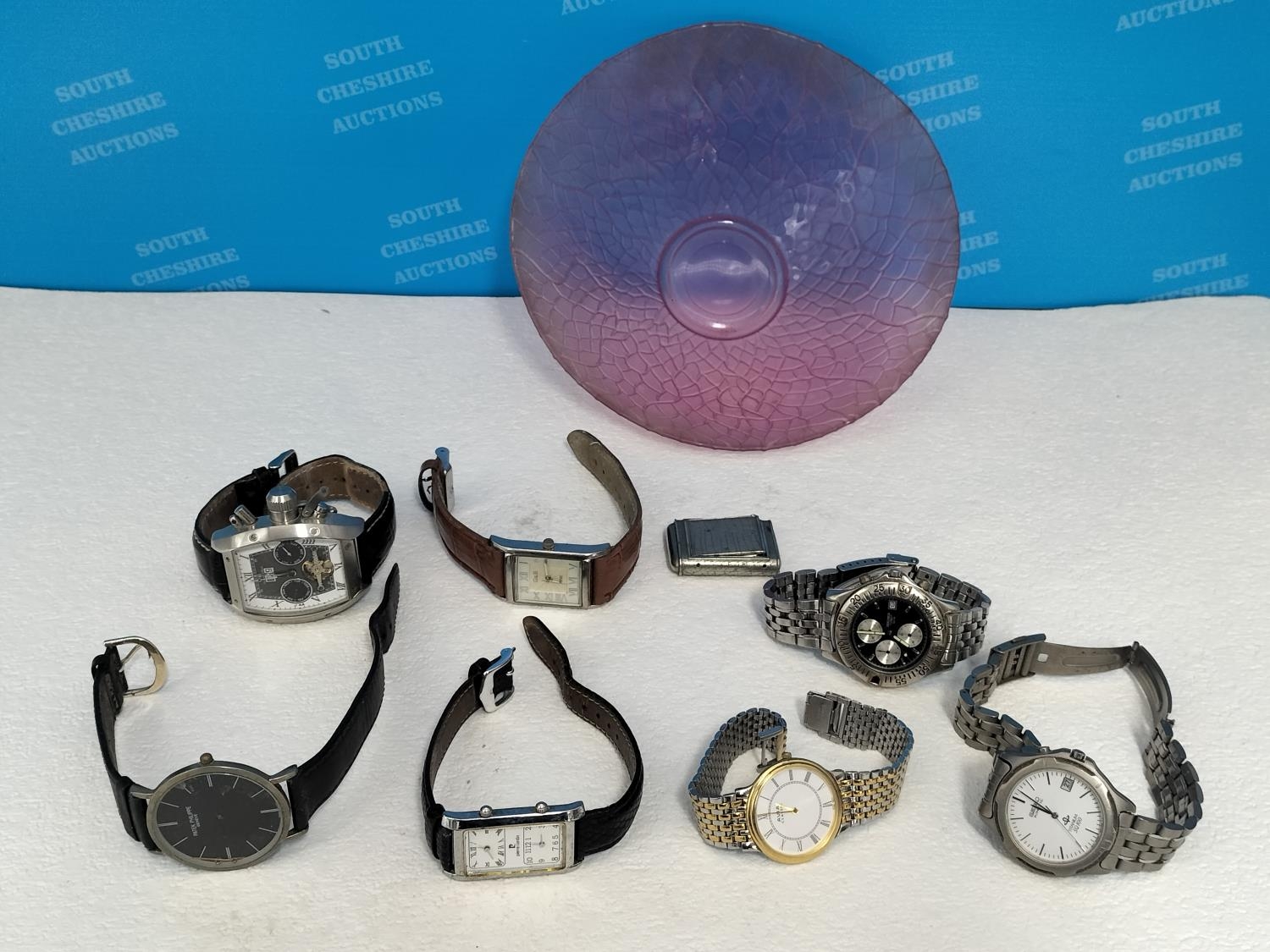 Purple Glass Bowl with a Quantity of Watches for Spares/Repair. Bowl 6cm High, 20cm Diameter.