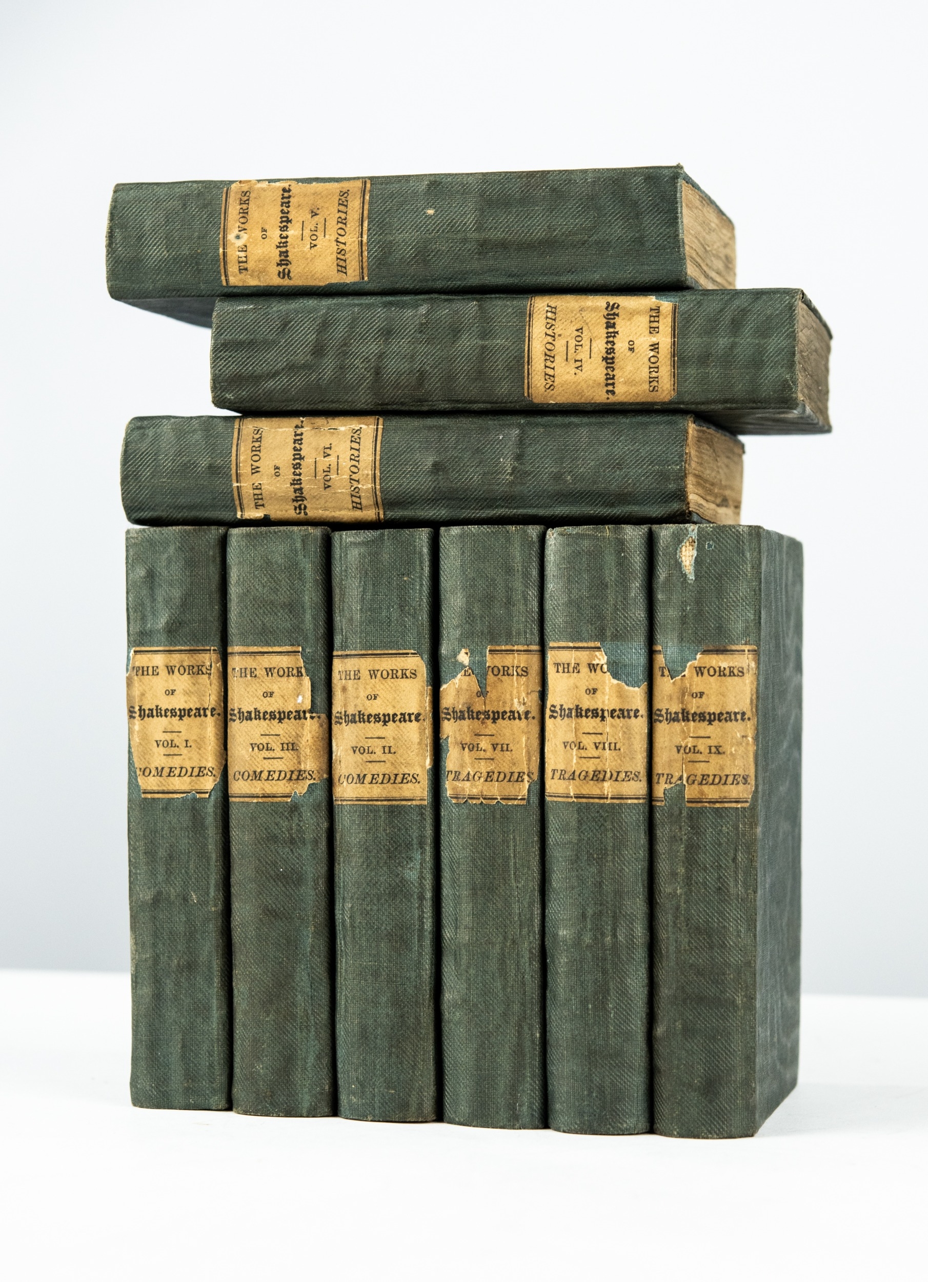 The Works of Shakespeare, printed BERWICK, John Taylor, 1800. A complete nine volume set, covering the Comedies, Tragedies & Histories. Small format volumes, bound in original textured, blue cloth, with original paper spine titles