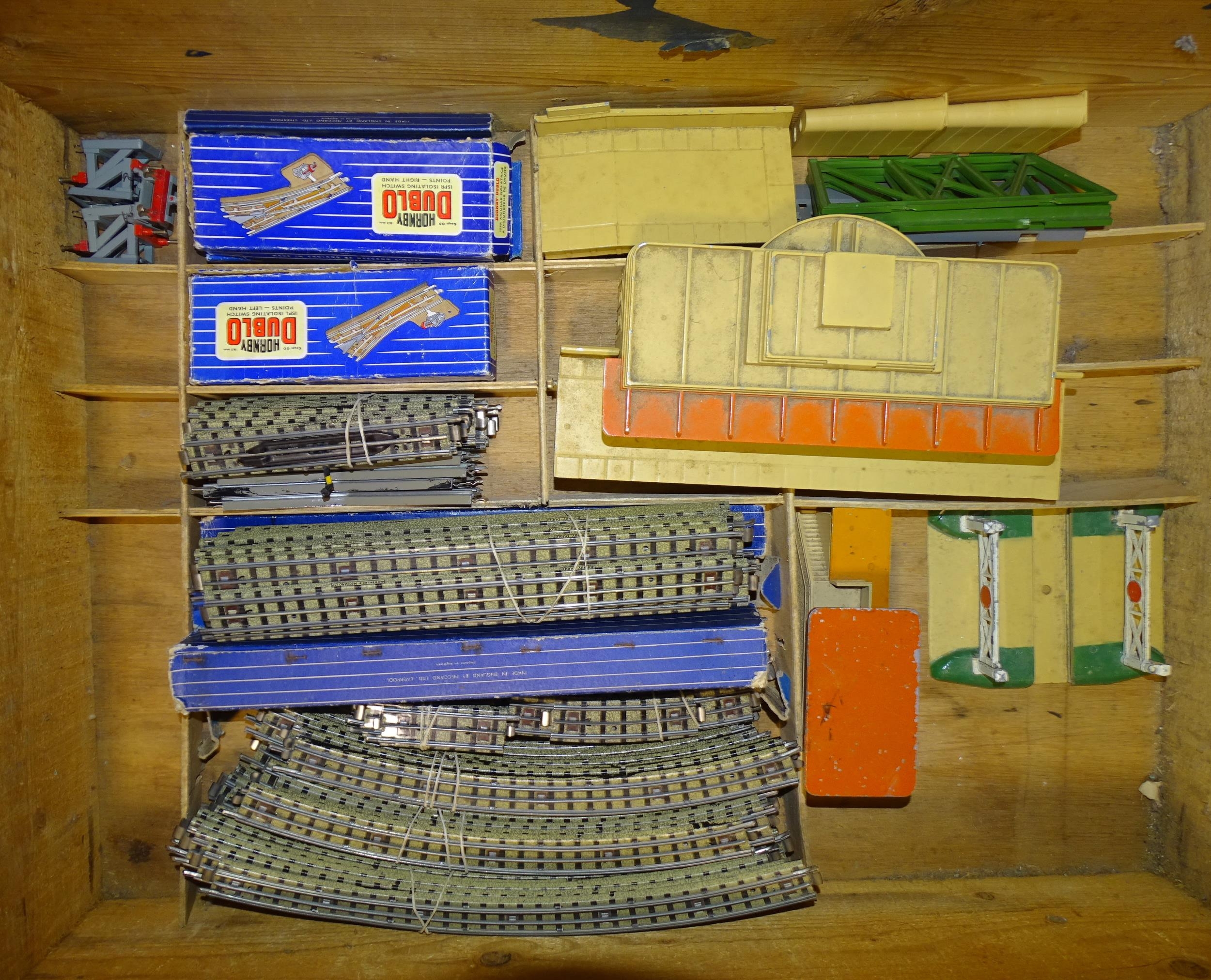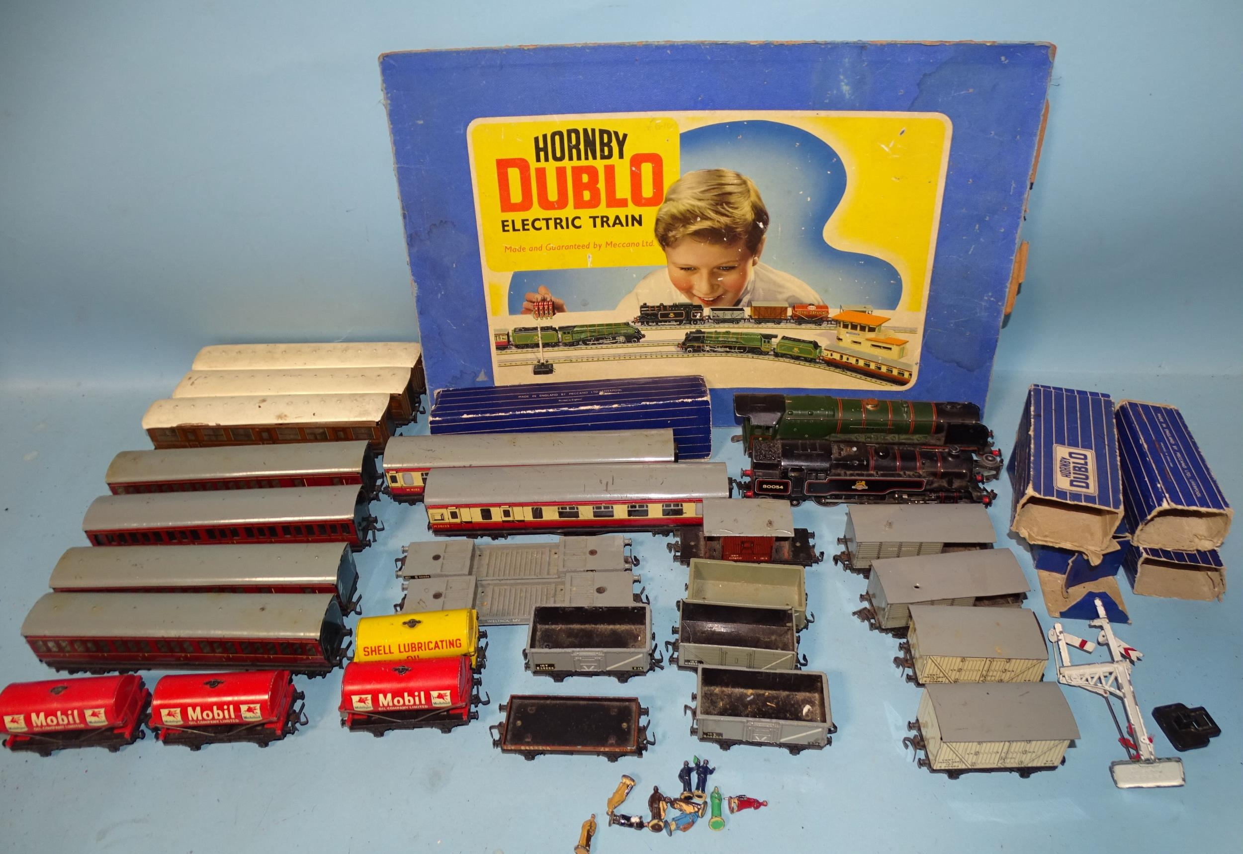 Hornby Dublo OO gauge, a quantity of rolling stock, track and accessories, including Standard Class 4 2-6-4 tank locomotive RN80054, Duchess Class 4-6-2 locomotive "Duchess of Montrose", (no tender, bogie detached), nine coaches, sixteen wagons, eight passengers, two guards, track, etc, (some boxes a/f and a partial lid), (all play-worn).