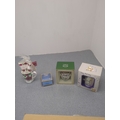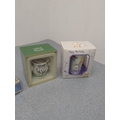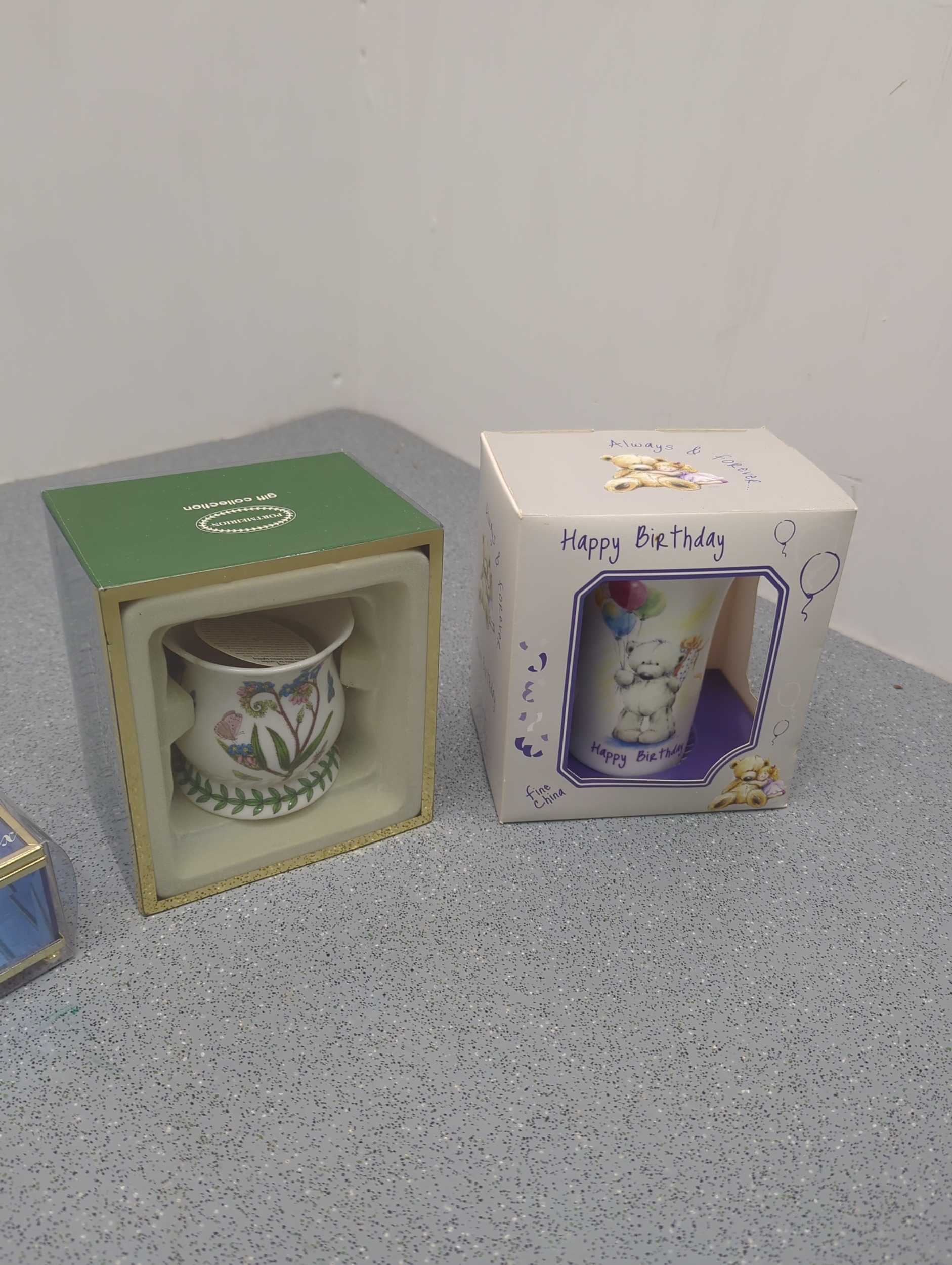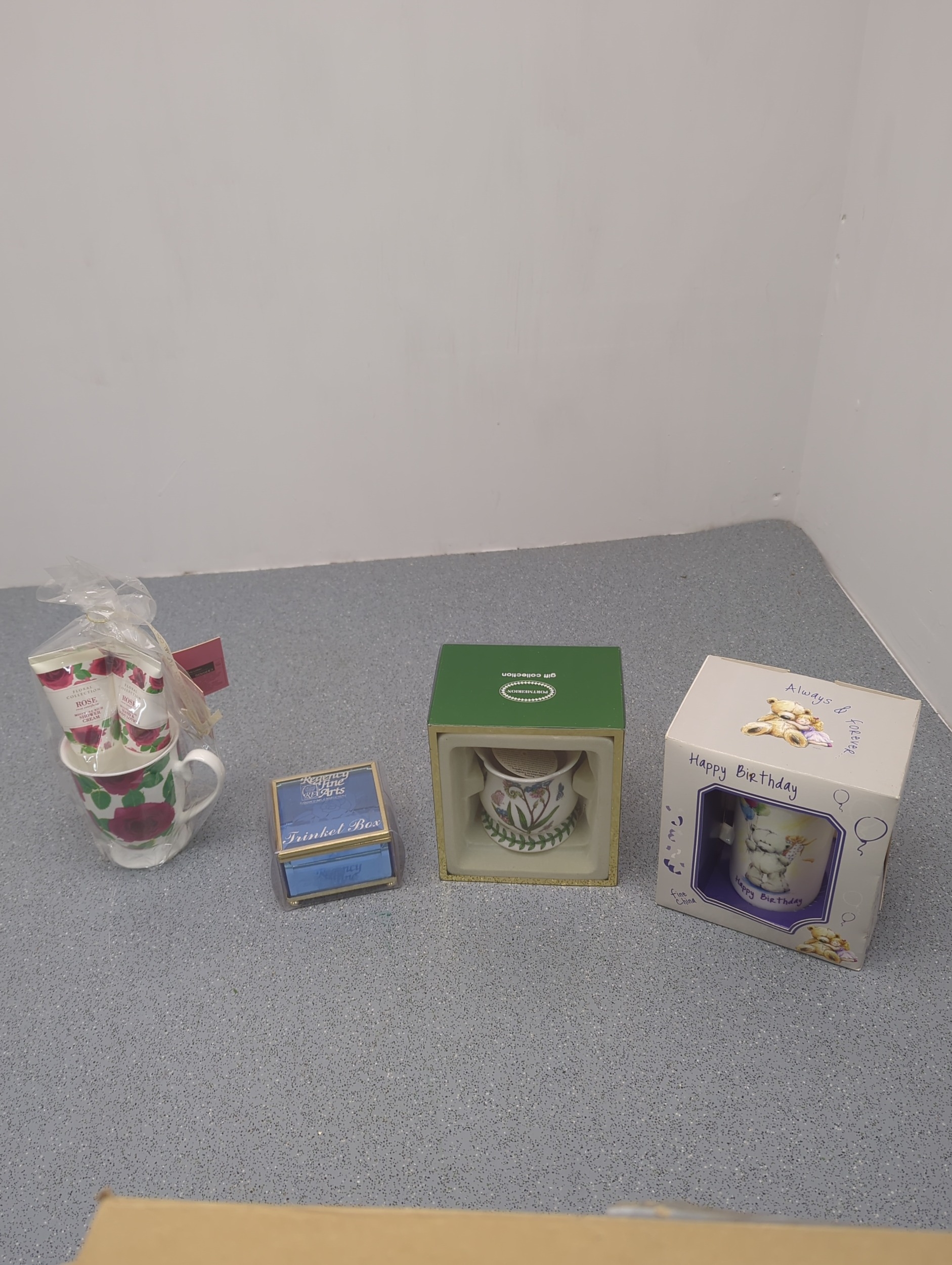 This collection includes four decorative items: a mug with a floral design, a birthday-themed cup featuring a bear illustration, a Portmeirion mug with botanical patterns, and a blue trinket box. The items are attractively presented in their original packaging, suitable for gift-giving or personal display. Each piece appears to offer distinct design features, enhancing their collectible appeal.