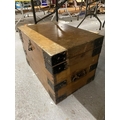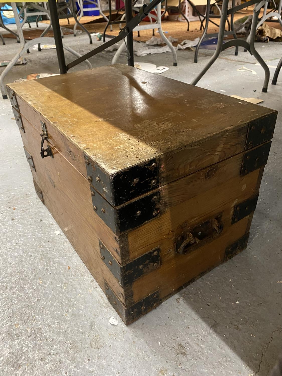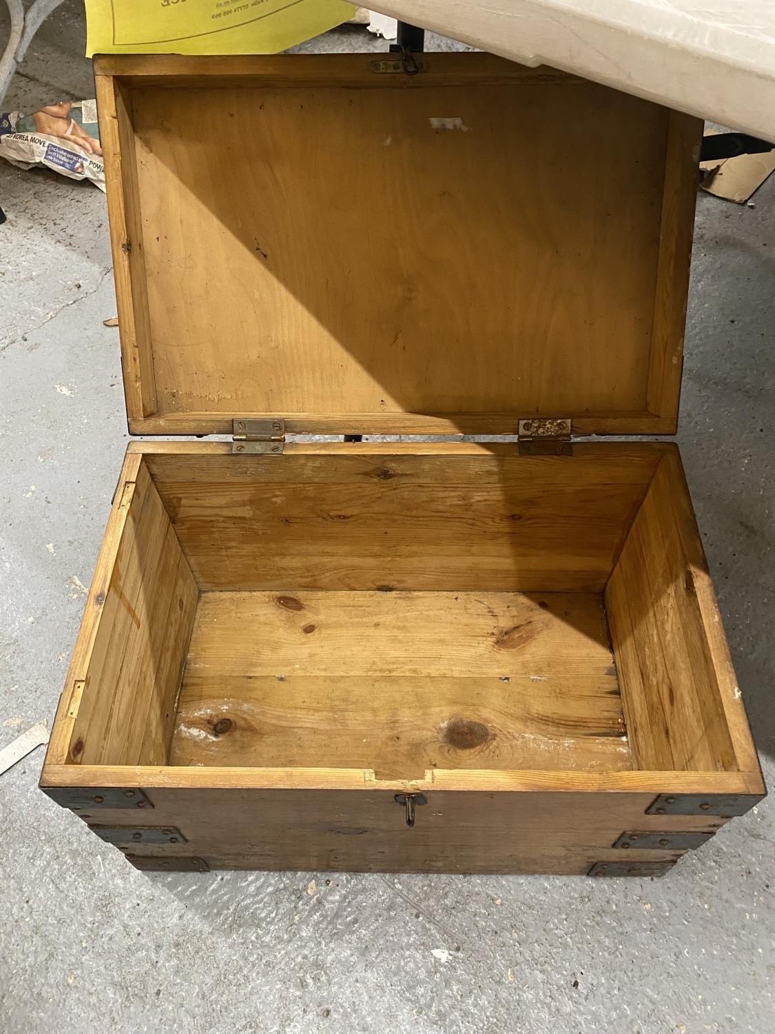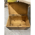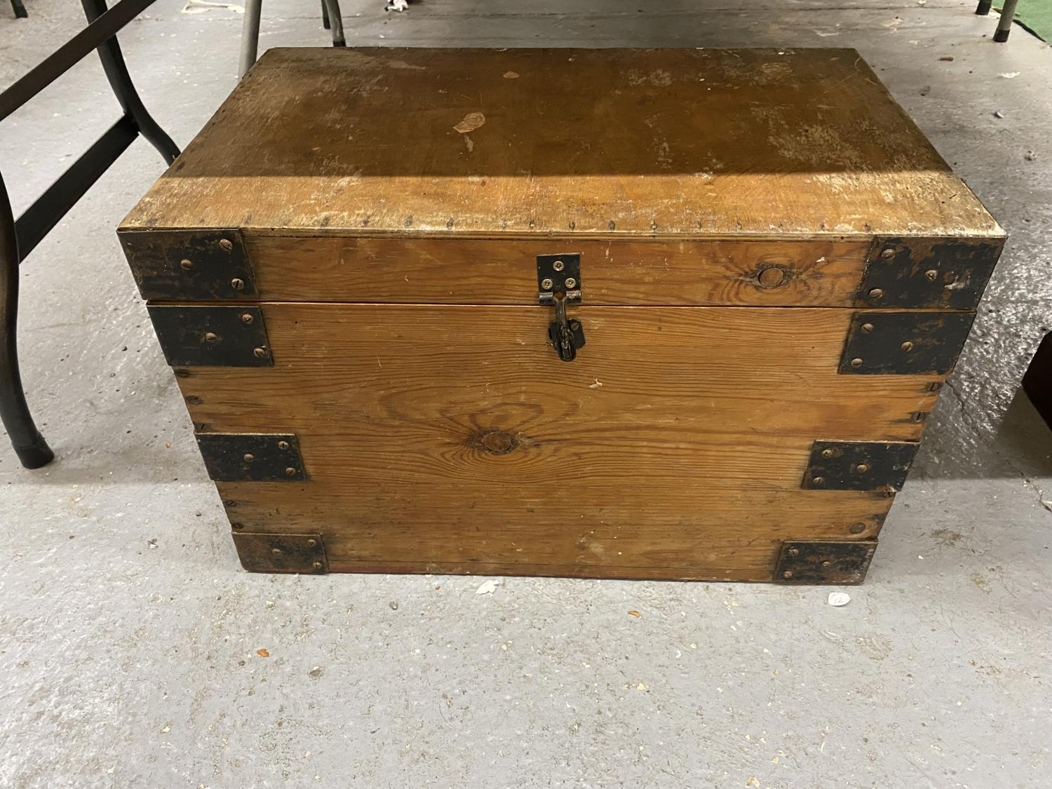 A PINE SMALL CHEST WITH METAL BANDING AND HANDLES HEIGHT 34CM, WIDTH 54CM, DEPTH 34CM