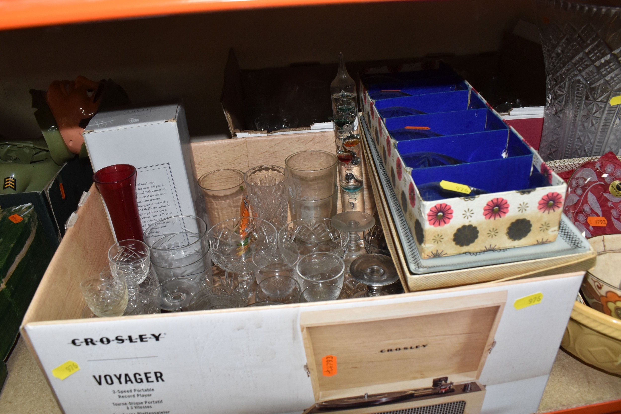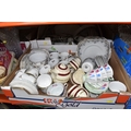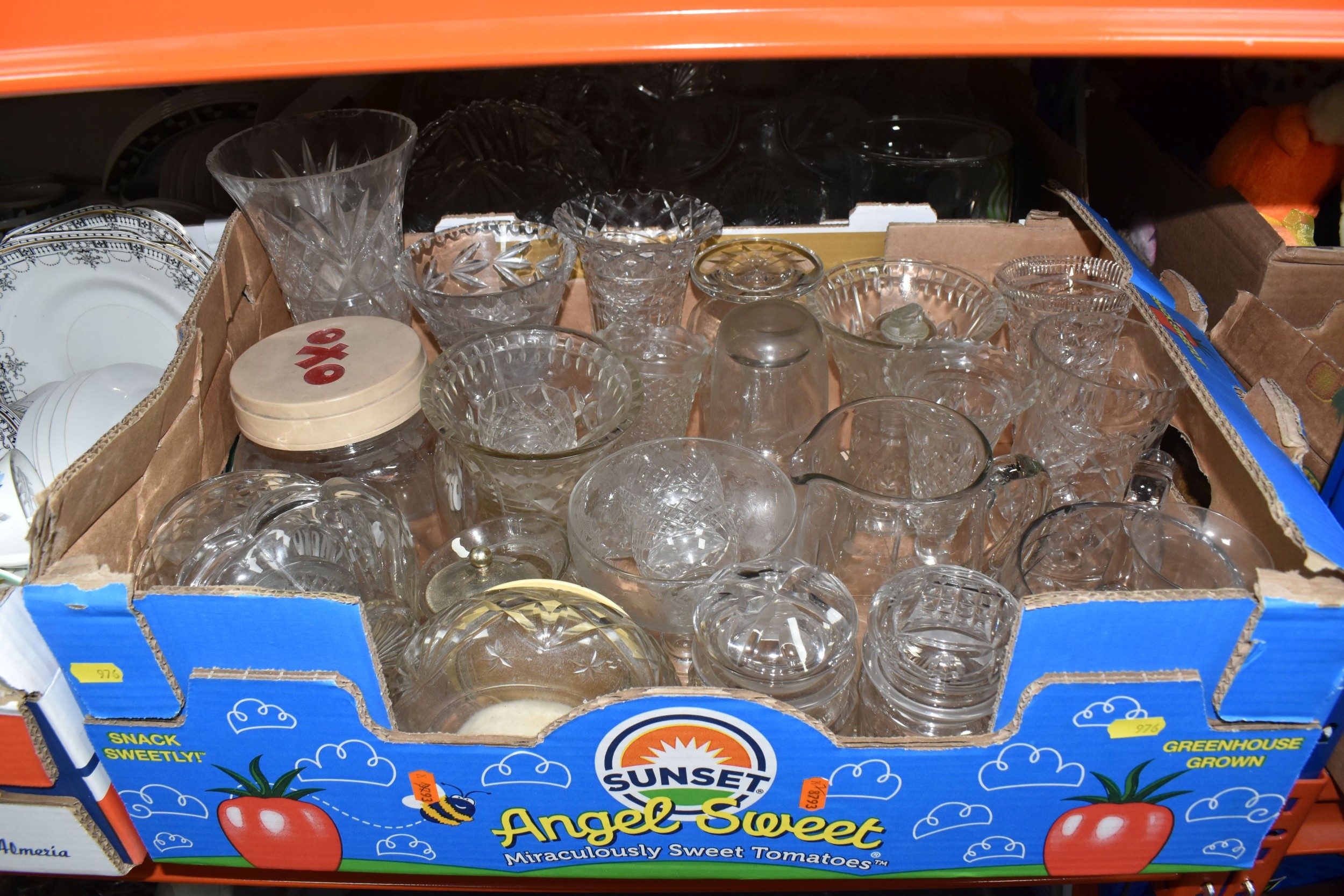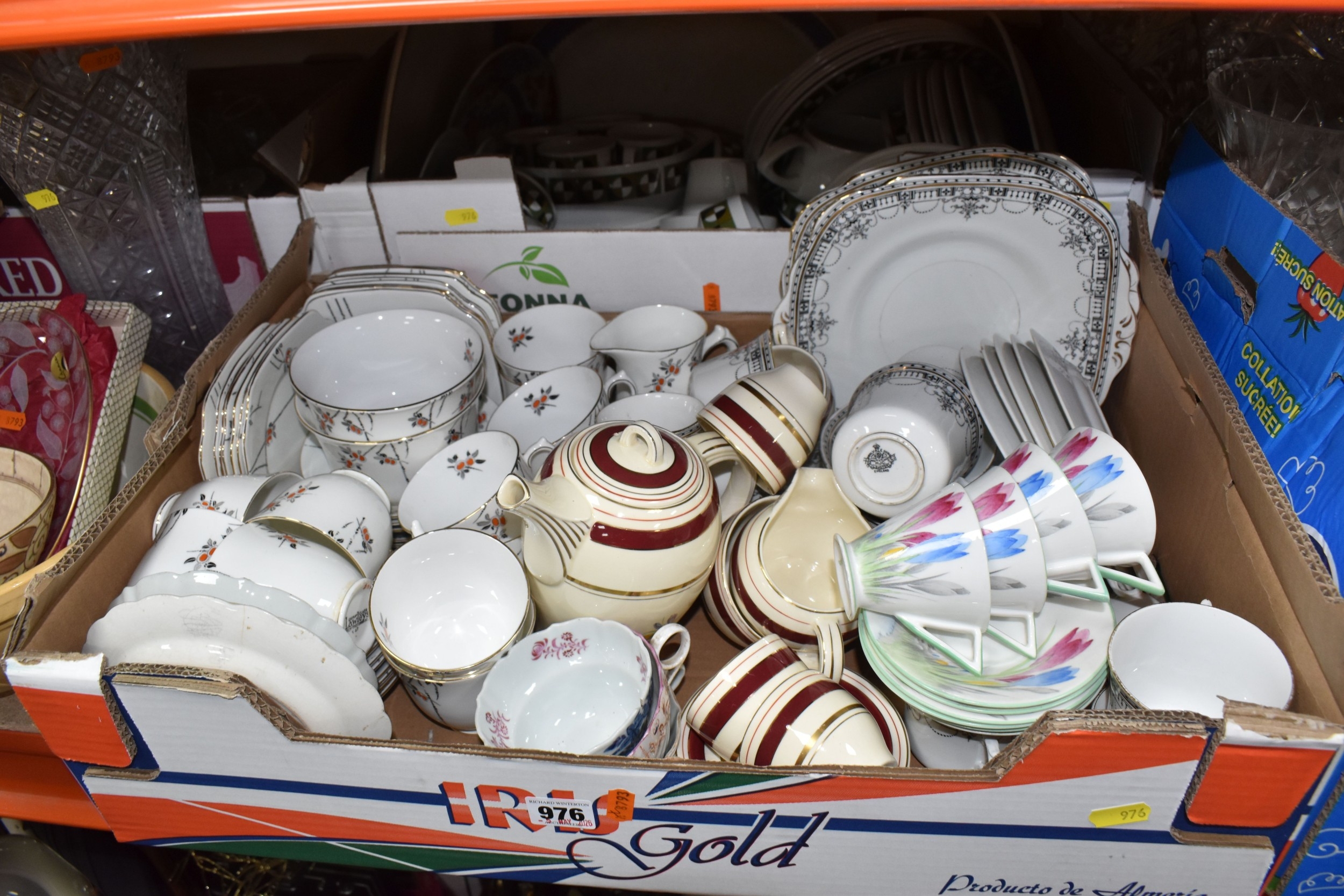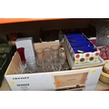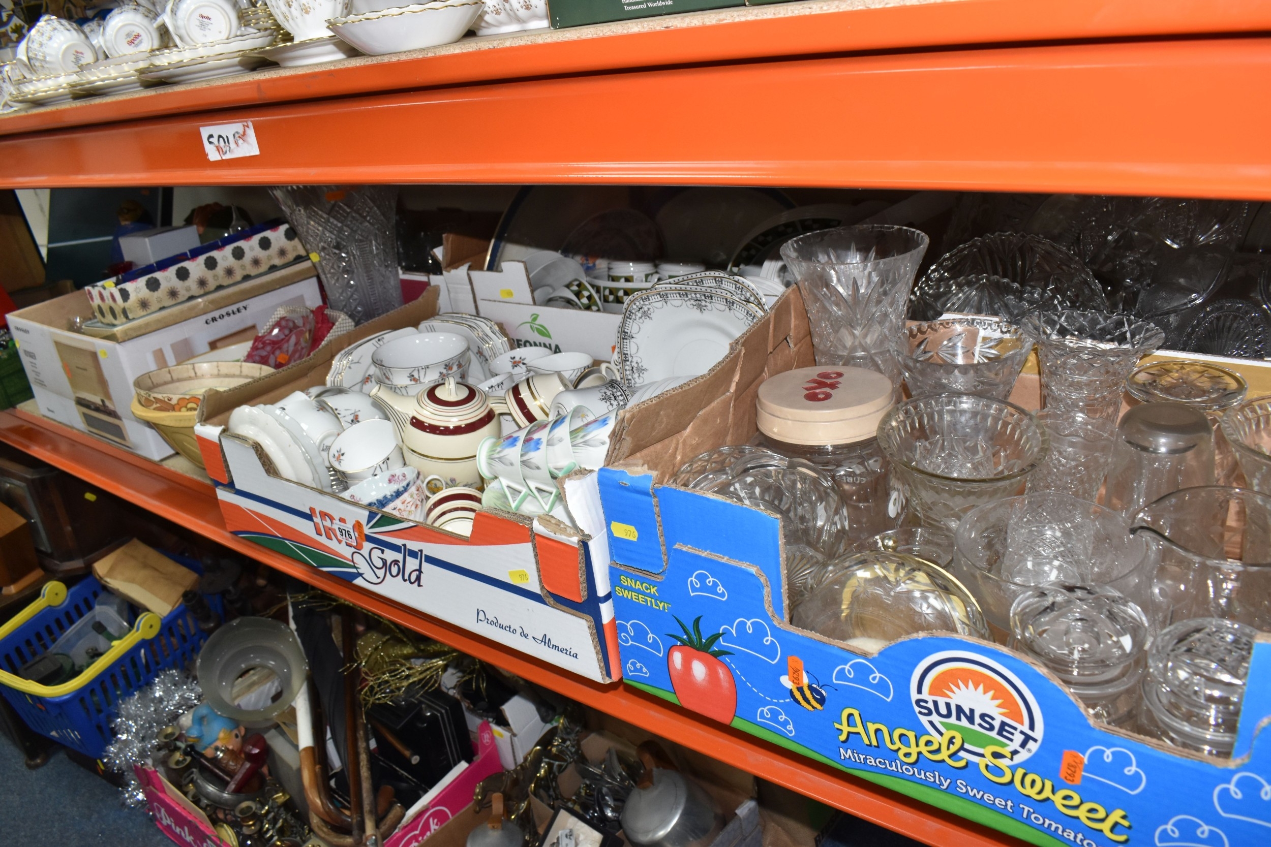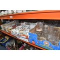 SIX BOXES AND LOOSE CERAMICS AND GLASS to include a box of part tea sets comprising manufacturers Shelley, Lawleys, Woods, etc including cups, saucers, slop bowls, etc, a box of mostly Woods 'Alpine White' dinnerware comprising bowls, plates, cups, saucers, etc, four boxes of assorted glassware to include various wine, aperitif, and coupe glasses, a quantity of assorted vases, trays, etc (6 boxes and loose) (s.d)