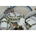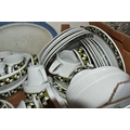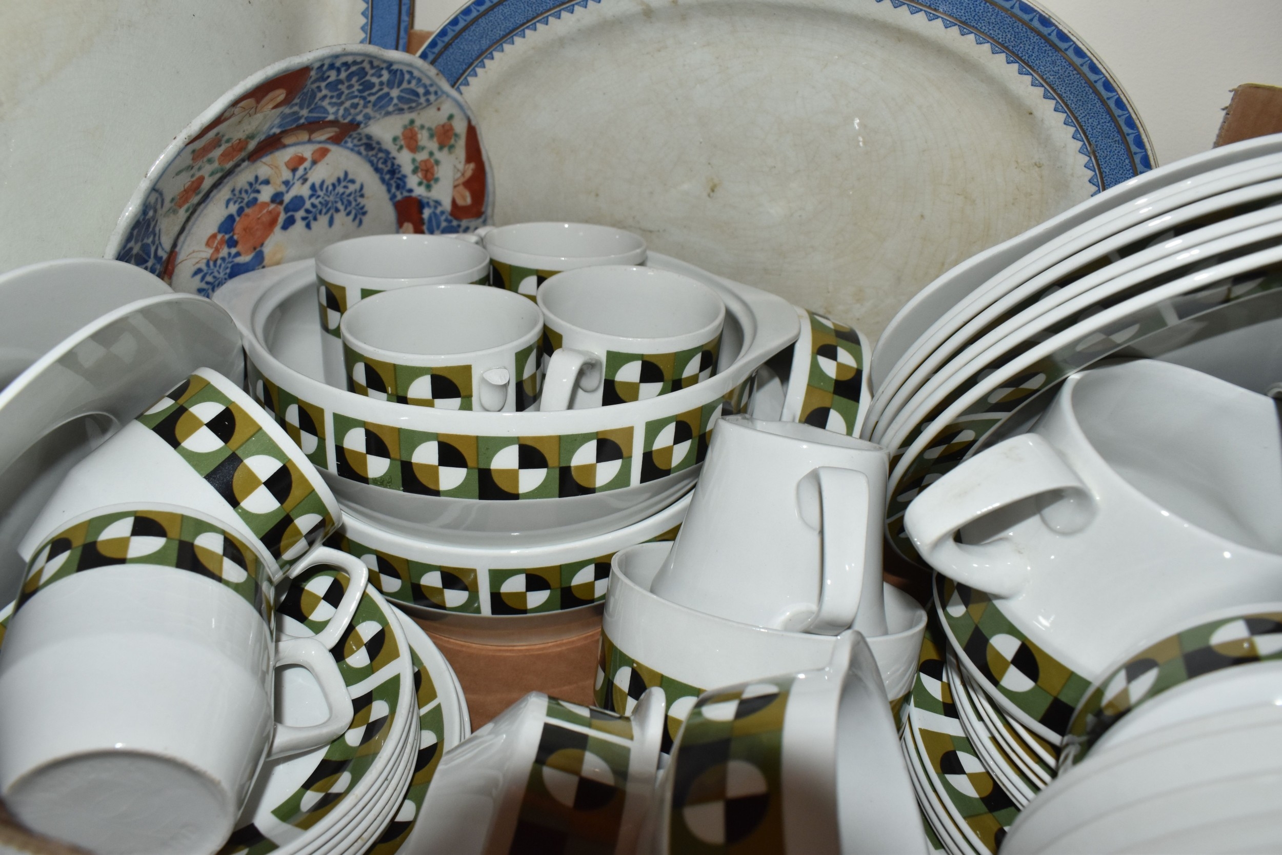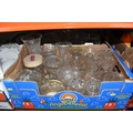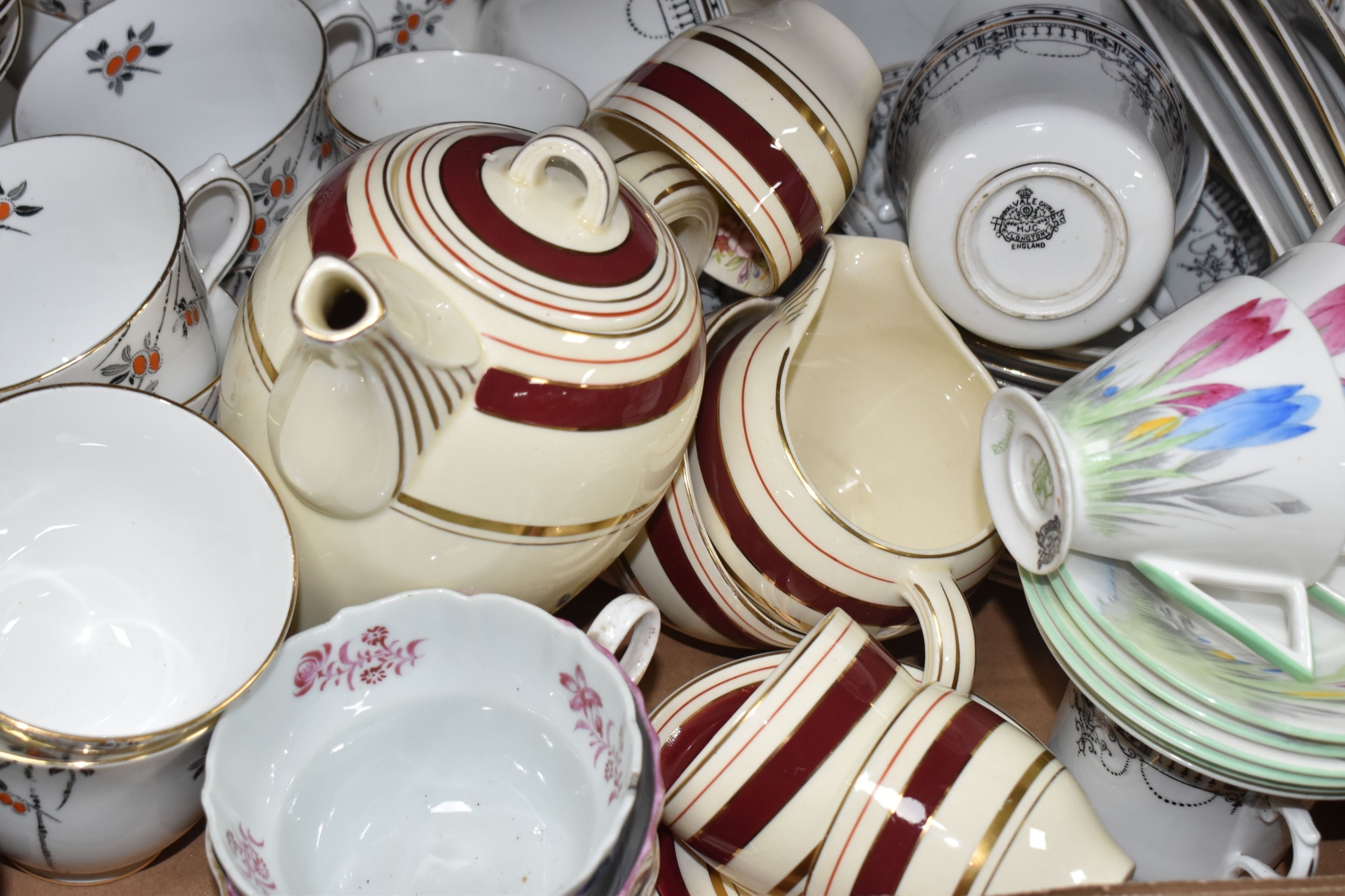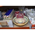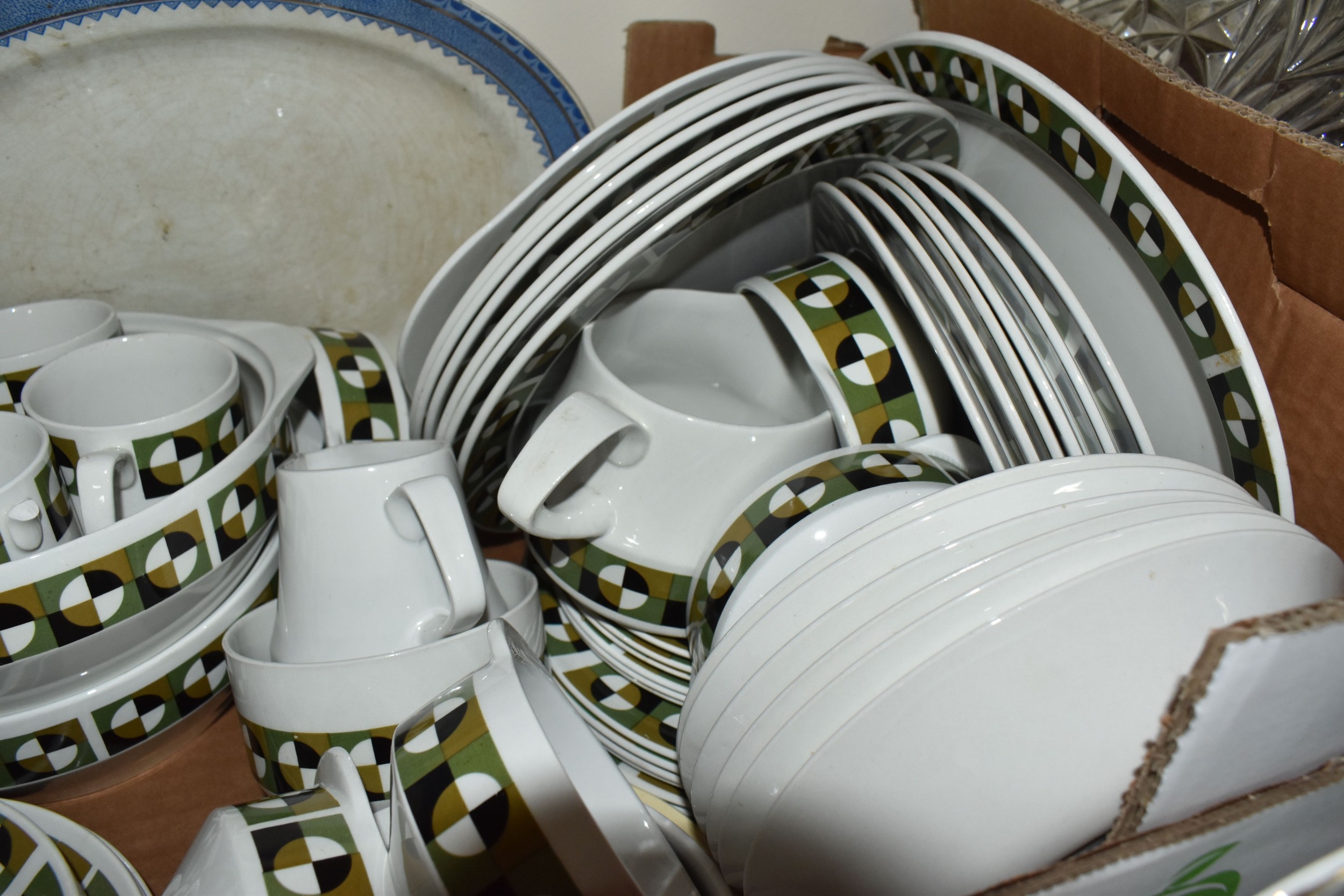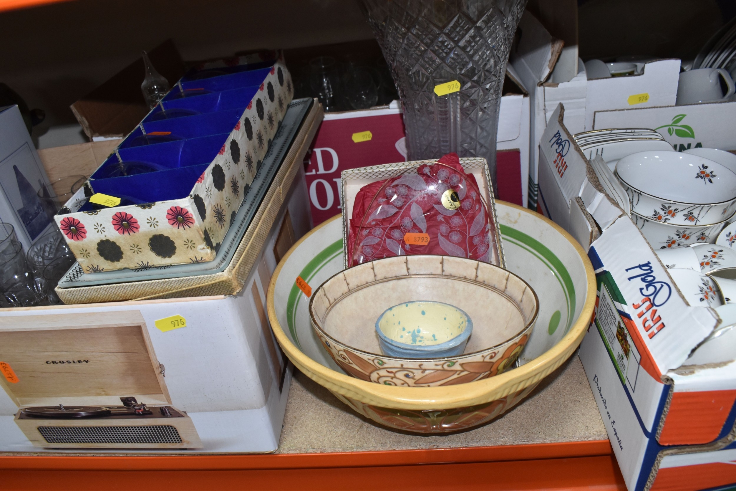 SIX BOXES AND LOOSE CERAMICS AND GLASS to include a box of part tea sets comprising manufacturers Shelley, Lawleys, Woods, etc including cups, saucers, slop bowls, etc, a box of mostly Woods 'Alpine White' dinnerware comprising bowls, plates, cups, saucers, etc, four boxes of assorted glassware to include various wine, aperitif, and coupe glasses, a quantity of assorted vases, trays, etc (6 boxes and loose) (s.d)