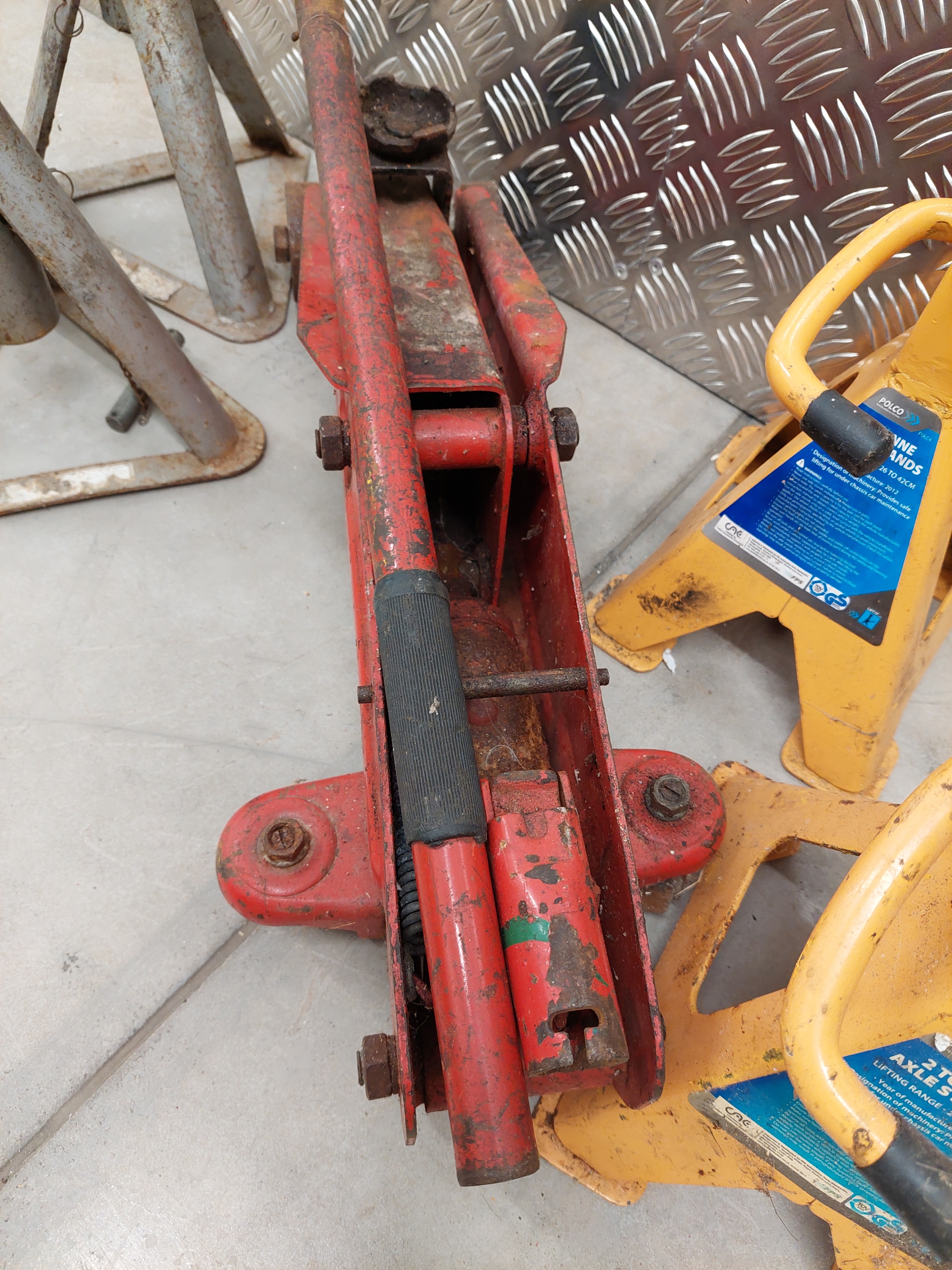 A vintage trolley jack possibly 2 tonne, together with 2 pairs of axle stands.